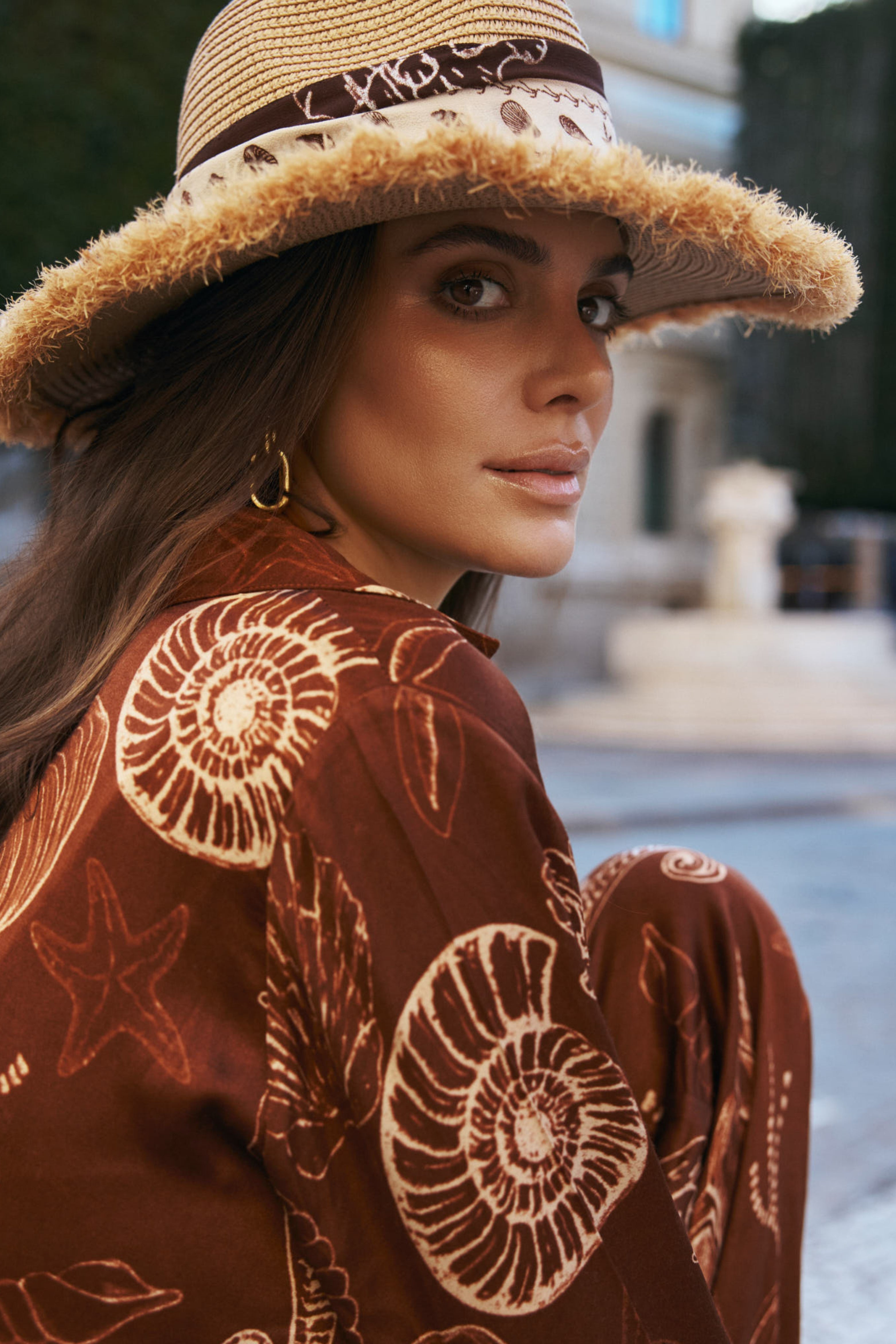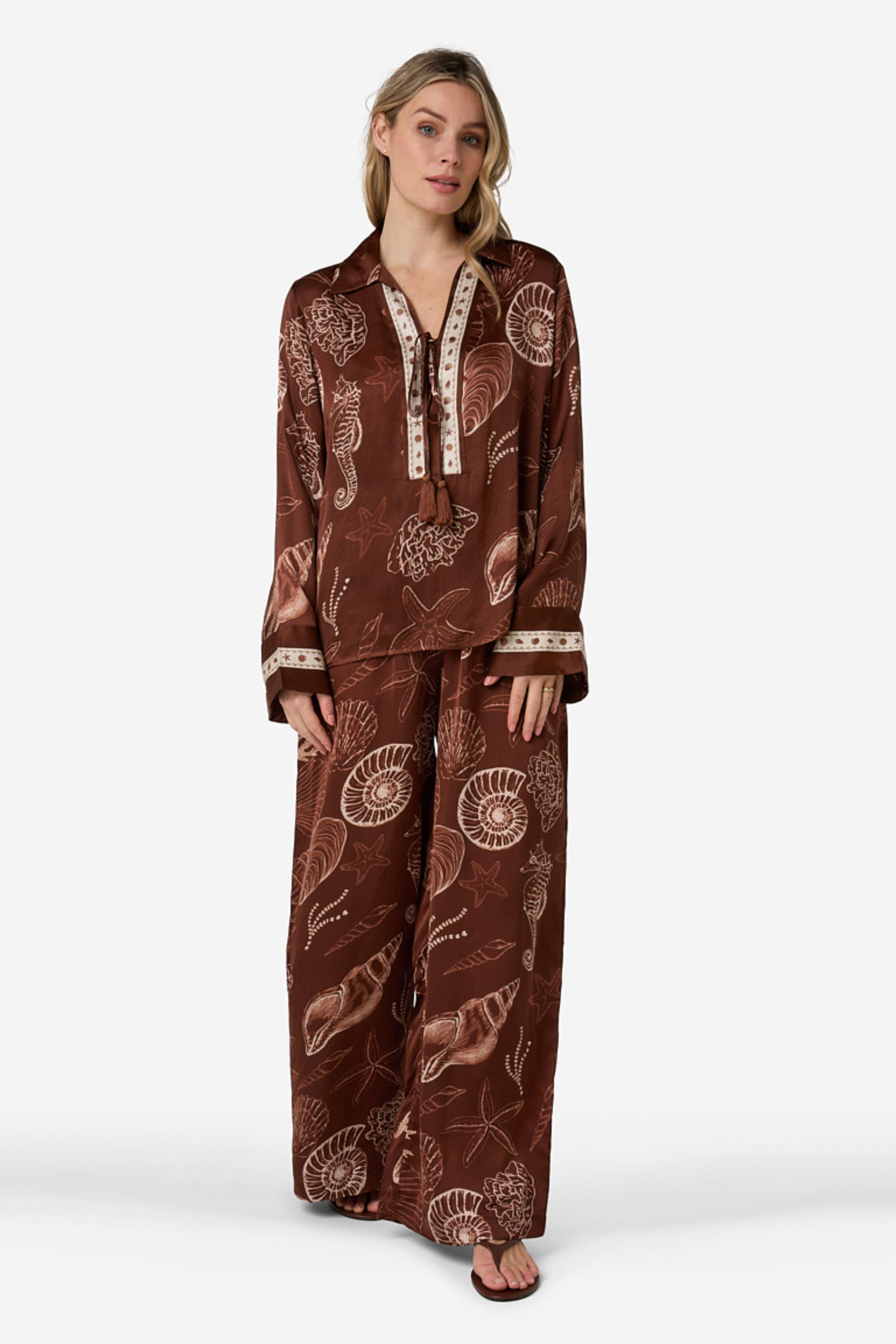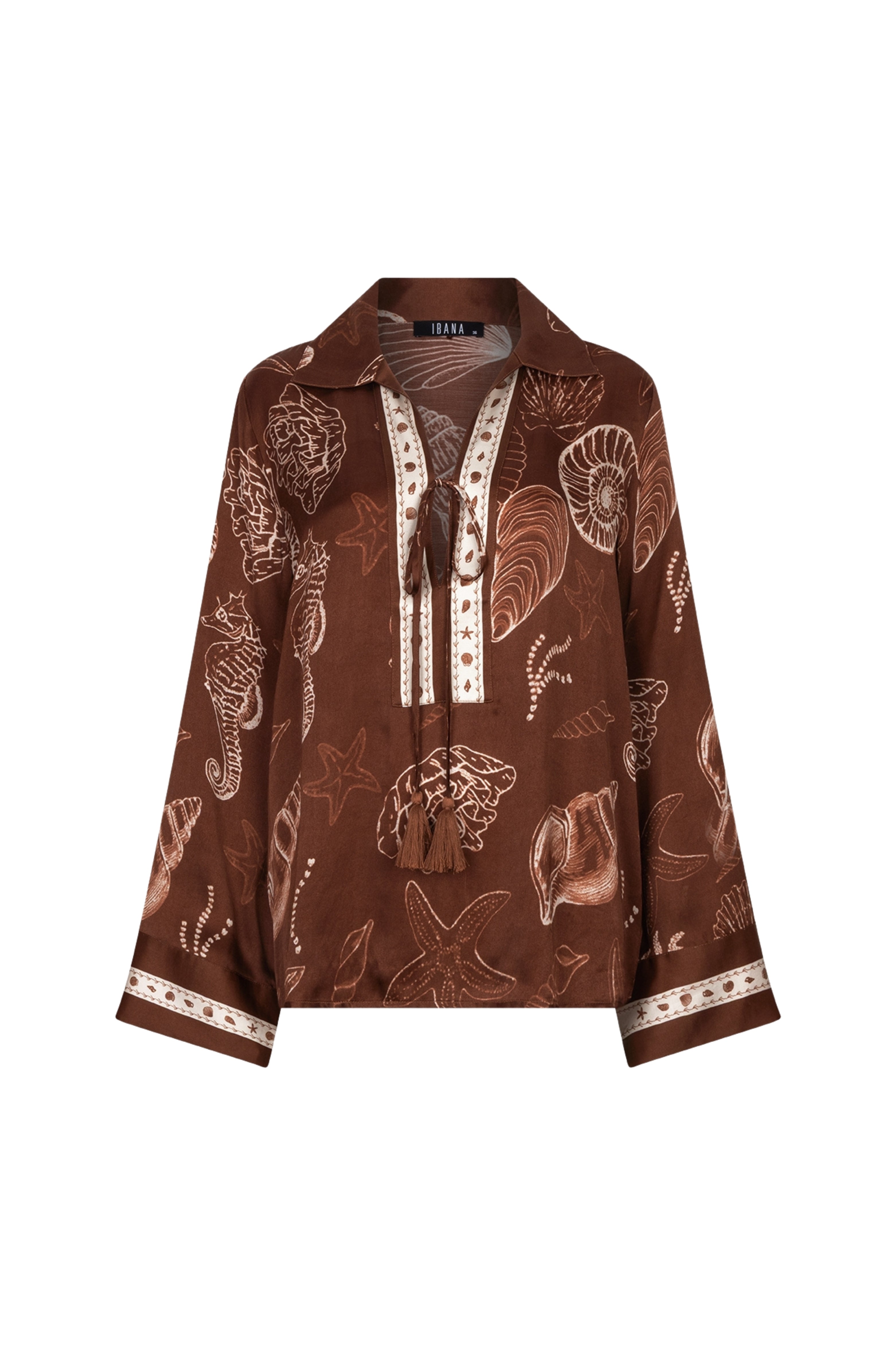 De Blouse Tarya Shell Marrón van Ibana is een elegante blouse met een rijke schelpenprint en bohemian details. De soepele stof, decoratieve bies en striksluiting met kwastjes geven deze blouse een stijlvolle, zomerse uitstraling.