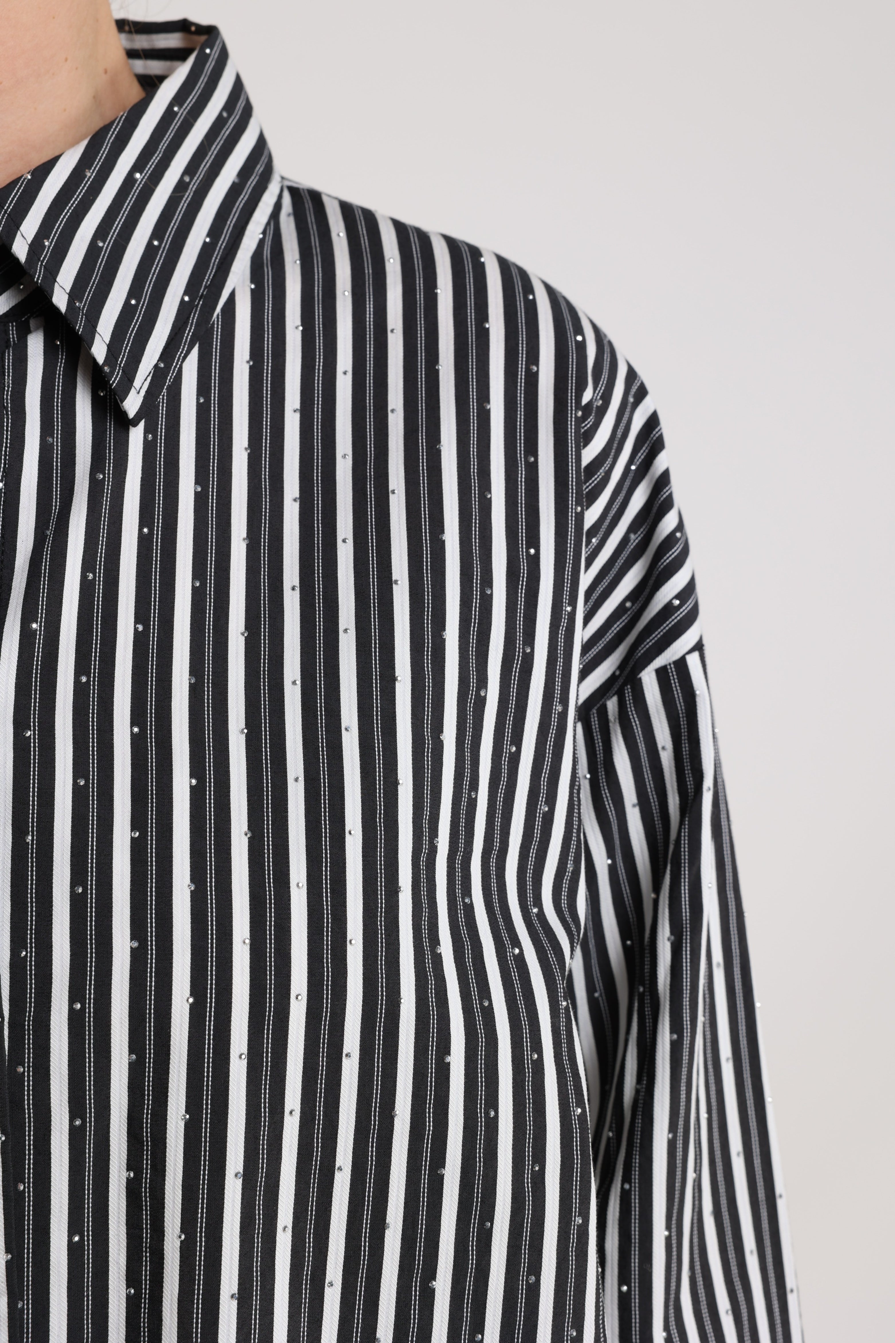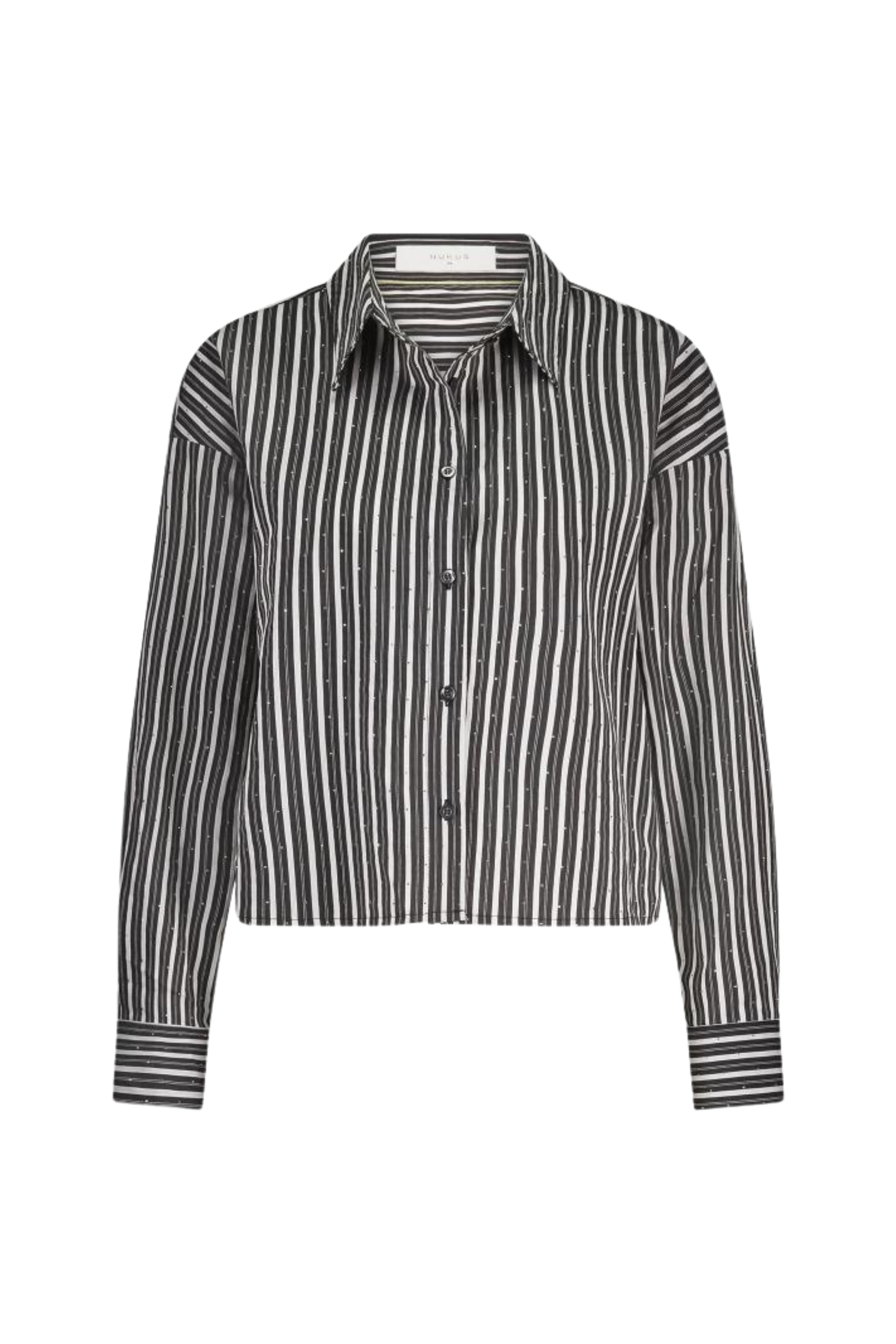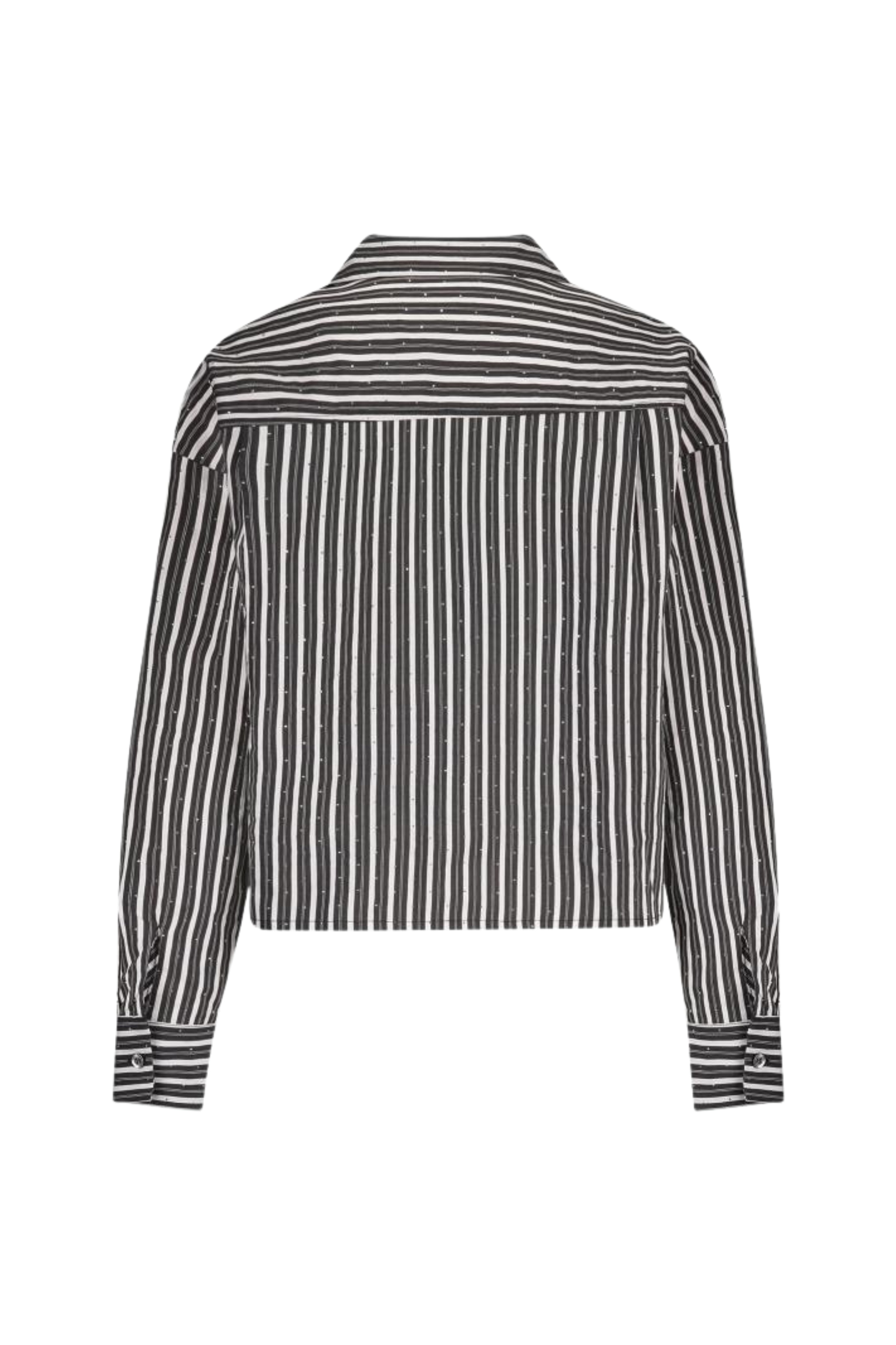 De Blouse Tessa van Nukus in Offwhite Black combineert een klassieke streepprint met subtiele strassdetails. Dankzij de regular fit en katoenen mix is dit een comfortabele en stijlvolle blouse die moeiteloos chic oogt.