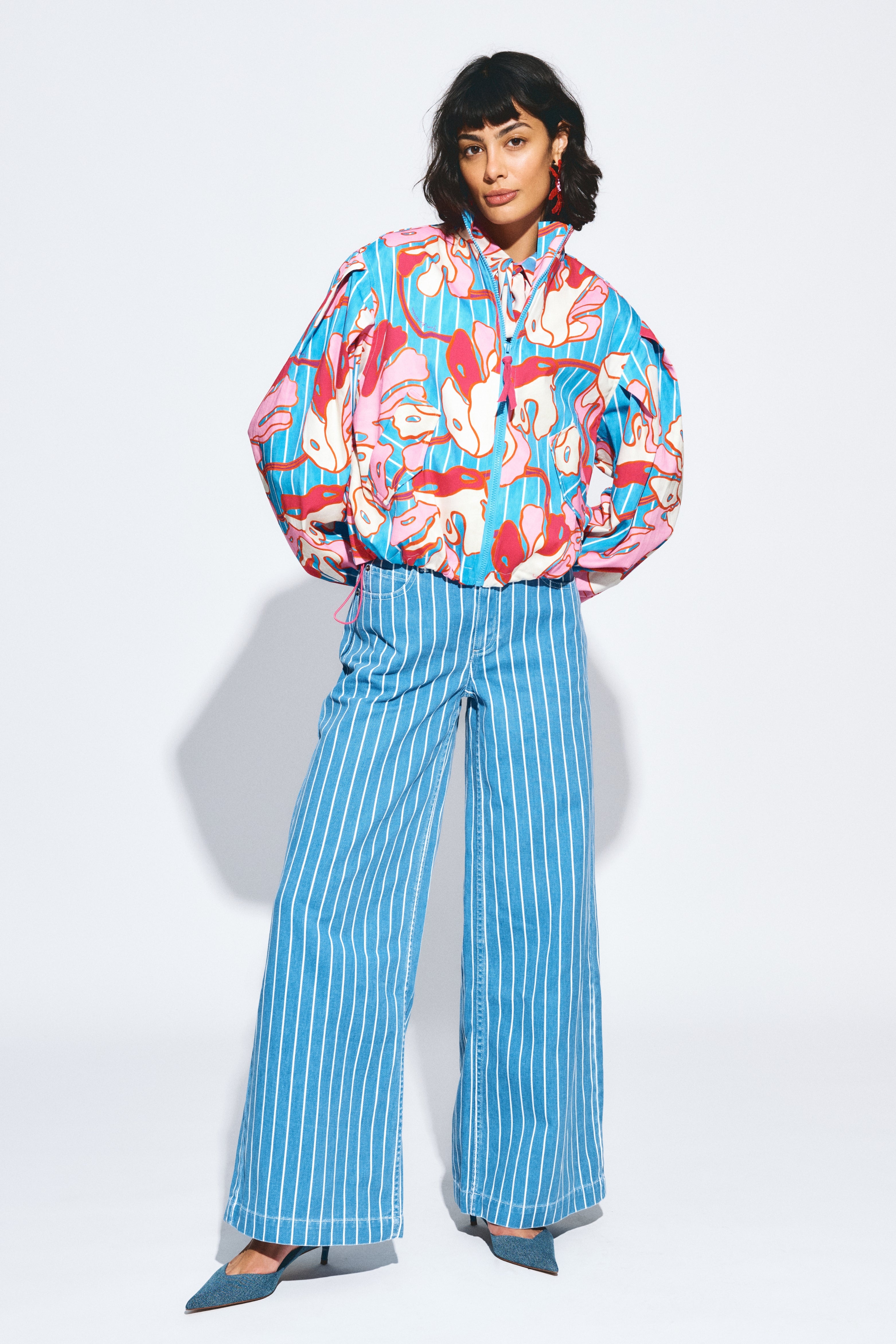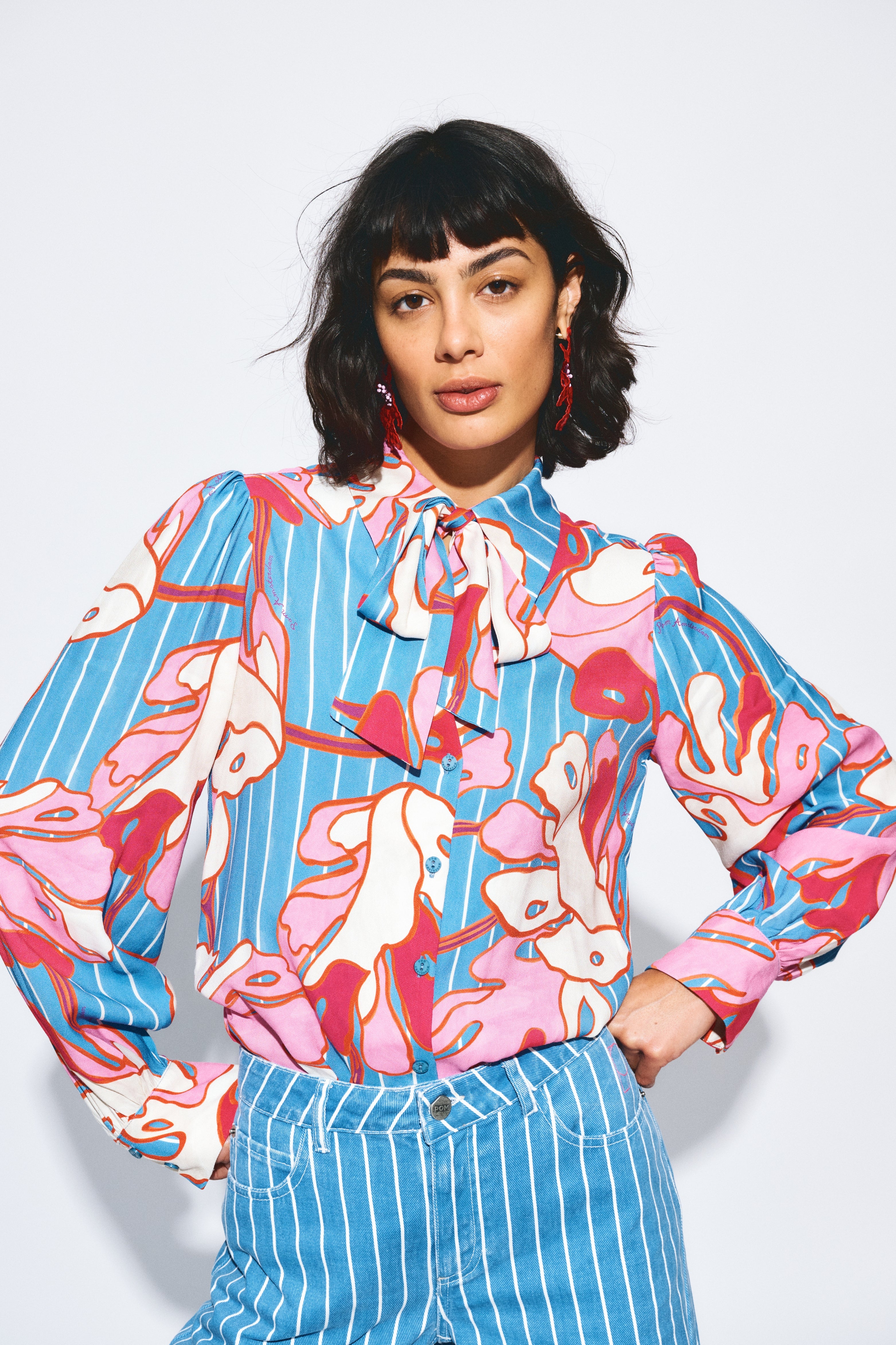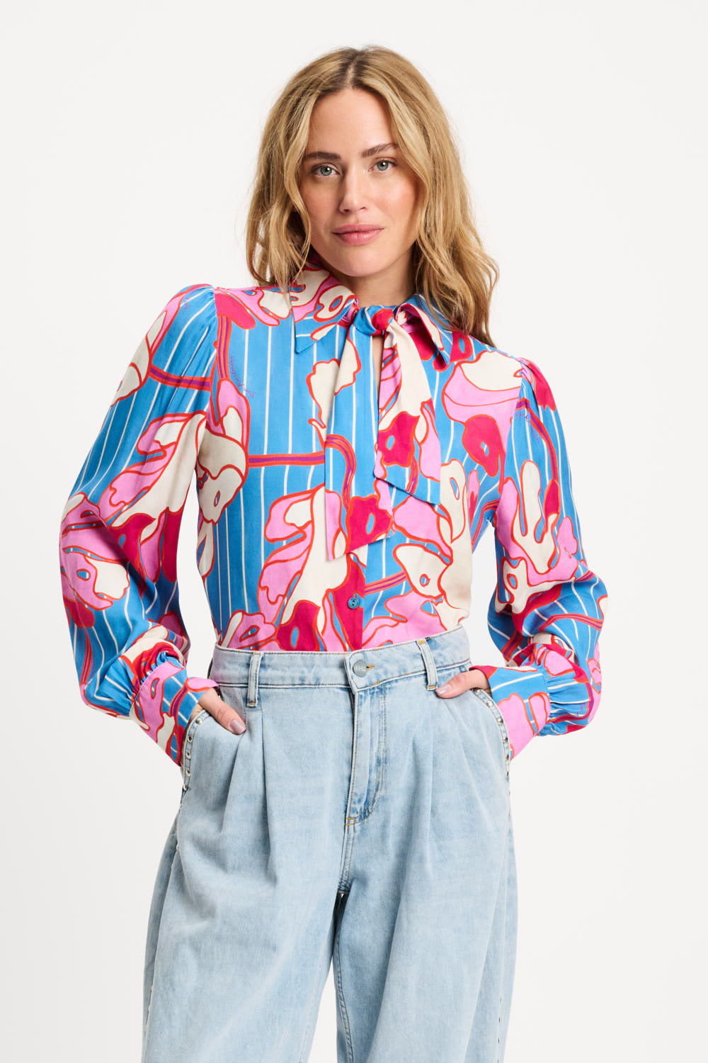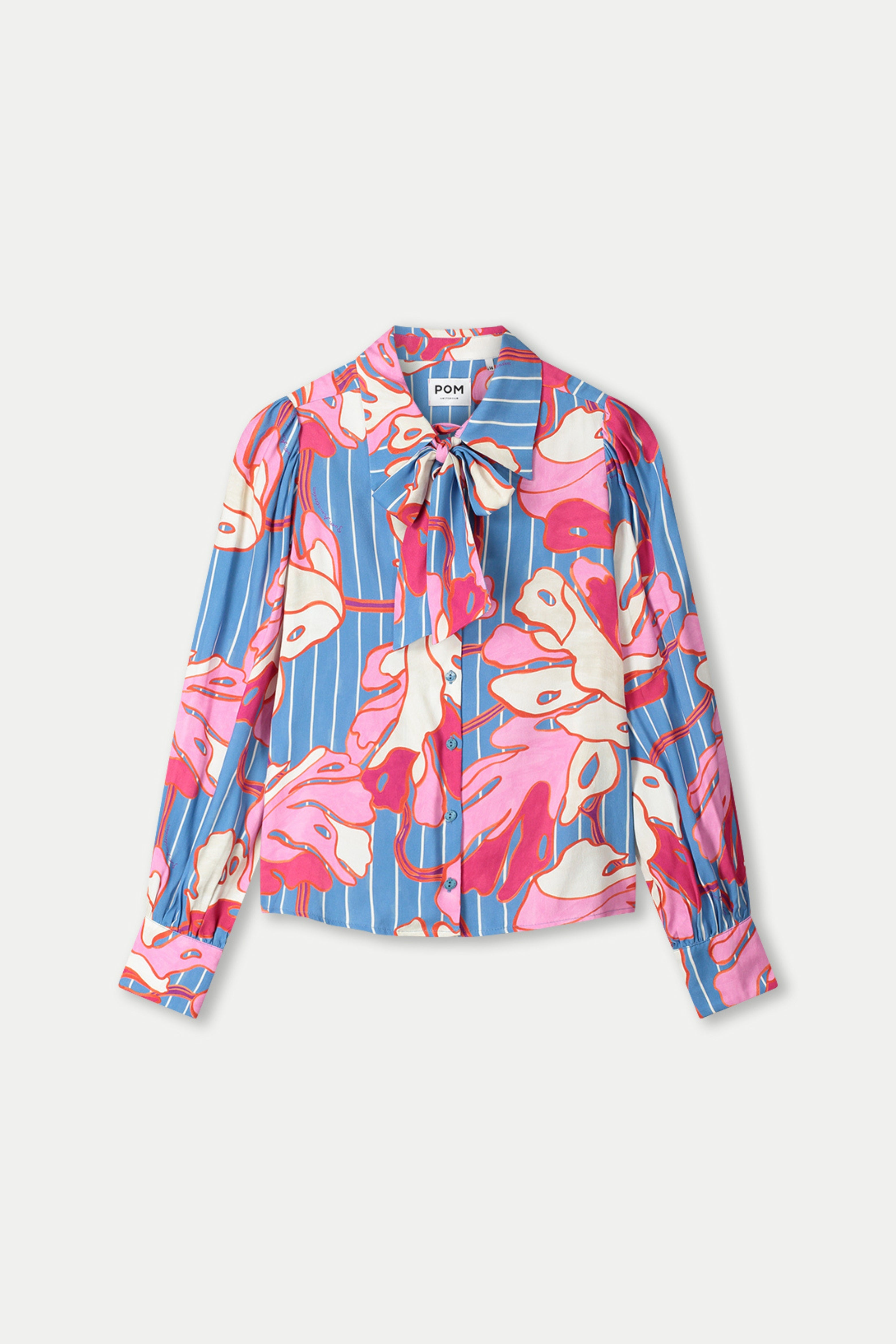 De Blouse Urban Flora Stripe Multi Colour van POM Amsterdam is een kleurrijke blouse met blauwe strepen, een roze-witte bloemenprint en een strikdetail bij de hals. Een speels, kleurrijk model dat elke outfit meteen laat opvallen.