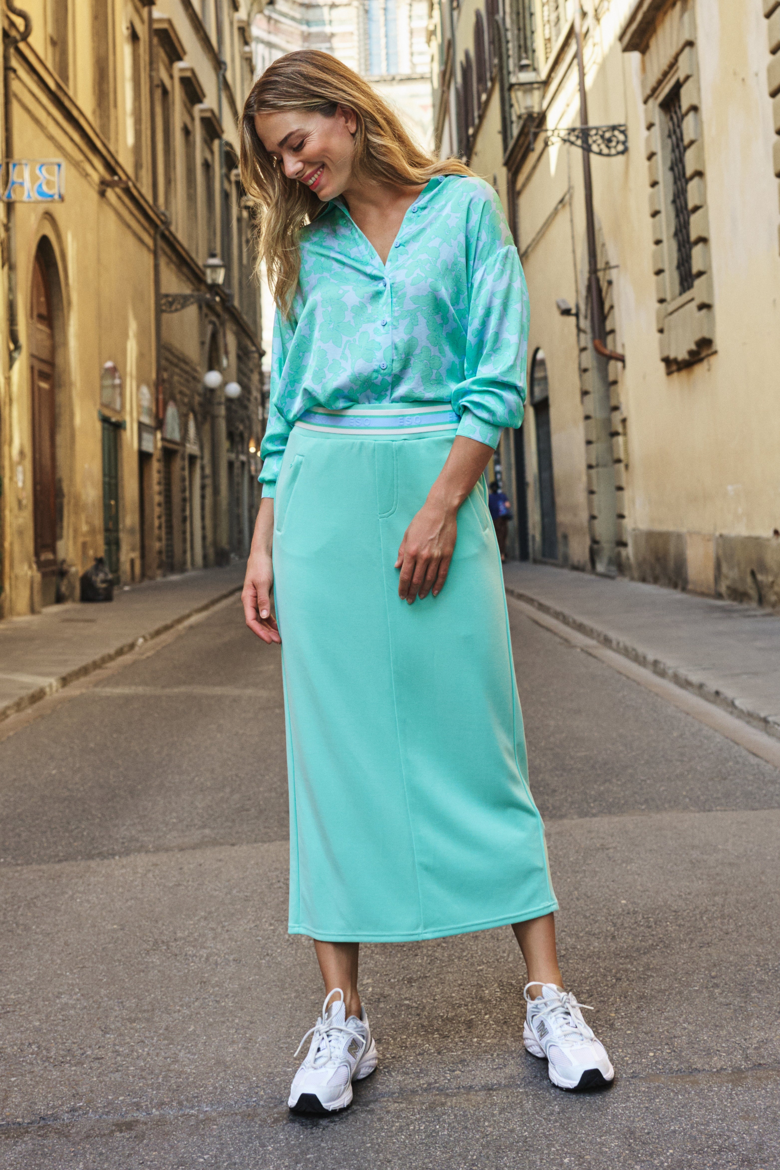 • Het ecom model is 175 cm, het campagne model is 173 cm, beiden dragen maat S