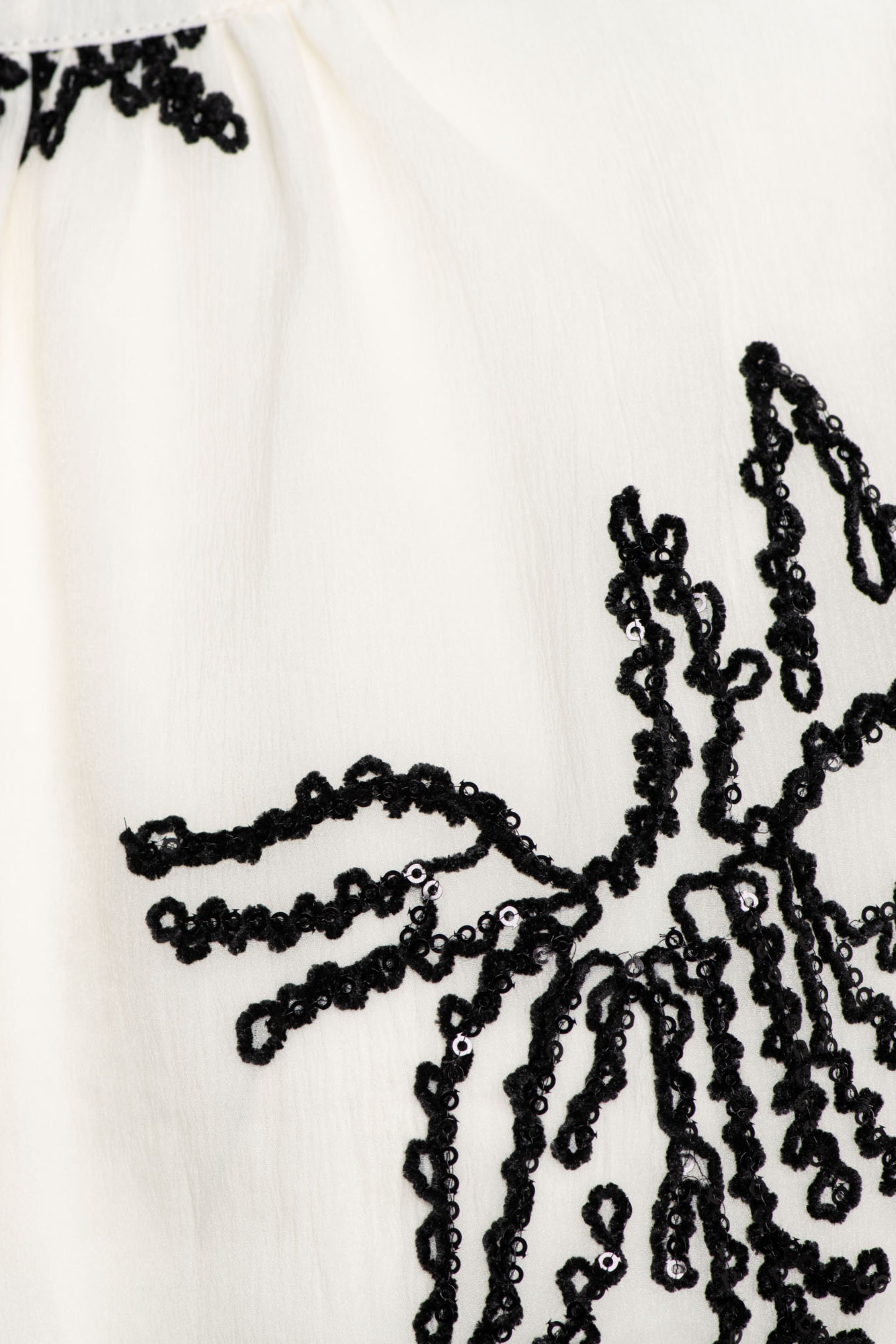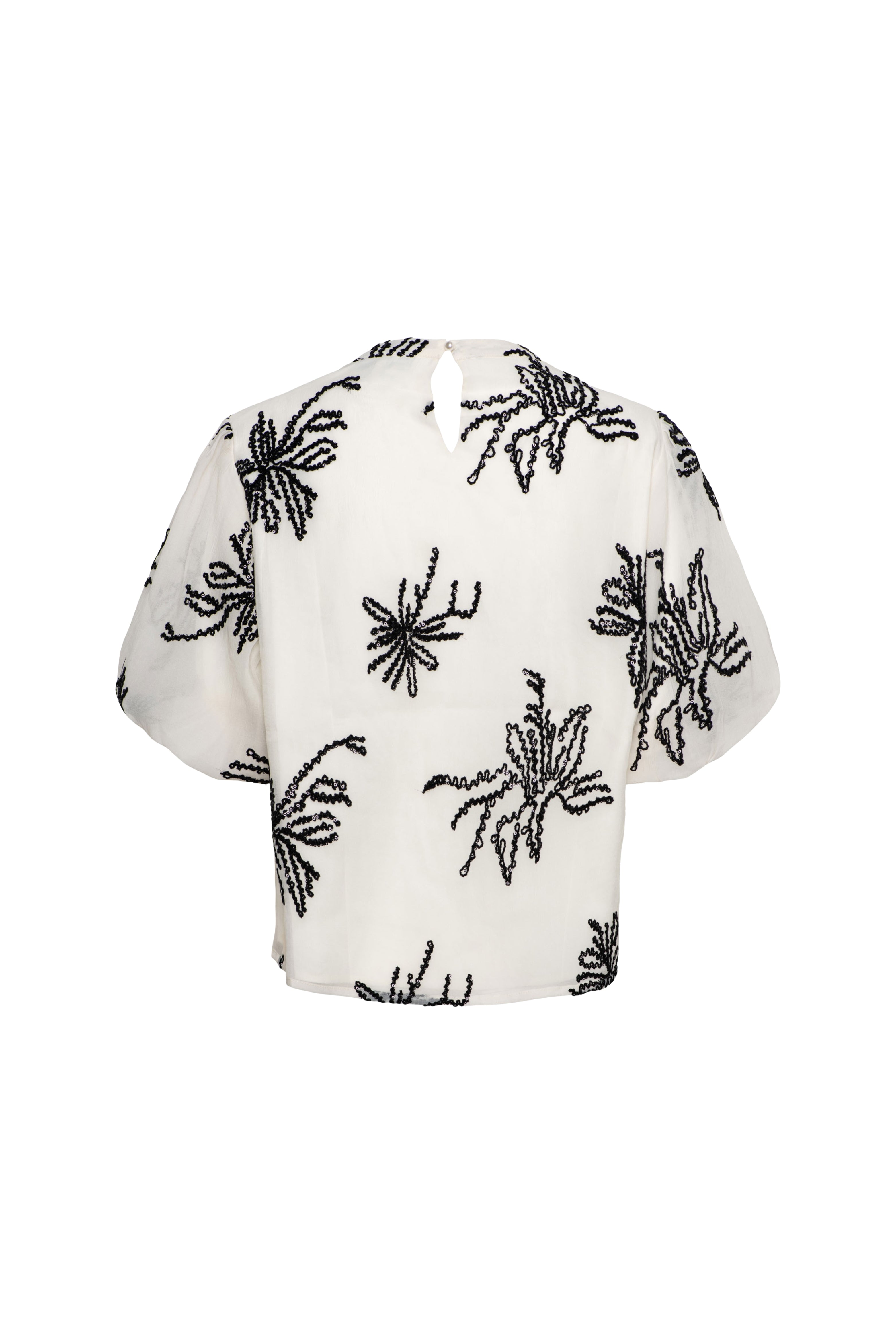 Blouse Wyanne Beige is een elegante eyecatcher met verfijnde zwarte borduursels. De luchtige, semi-transparante stof en de volumineuze korte mouwen geven deze blouse een speelse en vrouwelijke uitstraling. De ronde hals met subtiele plooien zorgt voor een zachte, chique afwerking