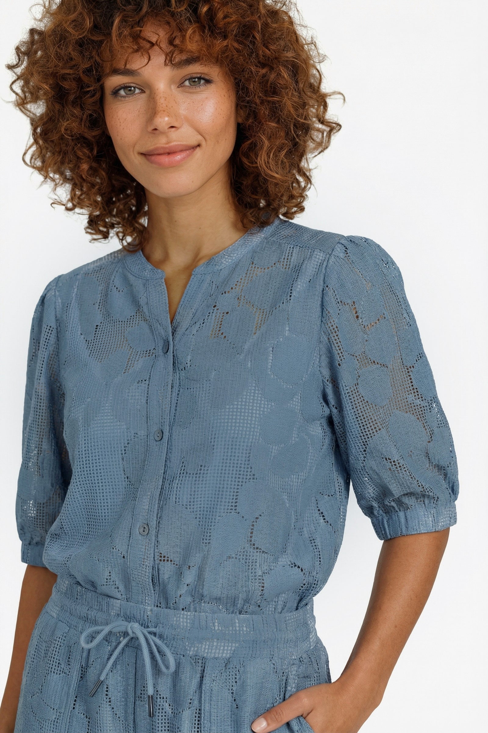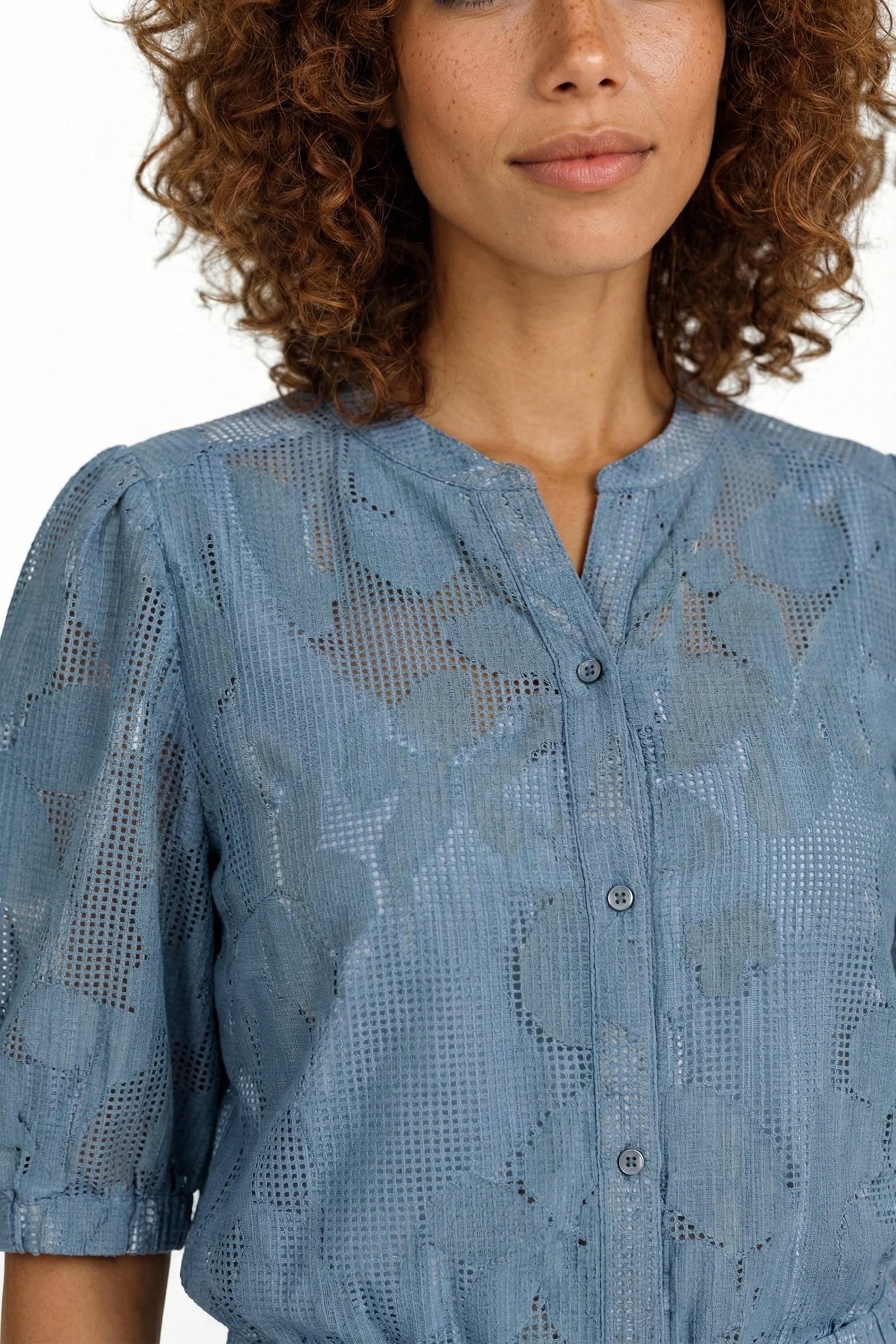 De Blouse Ylfa Light Denim Blue van G-maxx is een stijlvolle blouse in een zachte jeansblauwe tint met een subtiel dessin. De pofmouwen en verfijnde afwerking geven de blouse een vrouwelijke en moderne uitstraling.