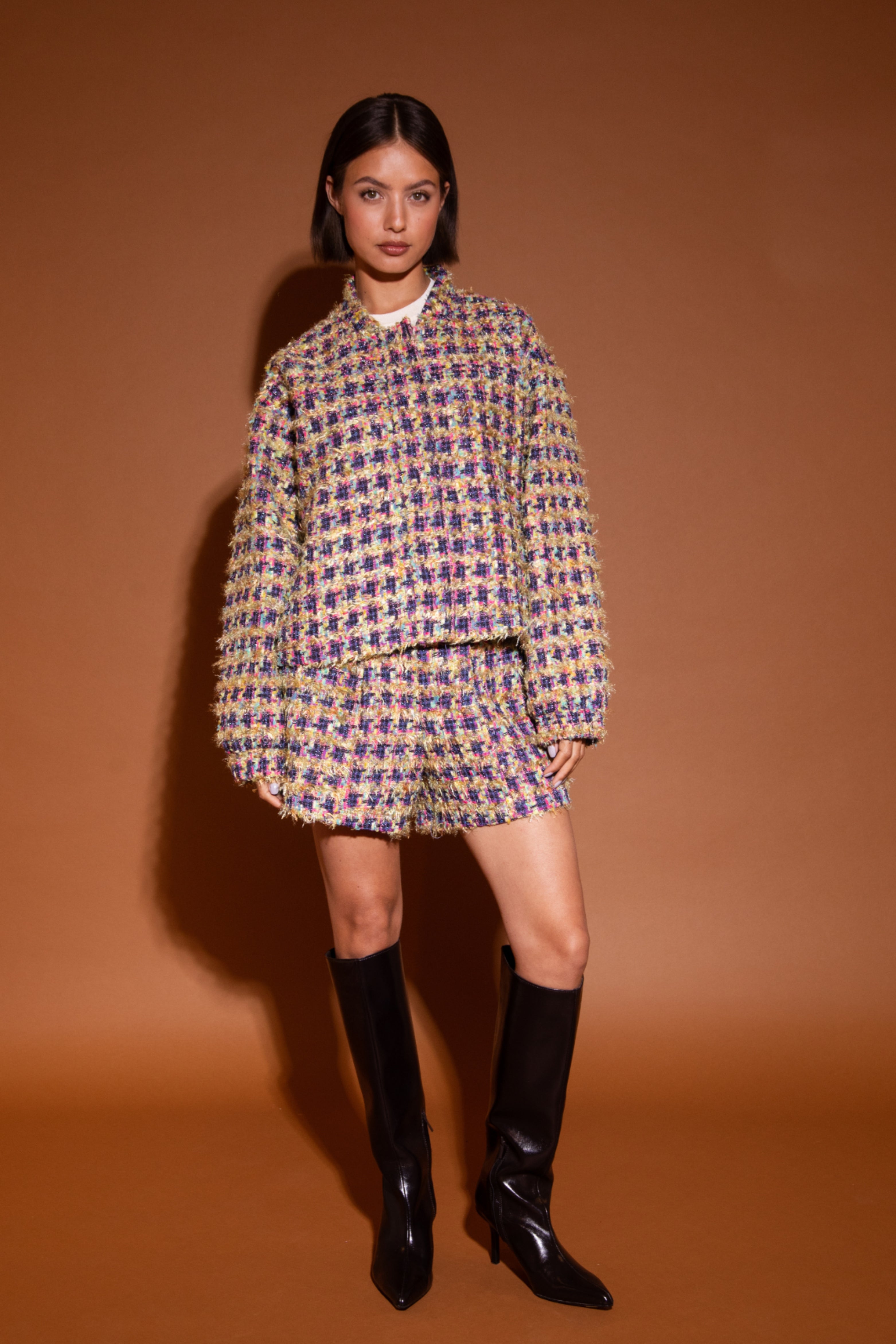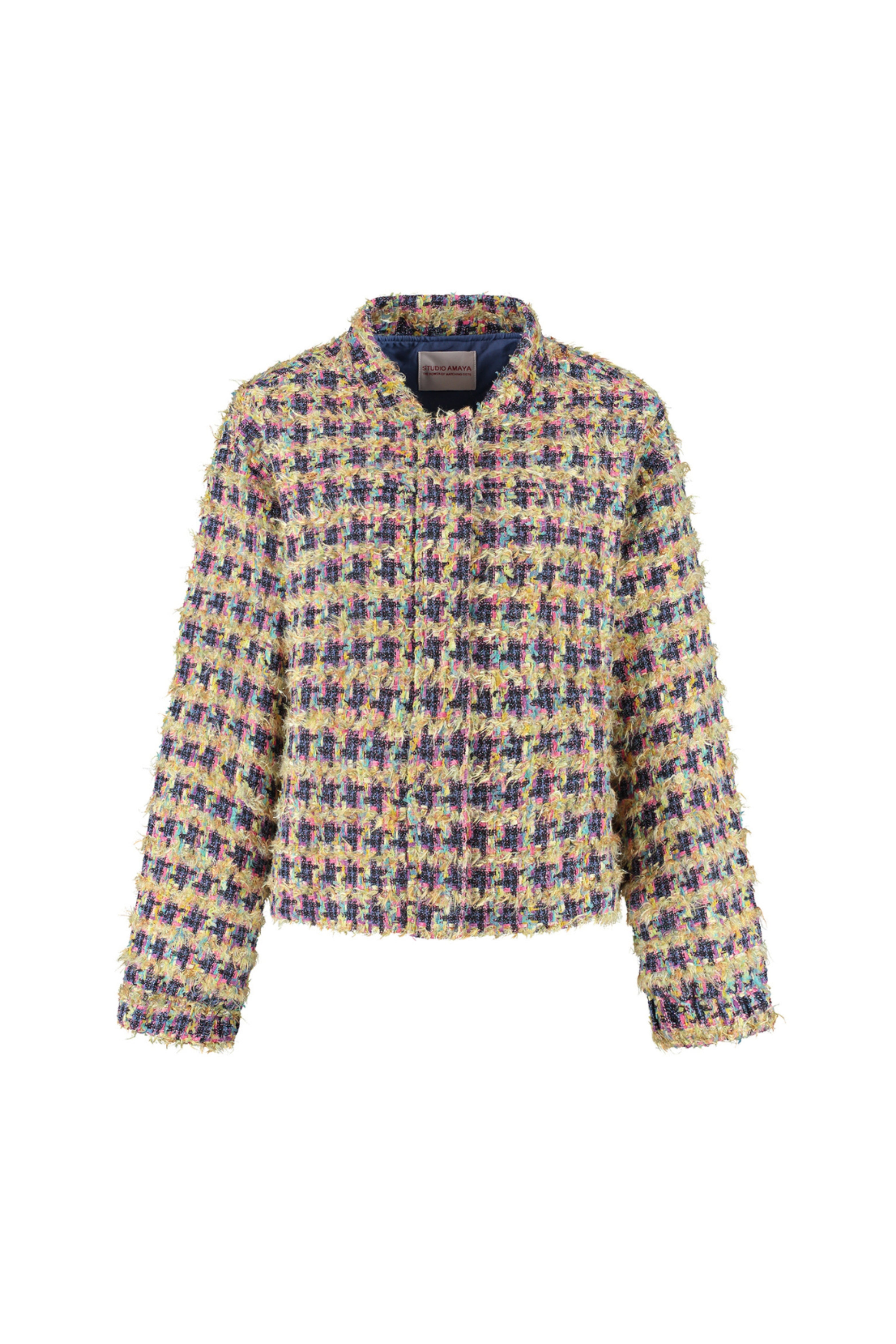 De Bomber Fleur Multi Print van Studio Amaya is een opvallend jasje met een luxe boucléstructuur. De mix van kleuren en het subtiele ruitpatroon geven de bomber een trendy en vrouwelijke uitstraling — perfect om elke outfit een stijlvolle boost te geven.