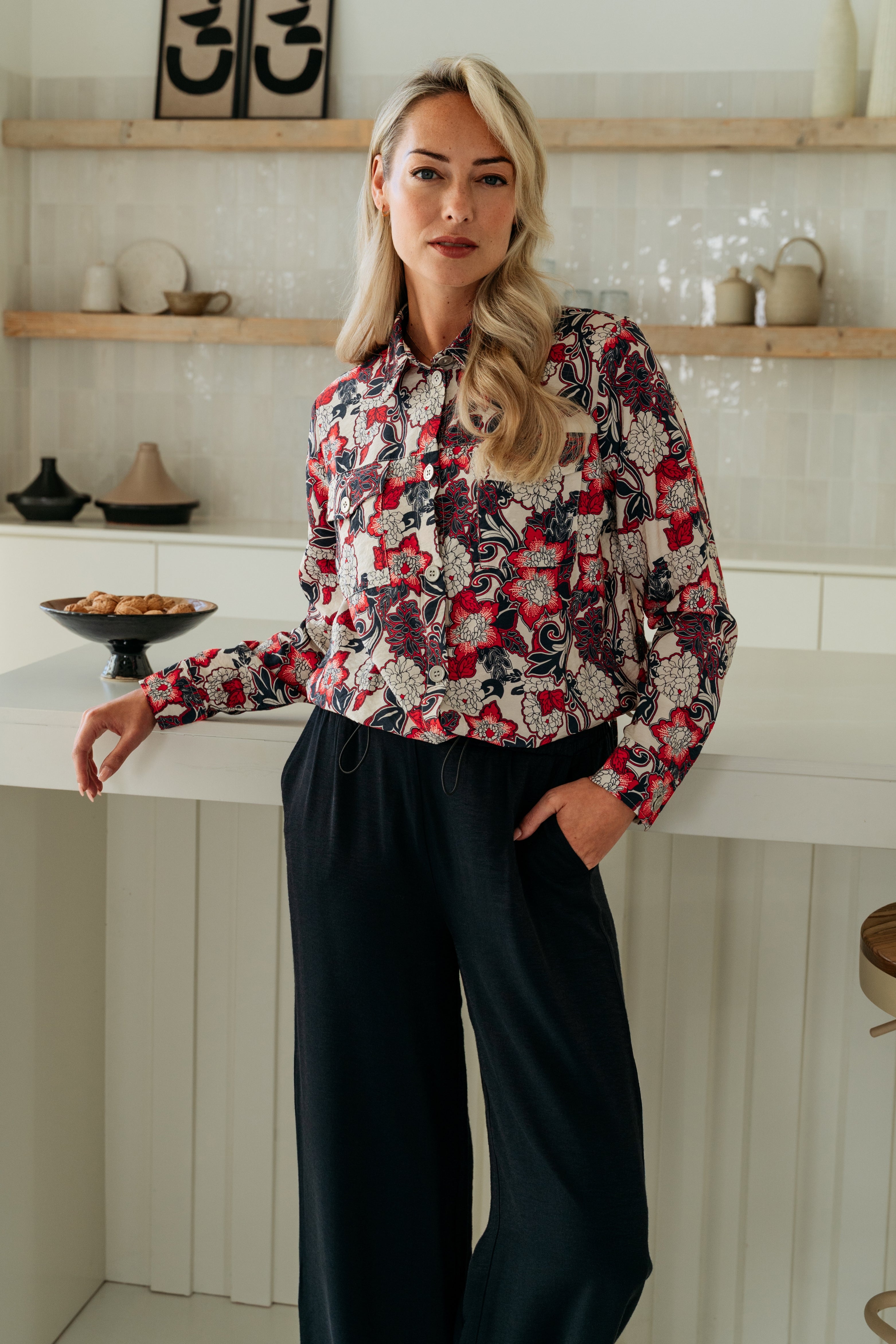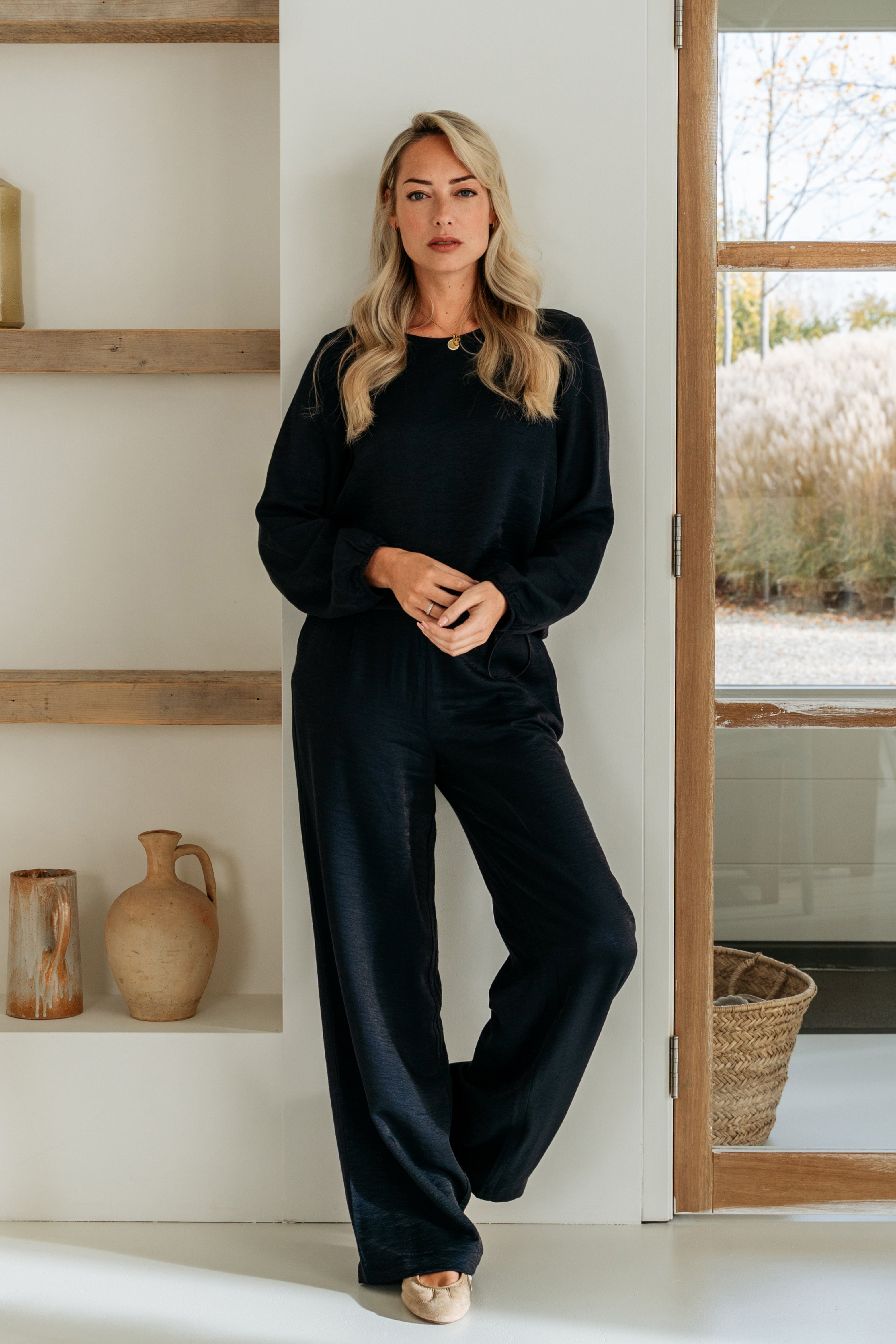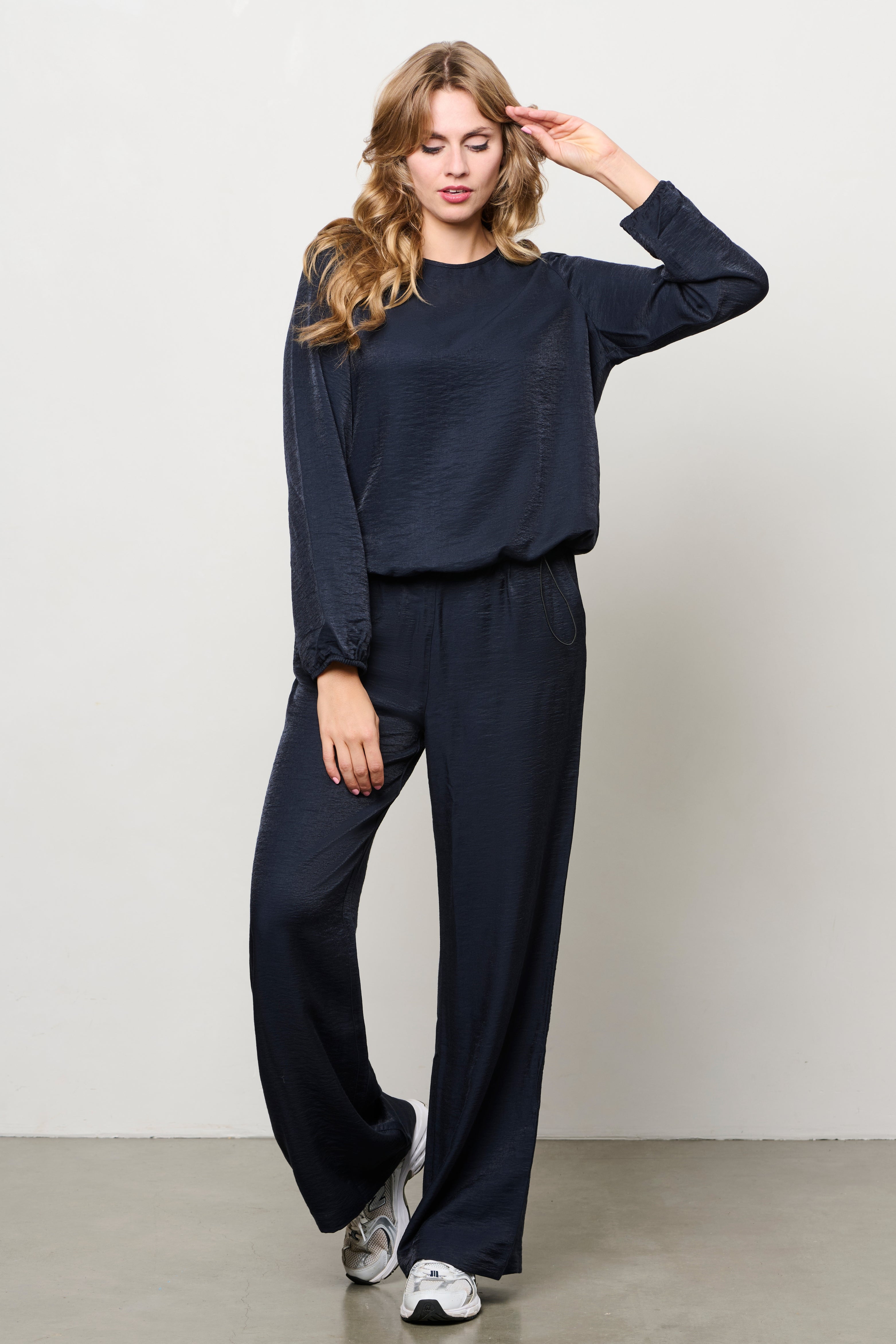 De Broek Abelie Navy van &Co Woman is een stijlvolle wide leg broek met een luxe uitstraling. De elastische tailleband met koord zorgt voor extra draagcomfort en is zowel casual als chic te dragen.