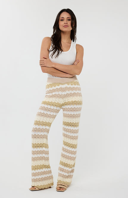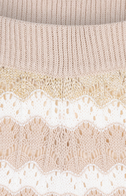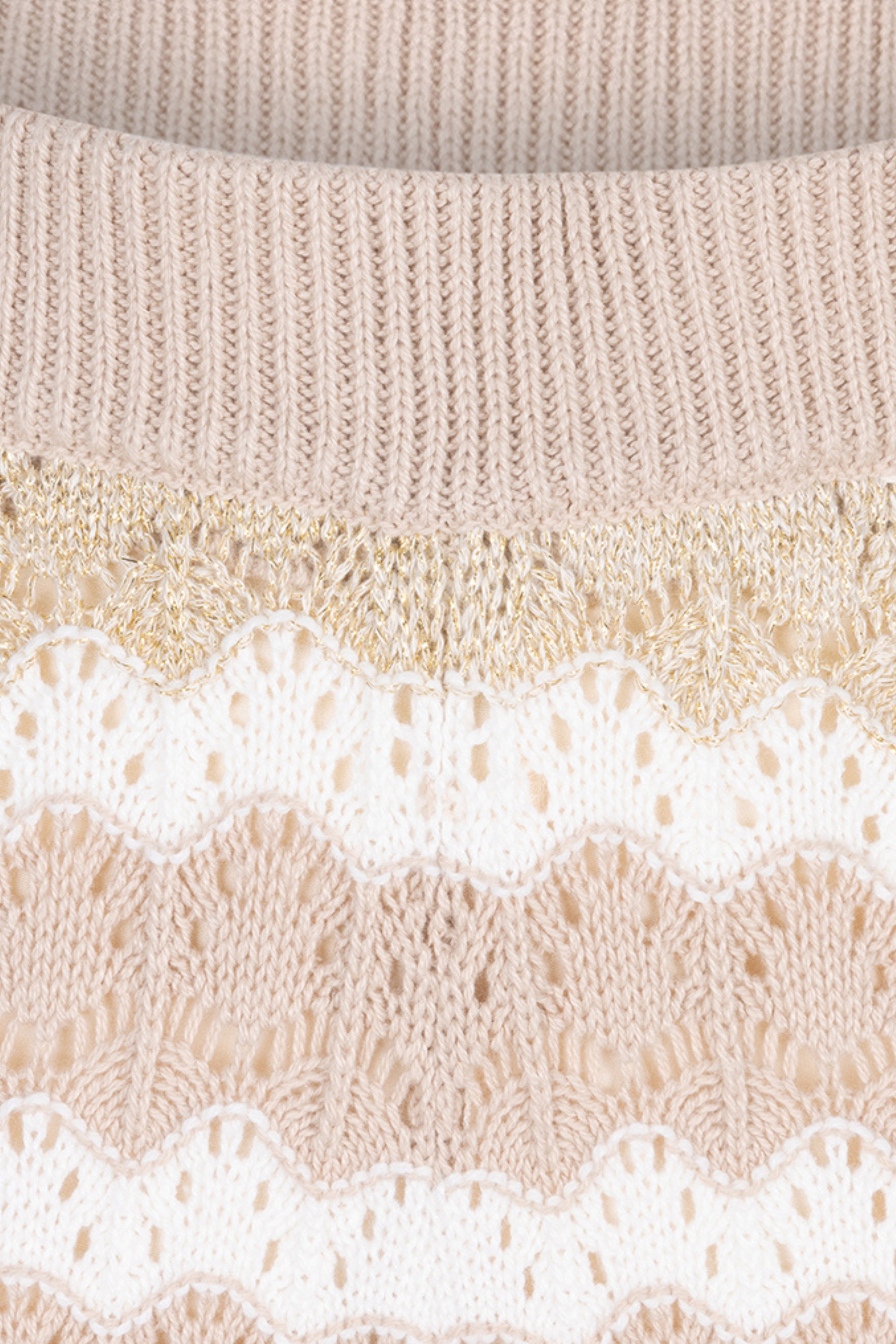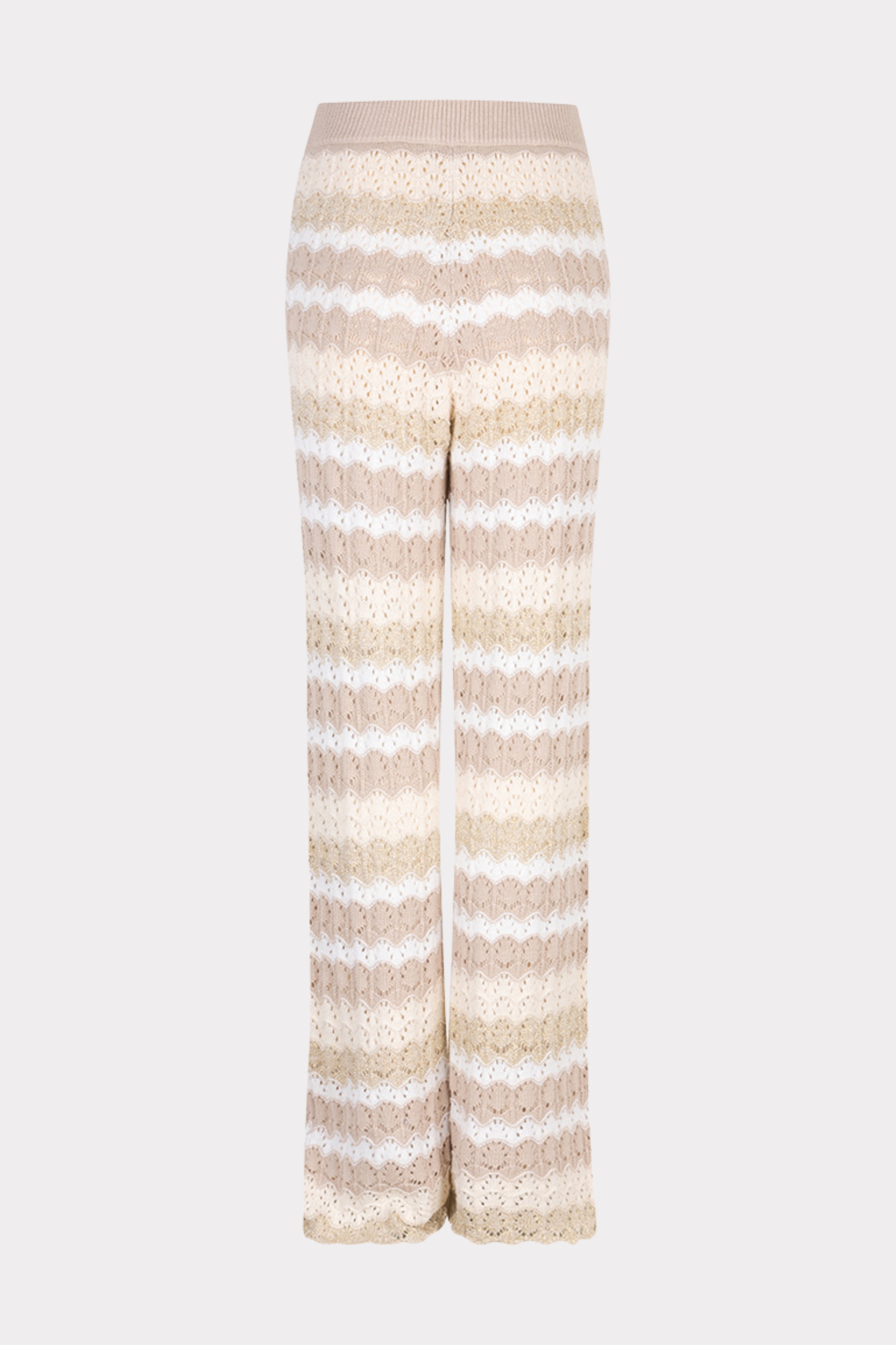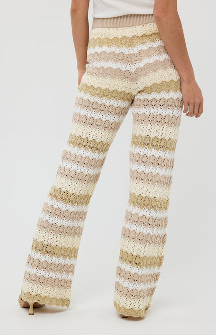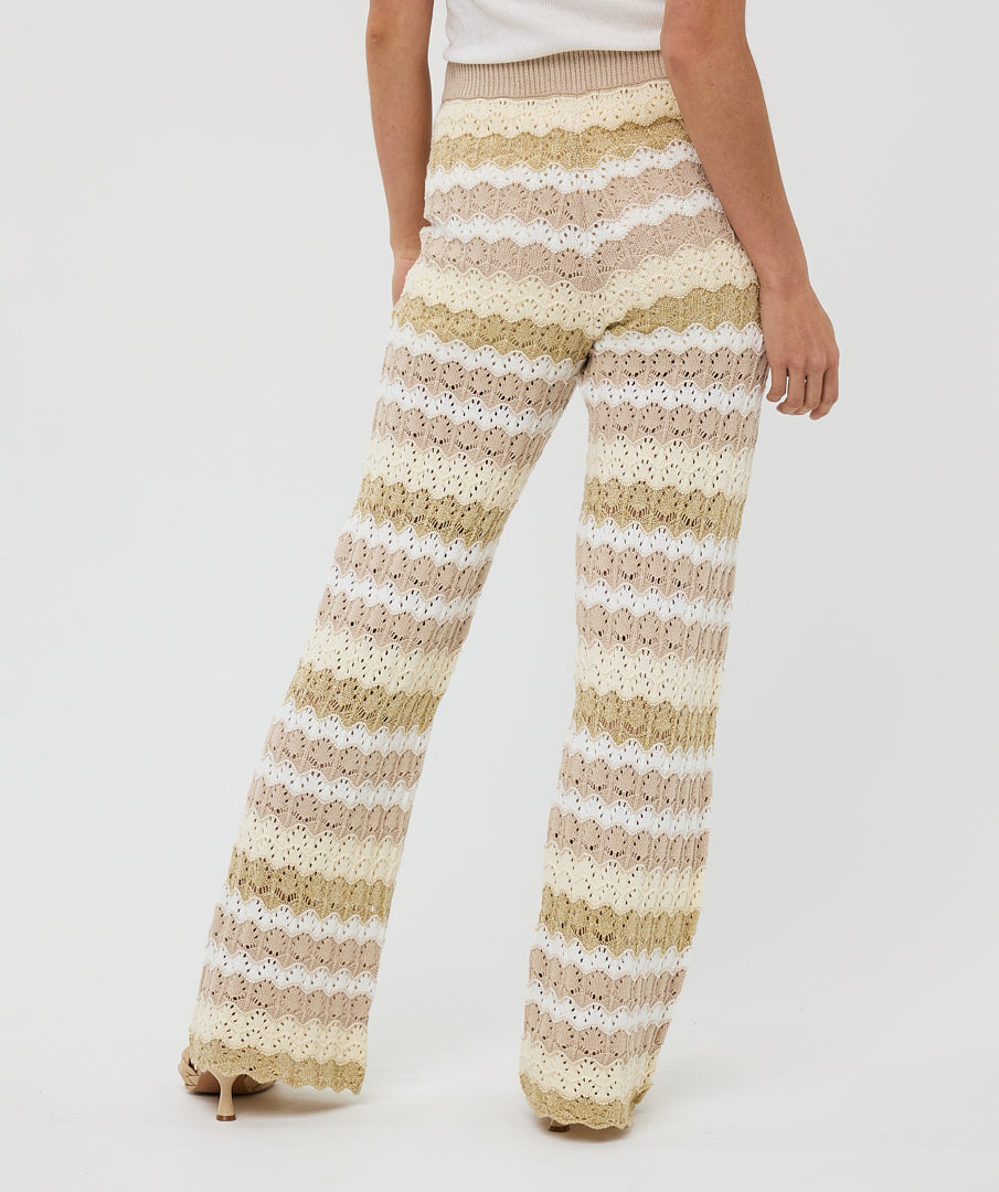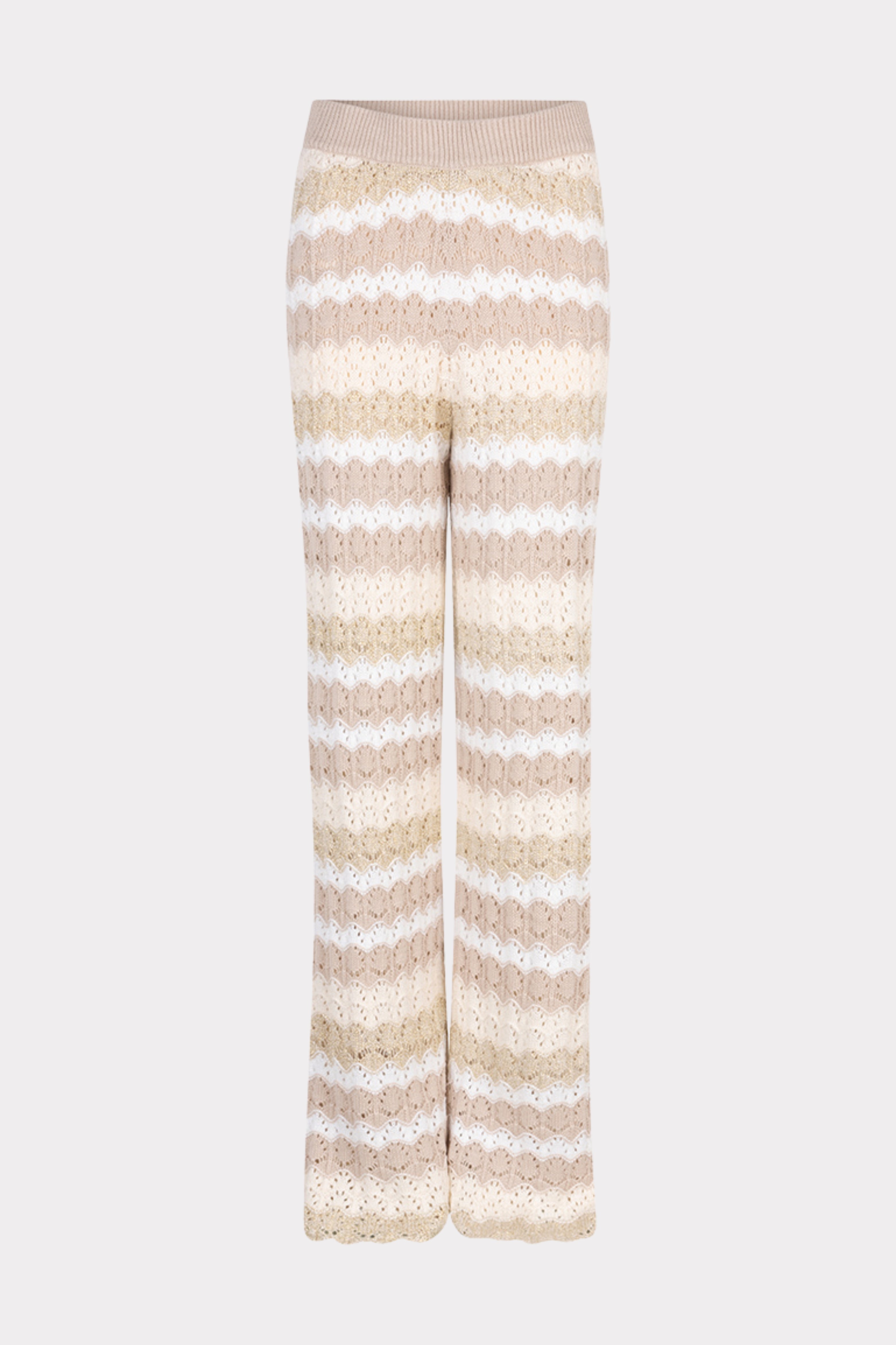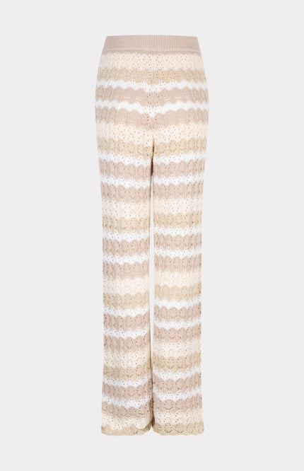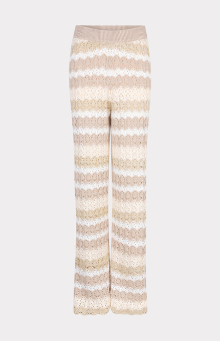 De Broek Ajour Stripe Knit Print van Esqualo is dé perfecte mix van comfort en stijl. De ajourgebreide stof met glanzende strepen en rechte pijpen zorgt voor een luchtige, elegante look – ideaal voor zomerse dagen of als co-ord set.