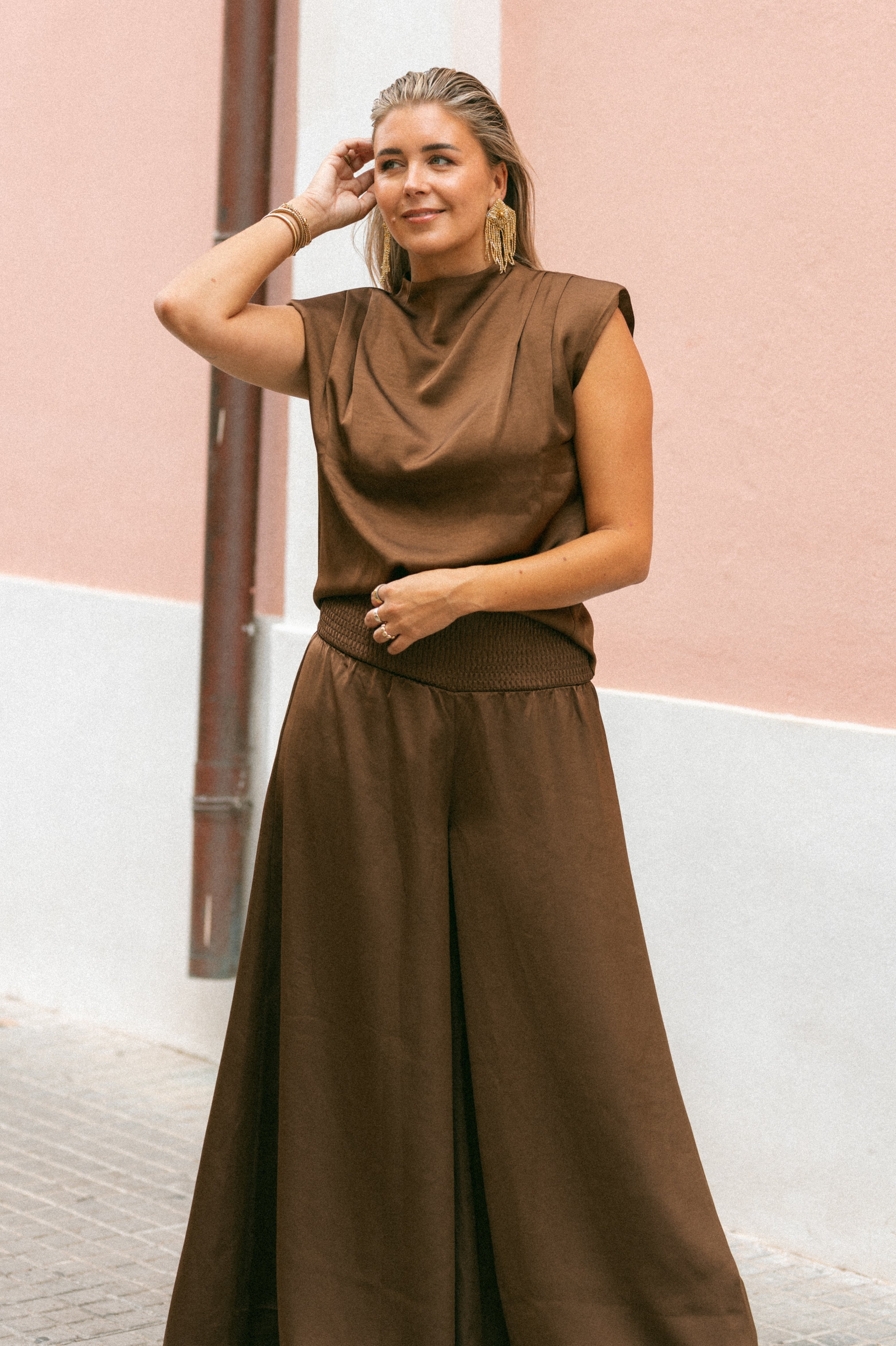 De Broek Cariño Dark Brown van Bolina Island is een elegante broek met hoge, brede tailleband. De soepele, wijdvallende stof beweegt vloeiend mee. Perfect voor relaxte chic en avondjes uit.