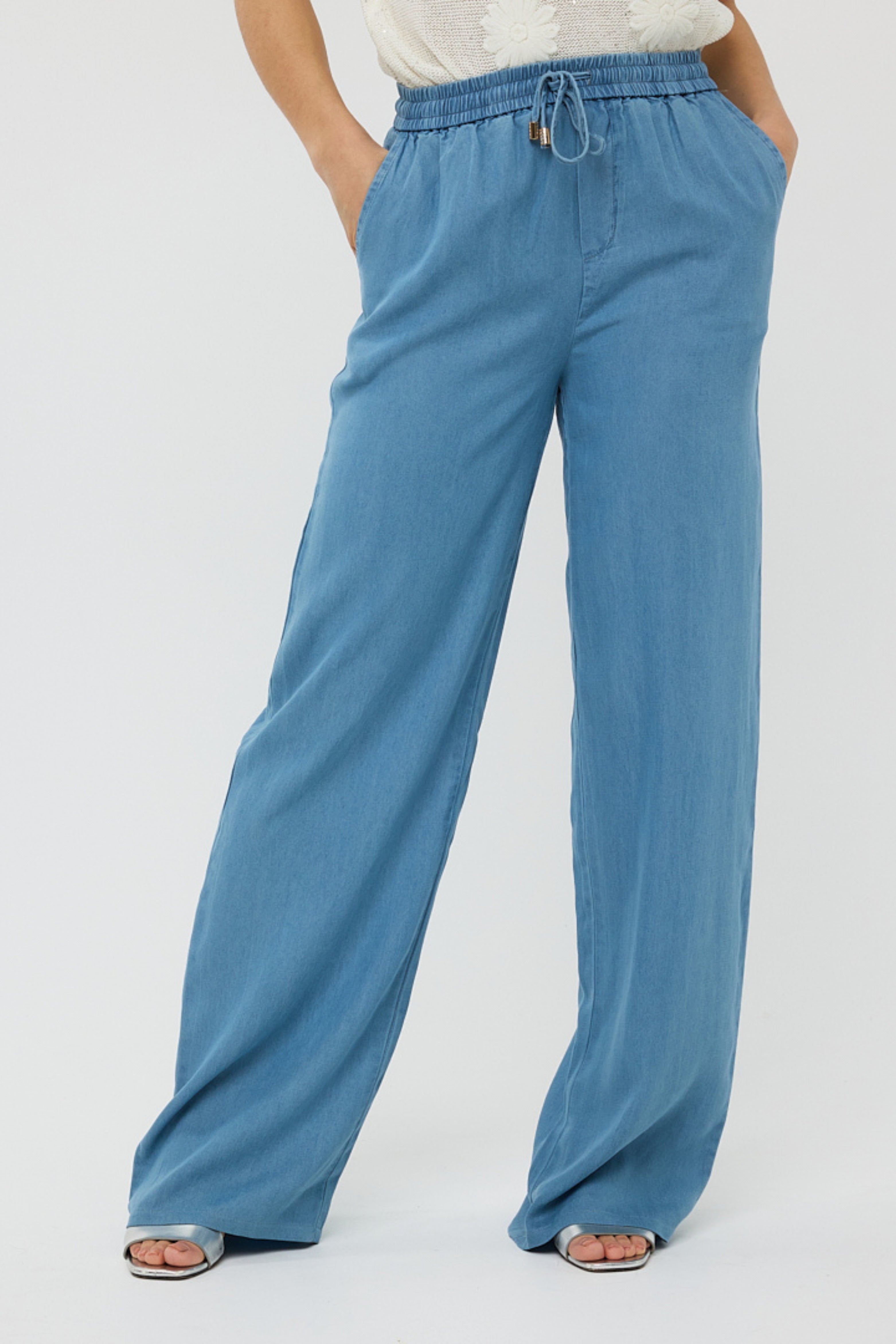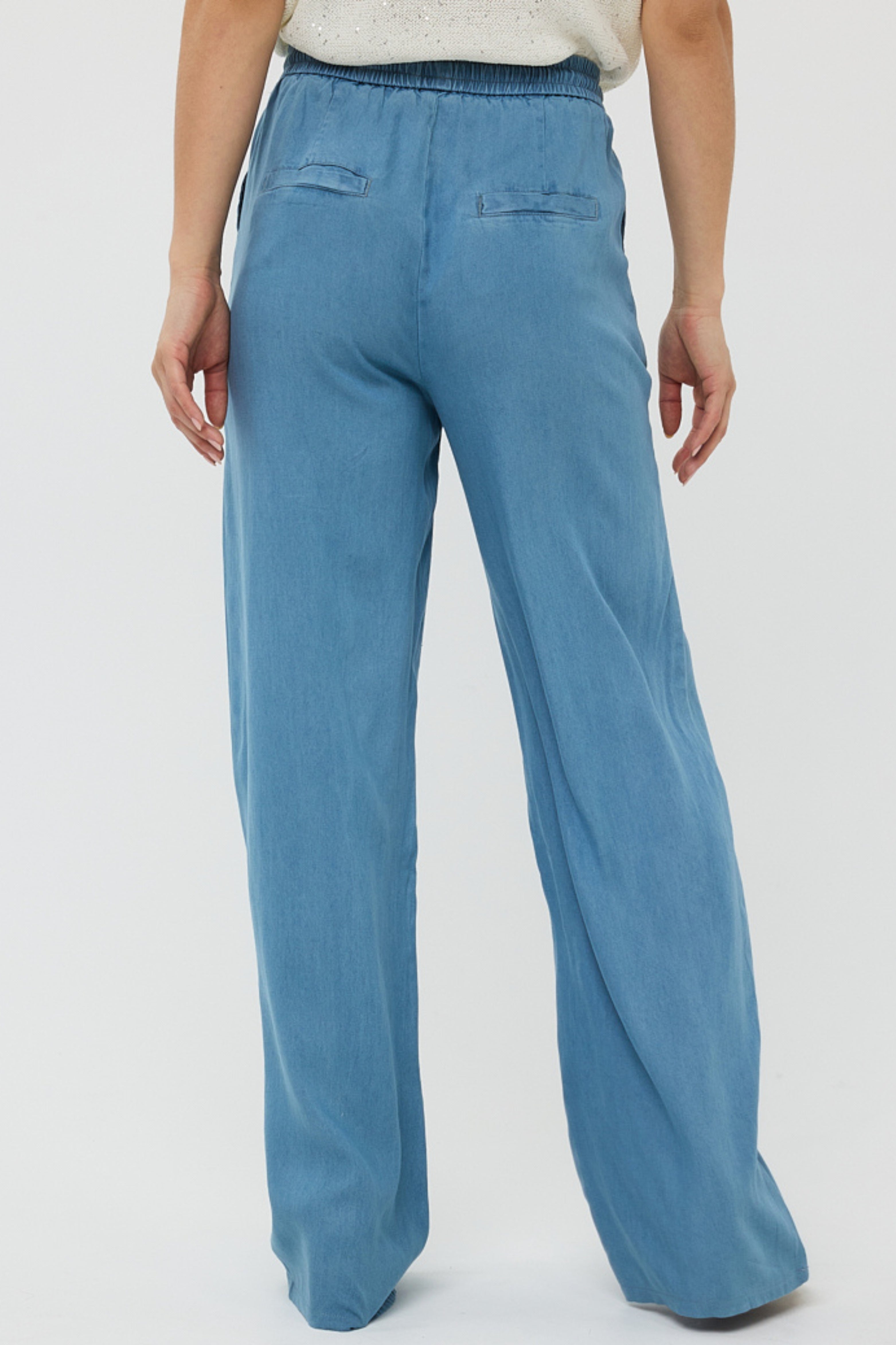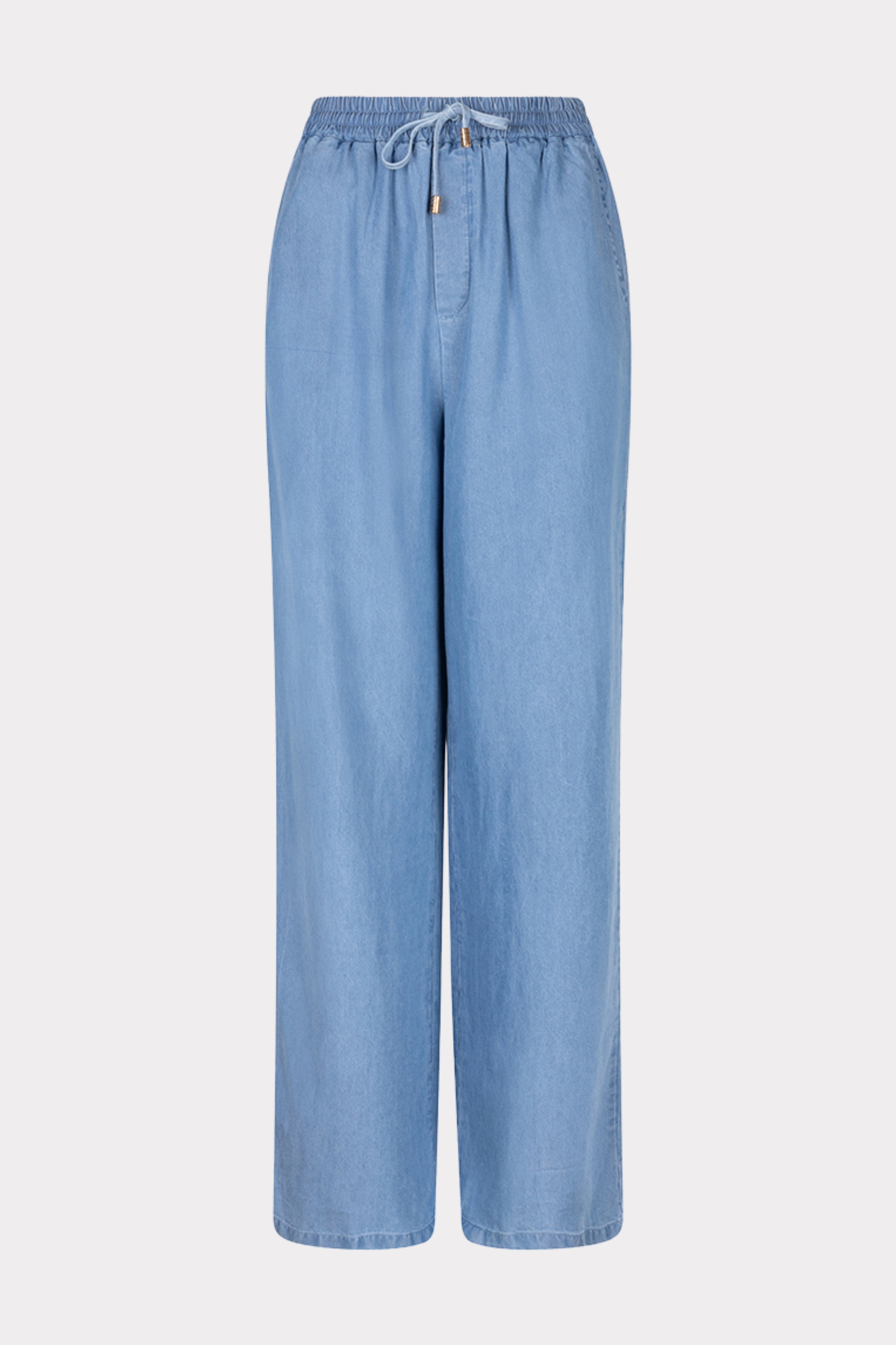 De Broek Chambray Blue van Esqualo combineert een casual uitstraling met een elegante soepelvallende fit. De luchtige chambray stof en comfortabele tailleband maken dit een ideaal item voor elke dag.