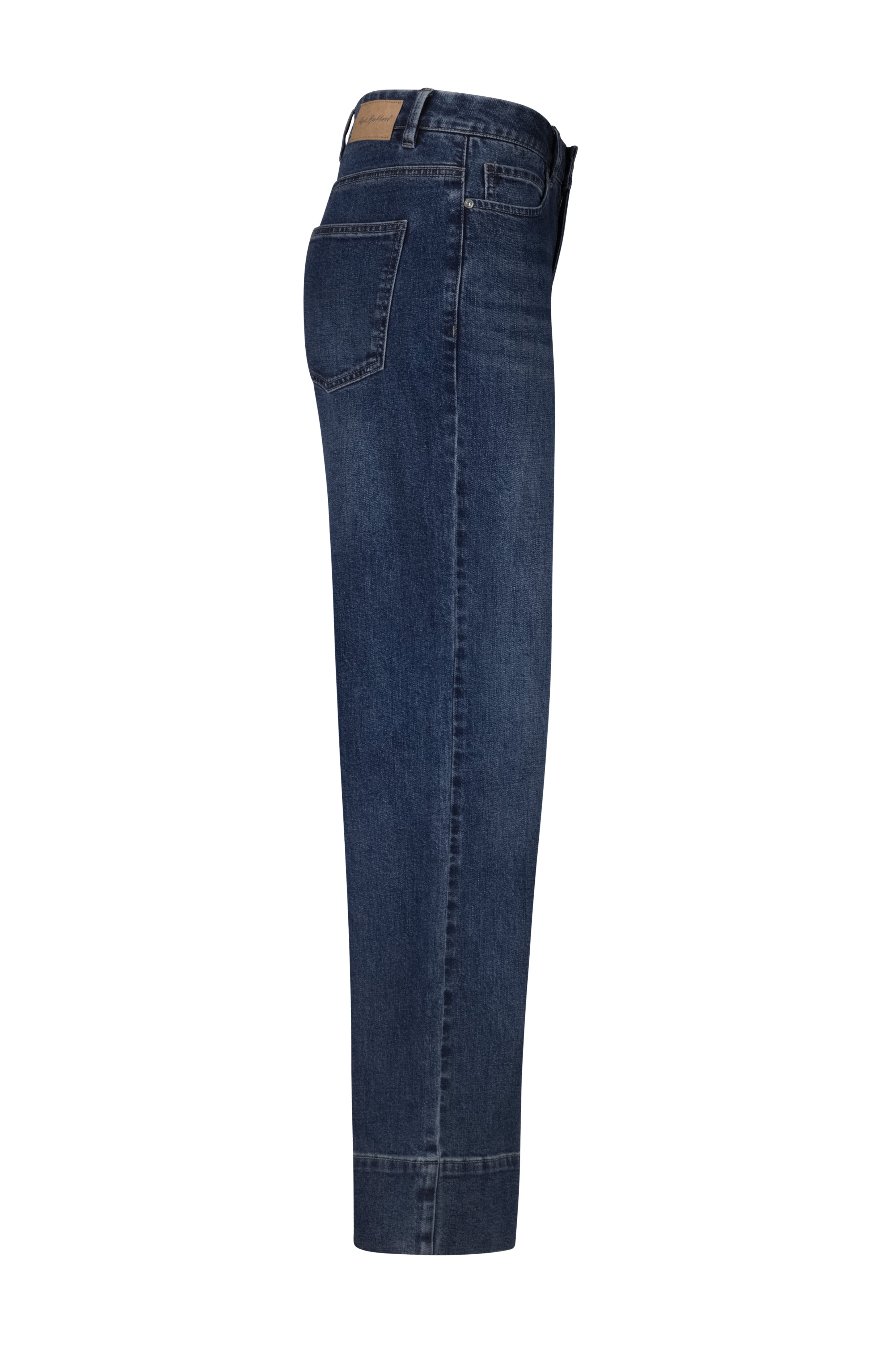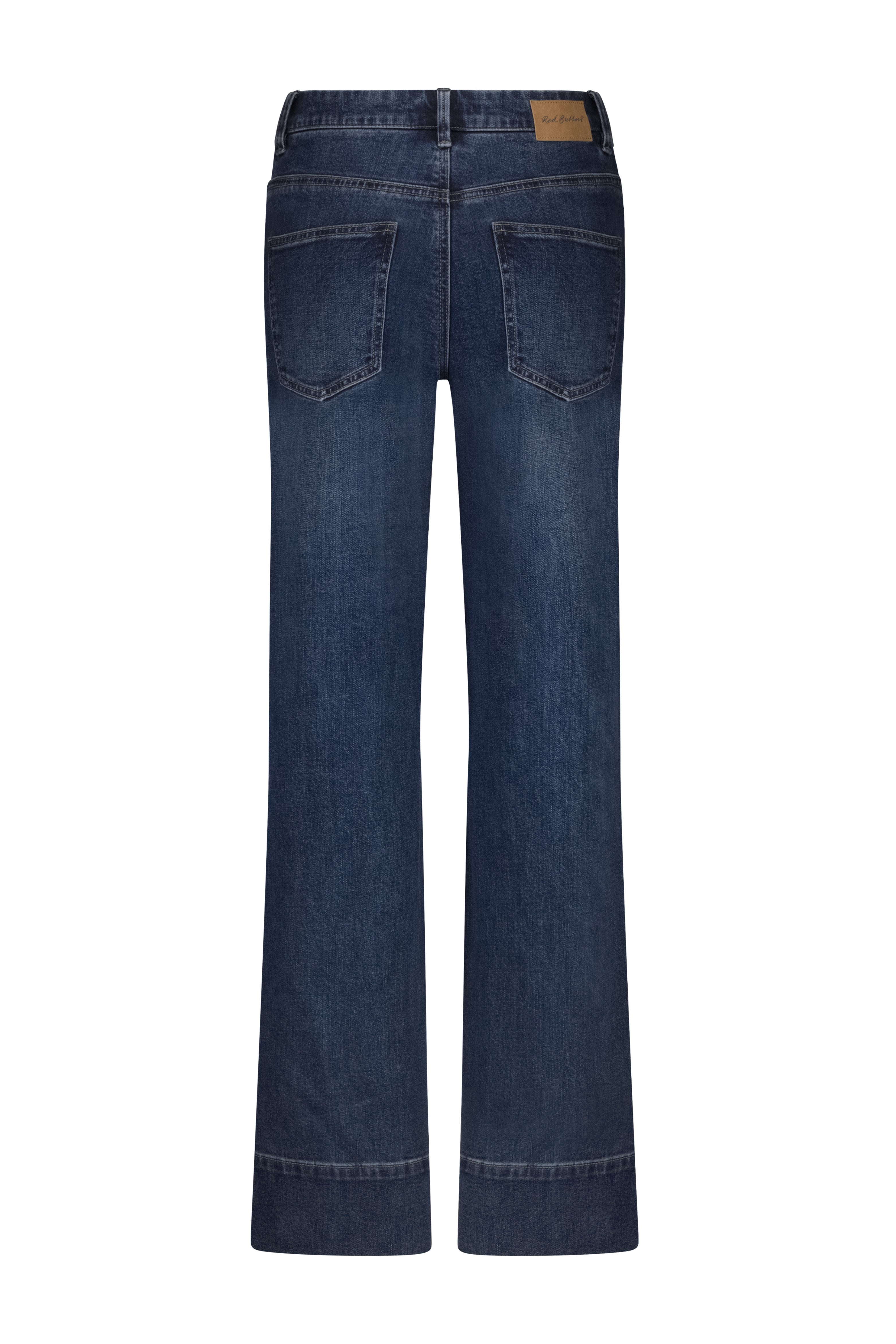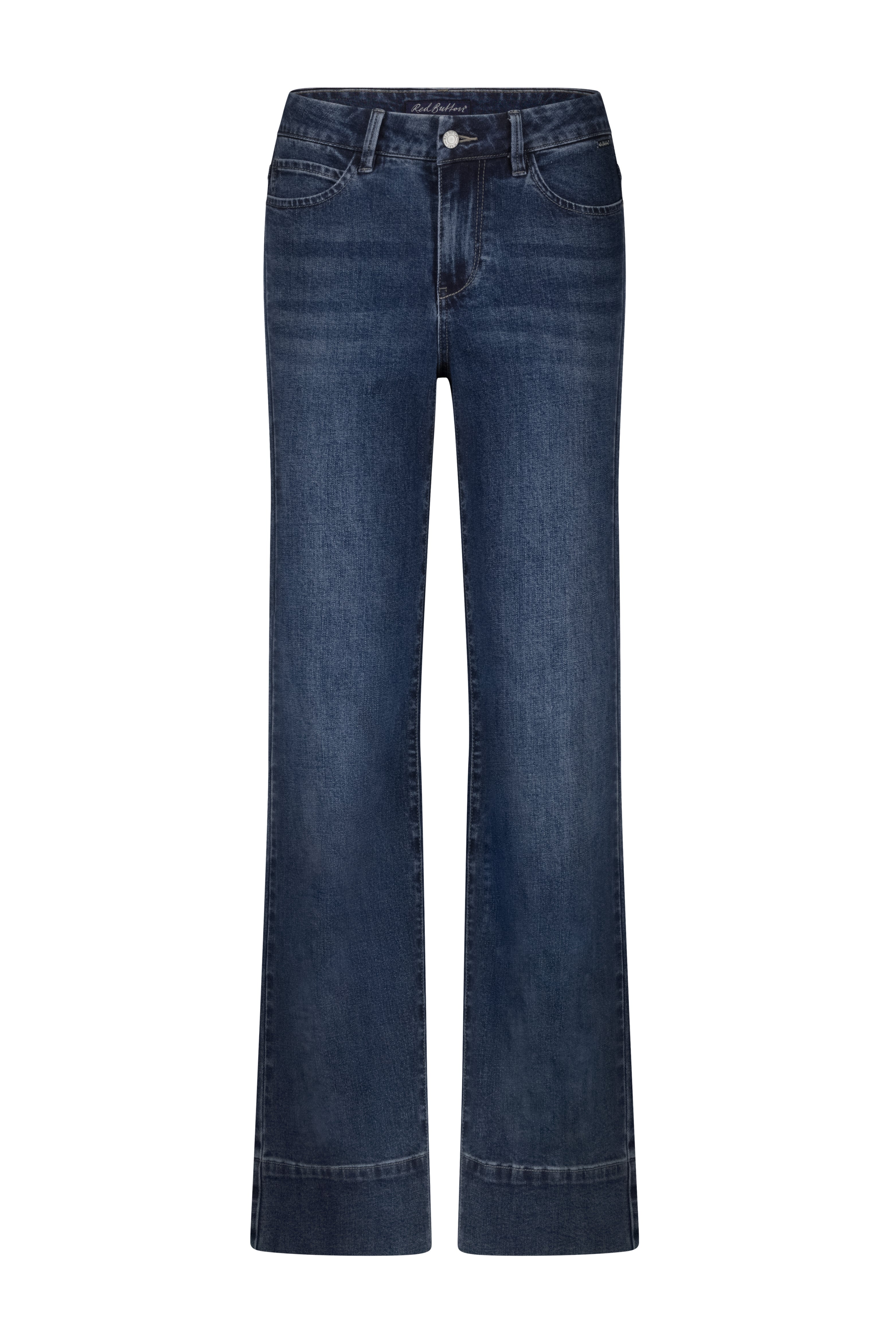 De Broek Claudette Darkblue Used van Red Button is een modern wide-leg model in donkerblauwe denim met een uitgesproken used wassing. De brede zoom geeft deze jeans een trendy en onderscheidende uitstraling.