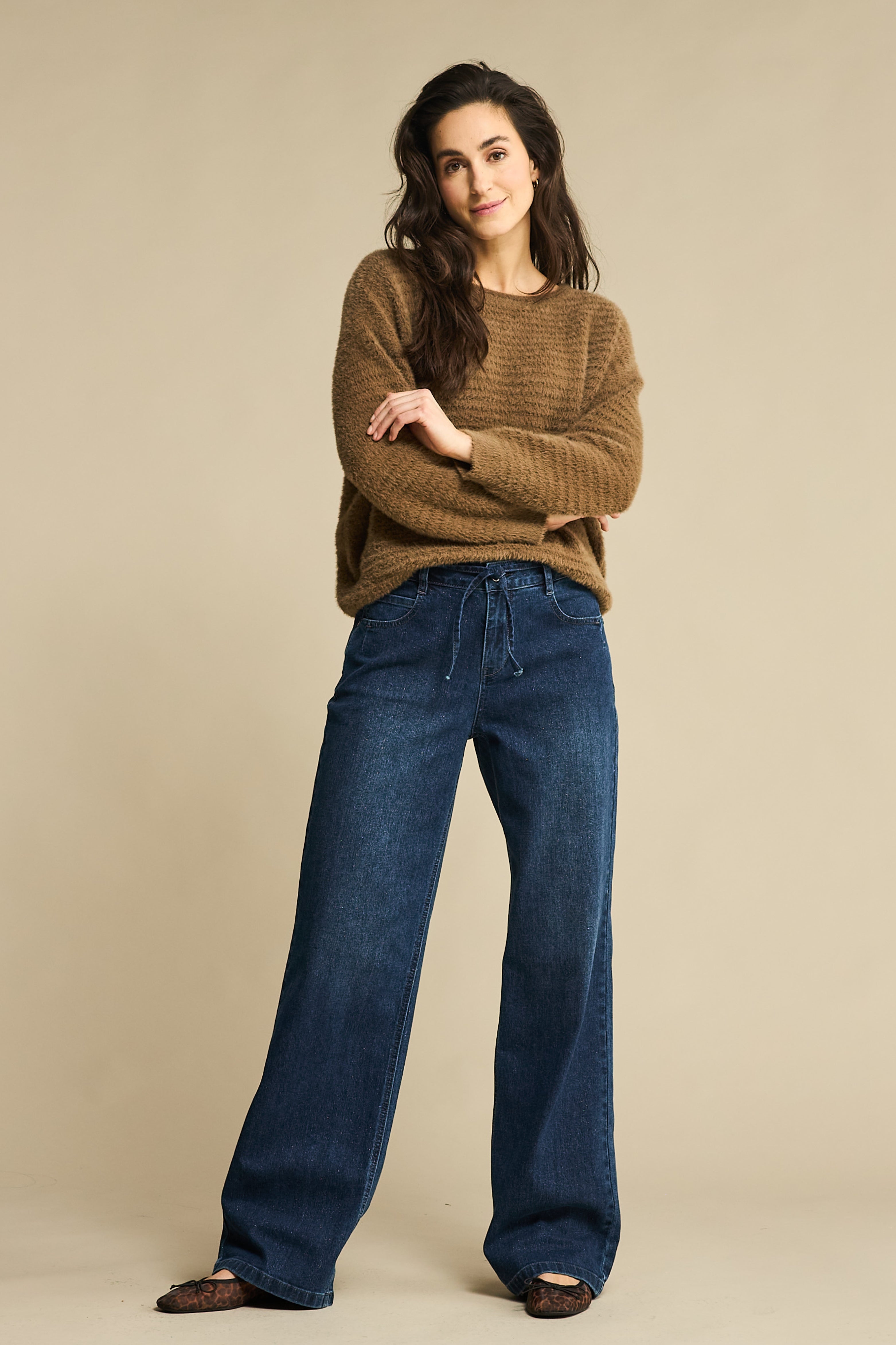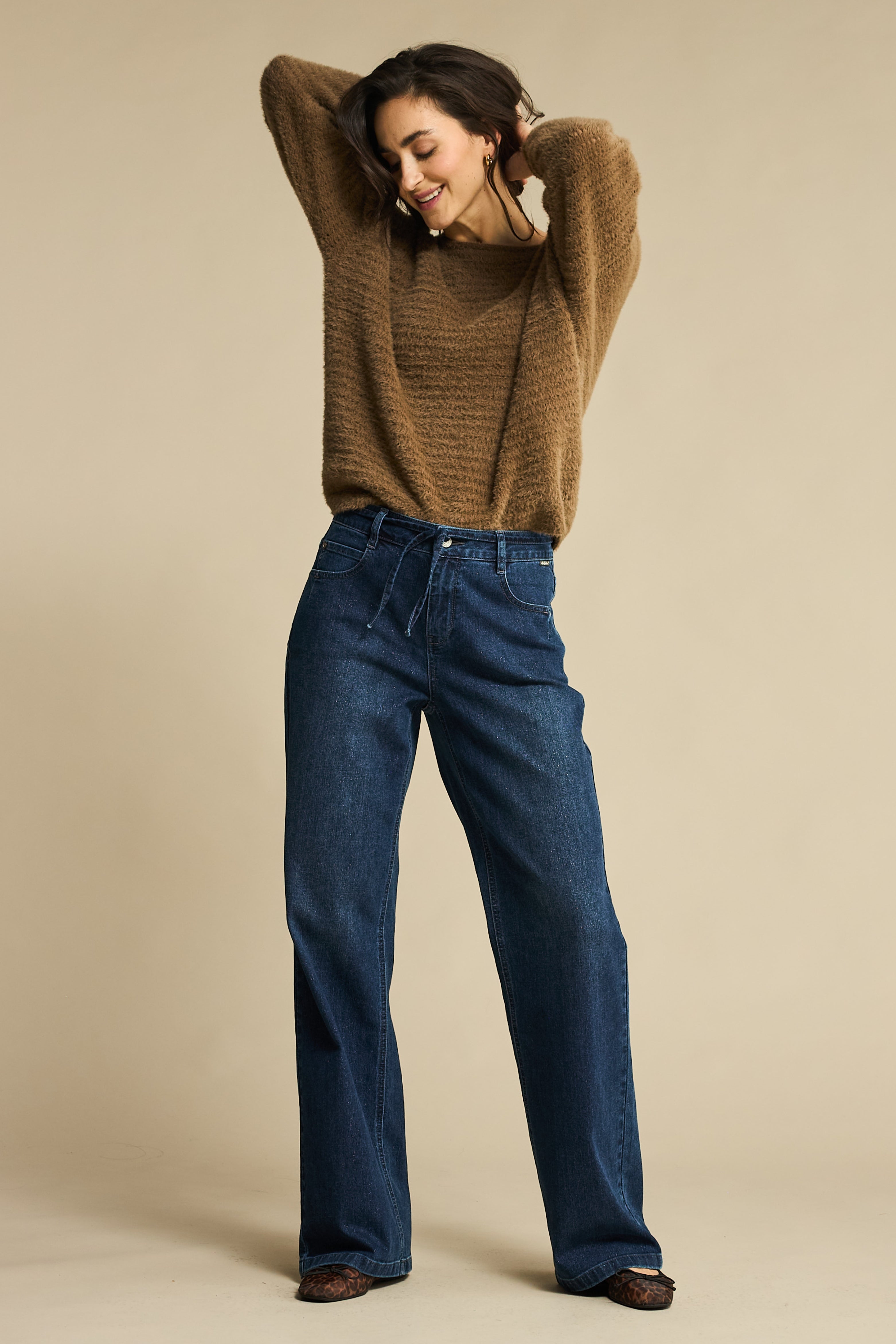 De Broek Colette Denim Sparkle Dark Blue van Red Button is een wide-leg model in donkerblauwe denim met een subtiele washed look. De ceintuur voegt een speels en stijlvol detail toe.