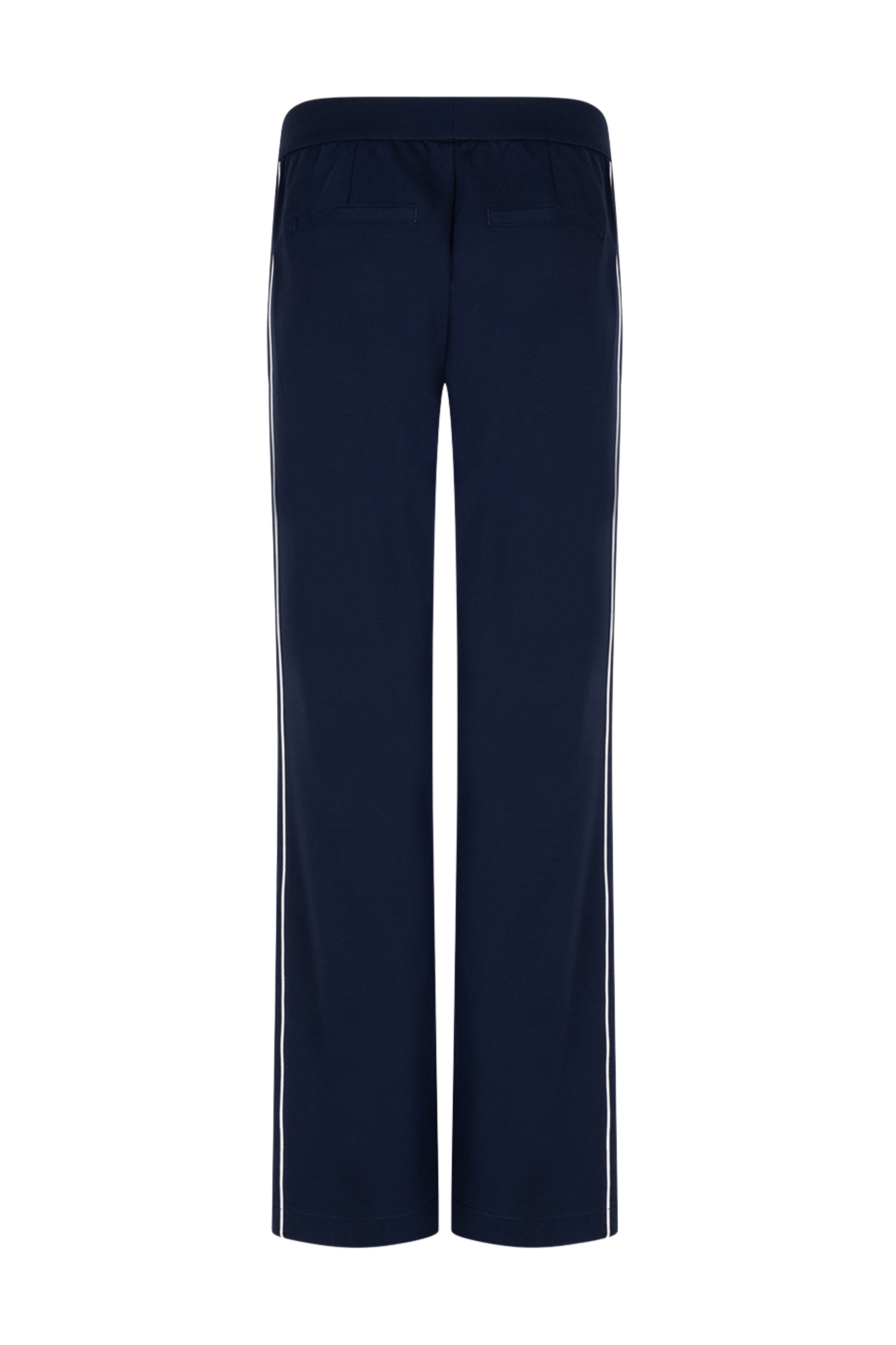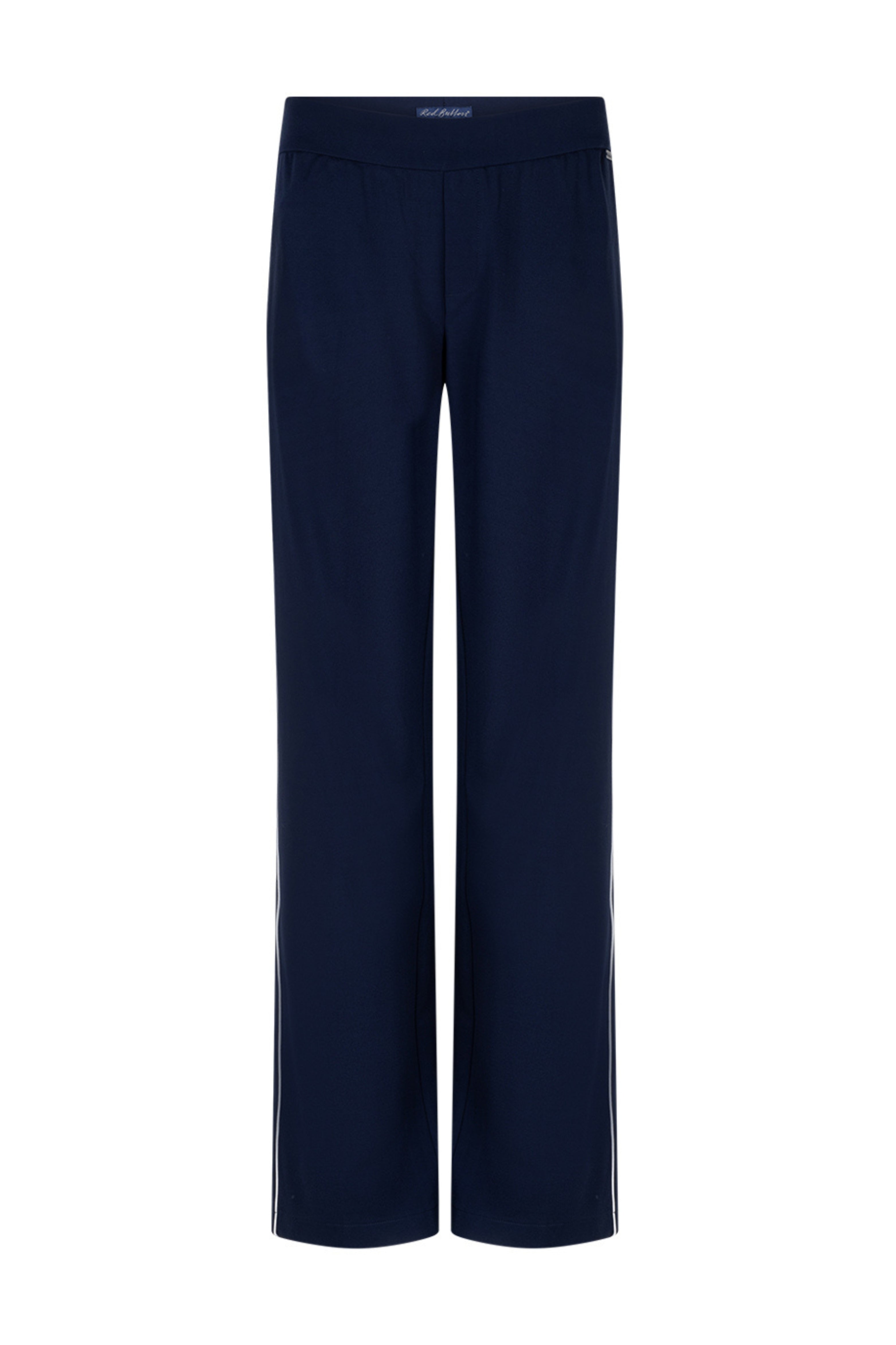 Broek Colette Punta Piping Dark Blue van Red Button is een elegante favoriet met wijde pijp en sportieve streep langs de zijkant. De comfortabele tailleband draagt heerlijk en maakt het perfect voor werk, reizen en casual chic.