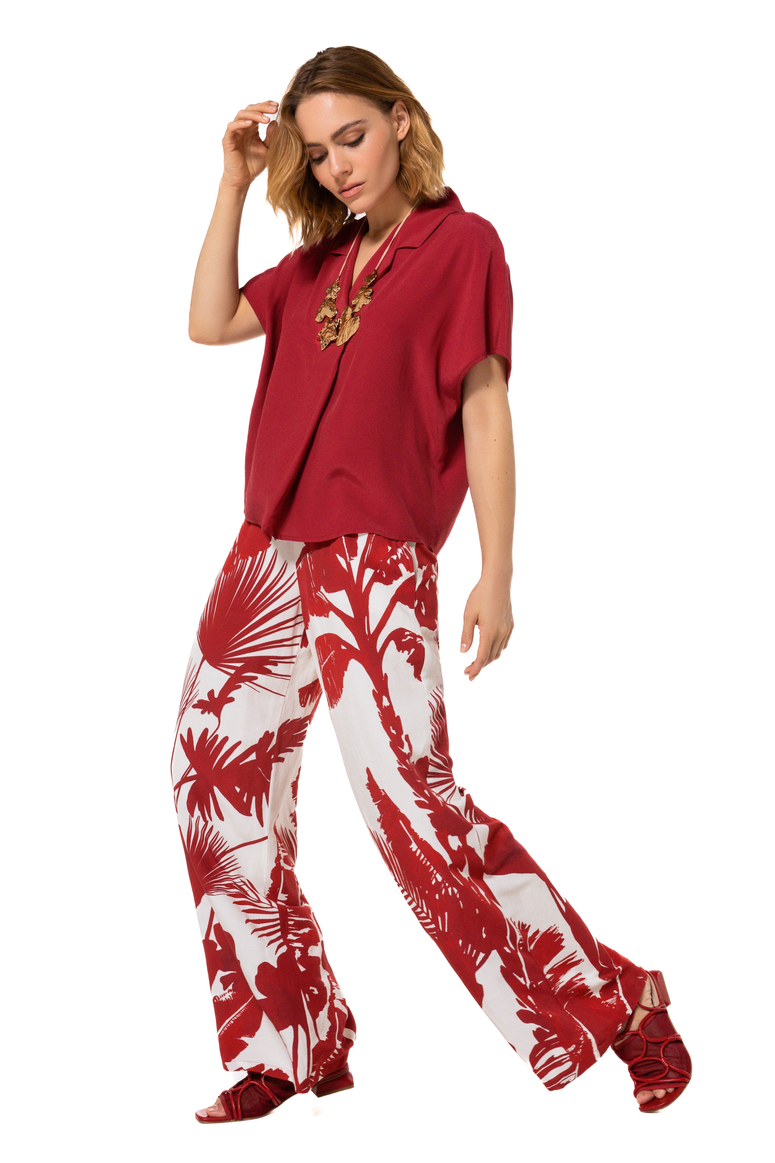 De Broek Crêpe Multi Color van Caroline Biss is een elegante wijde broek met elastische tailleband. De luchtige crêpestof en tropische bladprint geven elke zomerse look een vrolijke, vrouwelijke touch. Perfect voor vakantie of terras.