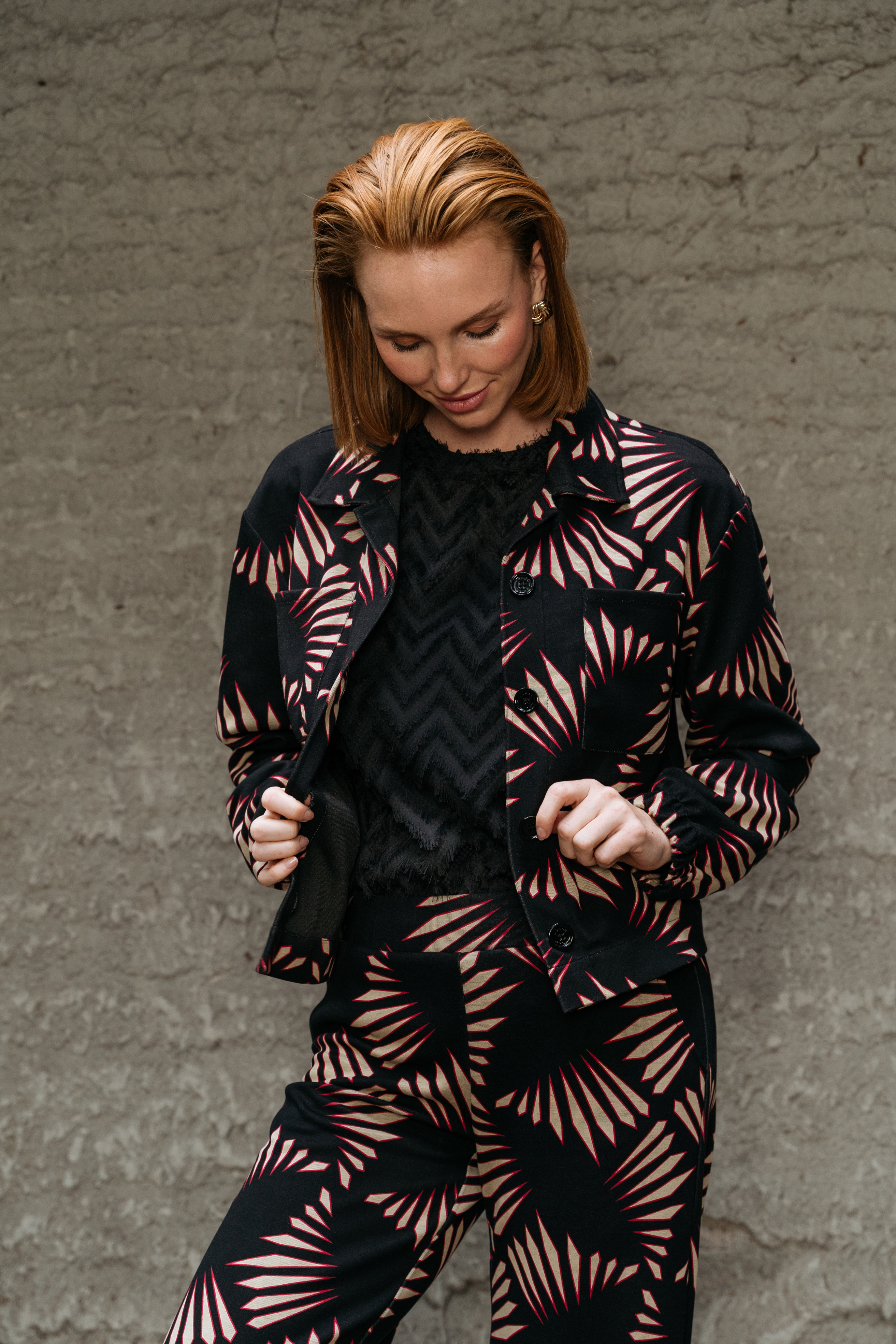 Broek Dawn Graphic Black Multi van &Co Woman is een statement piece met opvallende grafische print. De flared pijpen en comfortabele tailleband geven een moderne en vrouwelijke fit. Perfect om te dragen als co-ord set of los te combineren voor een krachtige en stijlvolle look.