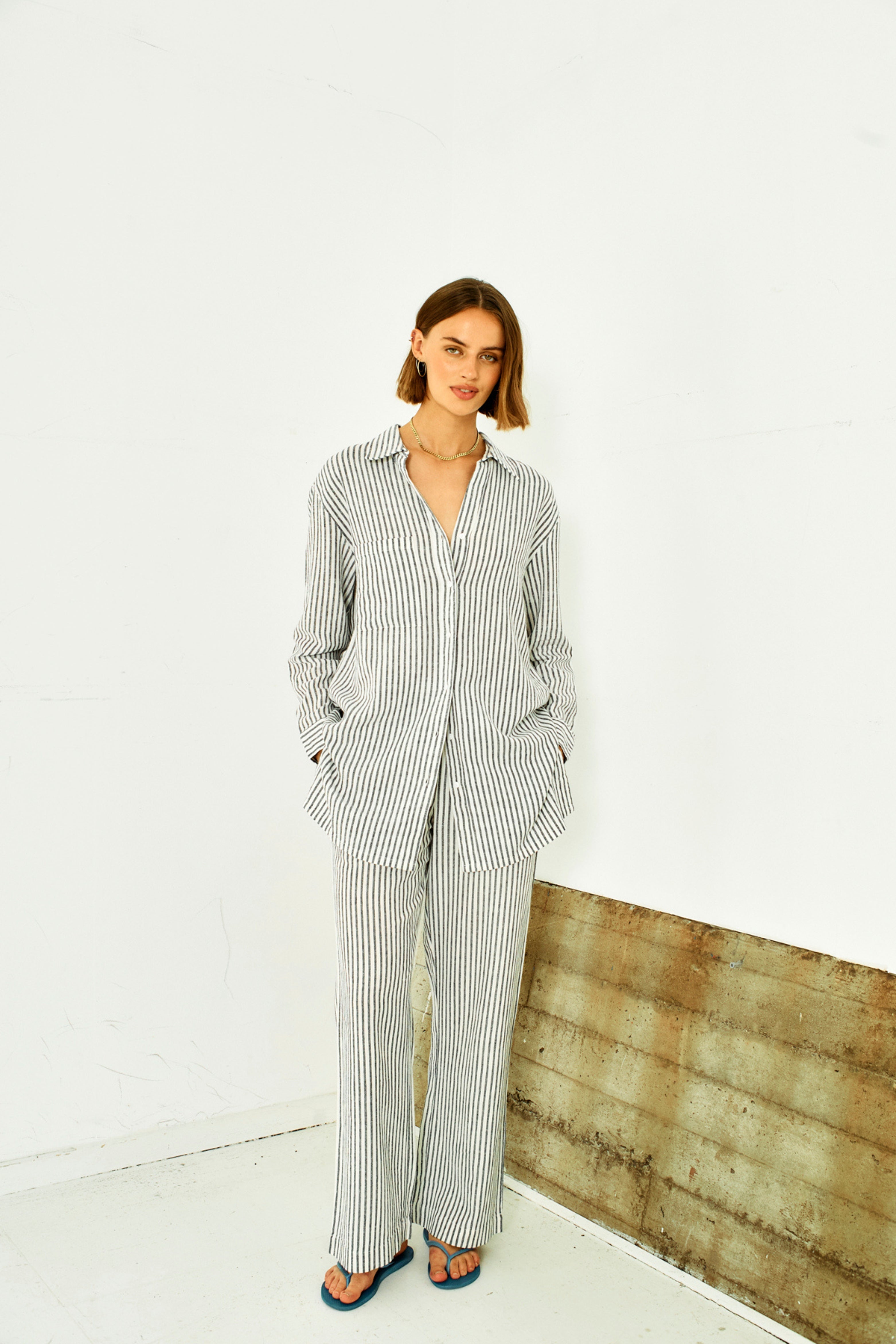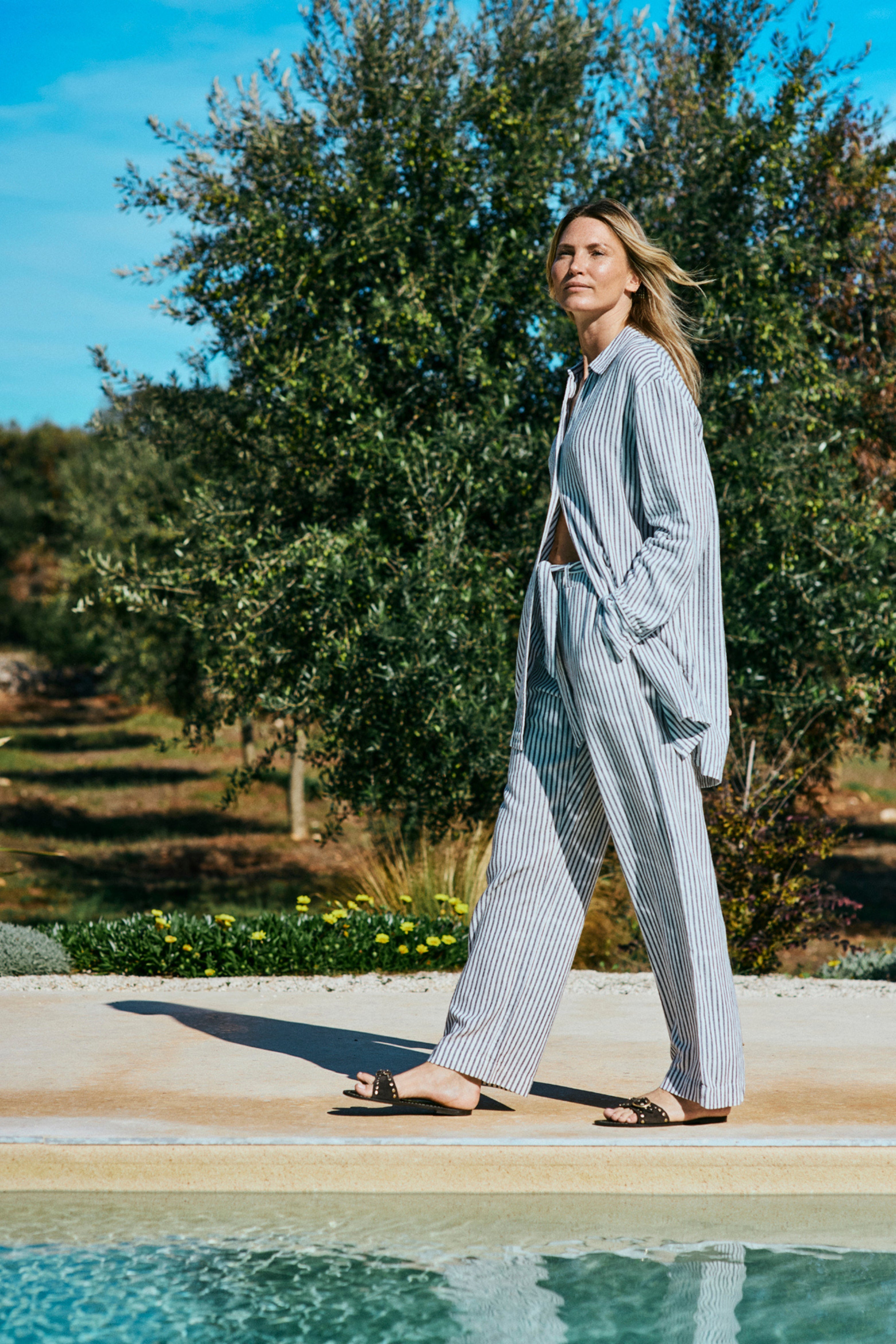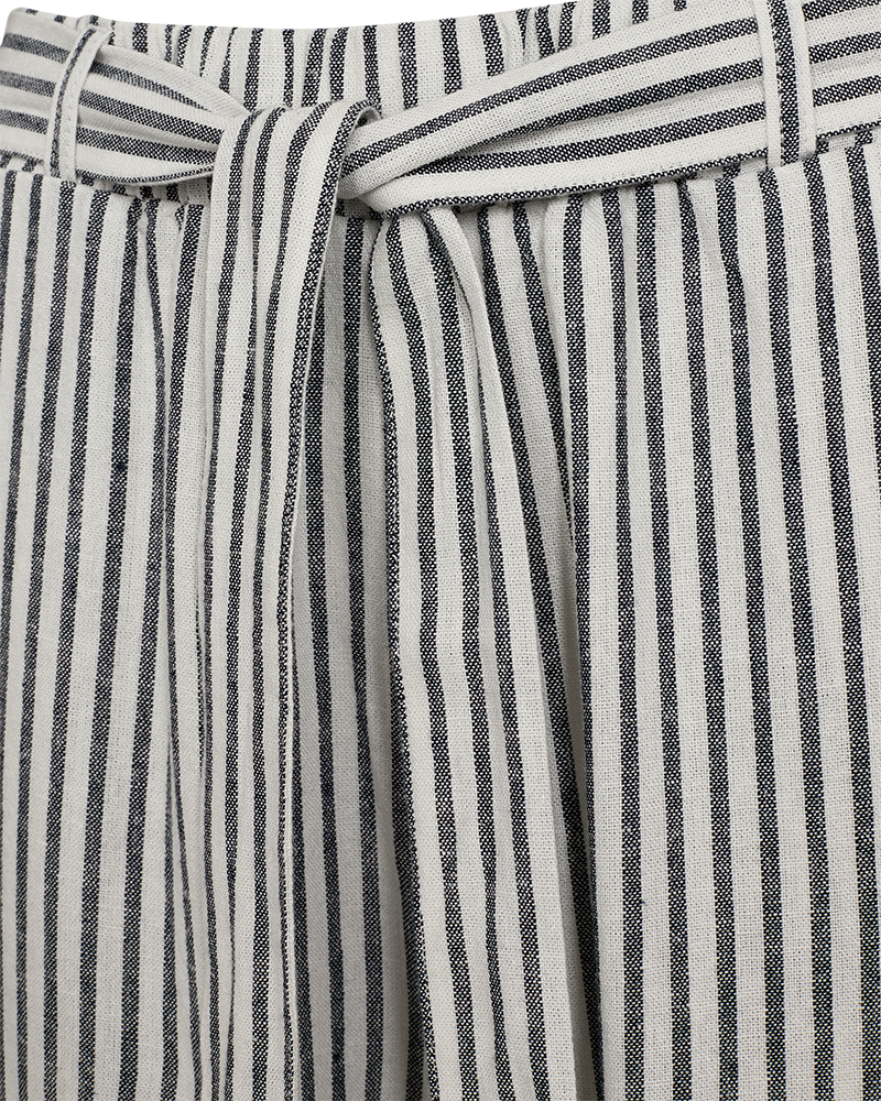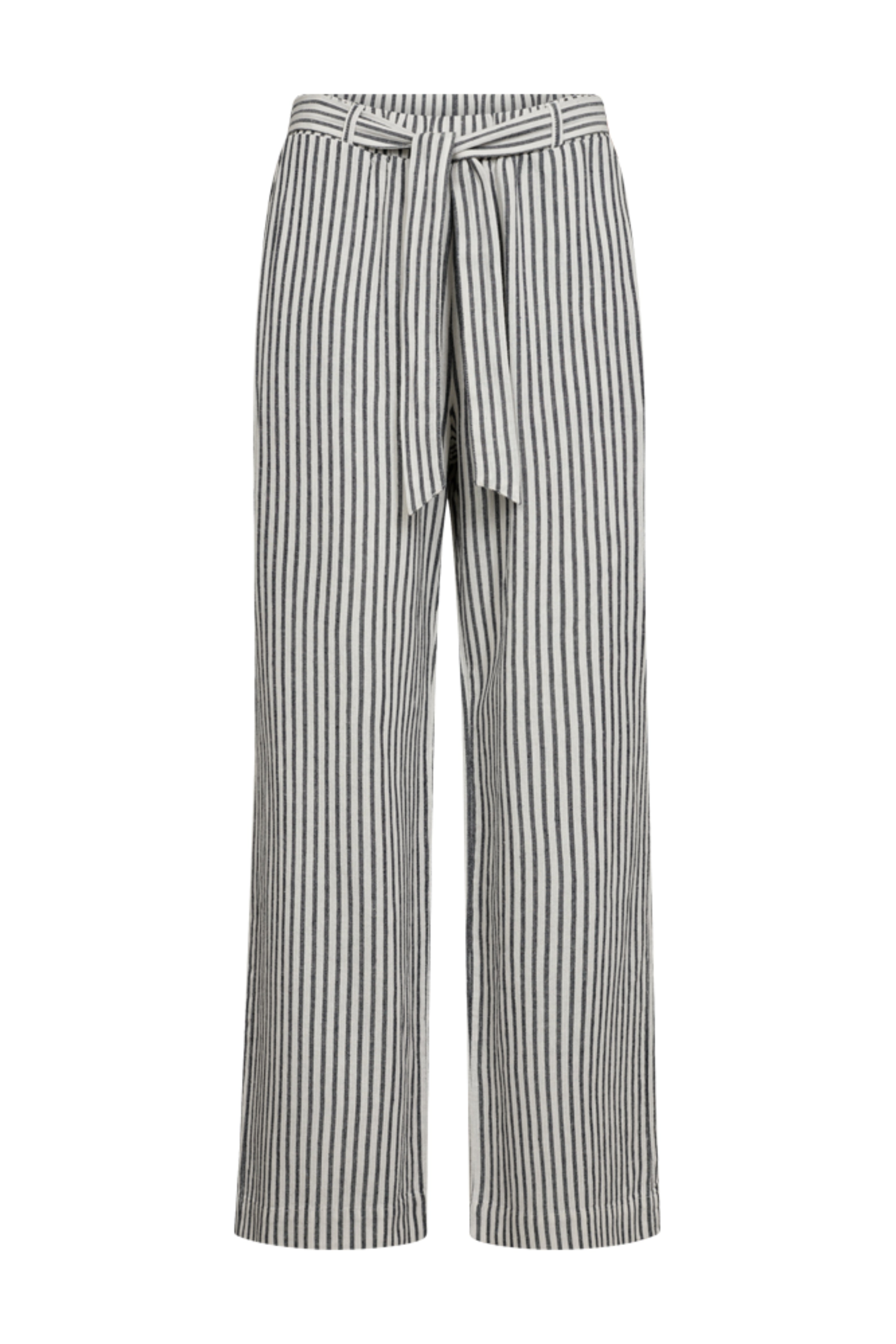 De Freequent FQLAVISCO broek in Star Offwhite Navy Blazer heeft een elegante verticale streep en een stijlvolle strikceintuur. De luchtige pasvorm en zachte stof maken deze broek ideaal voor een casual of chique look.
