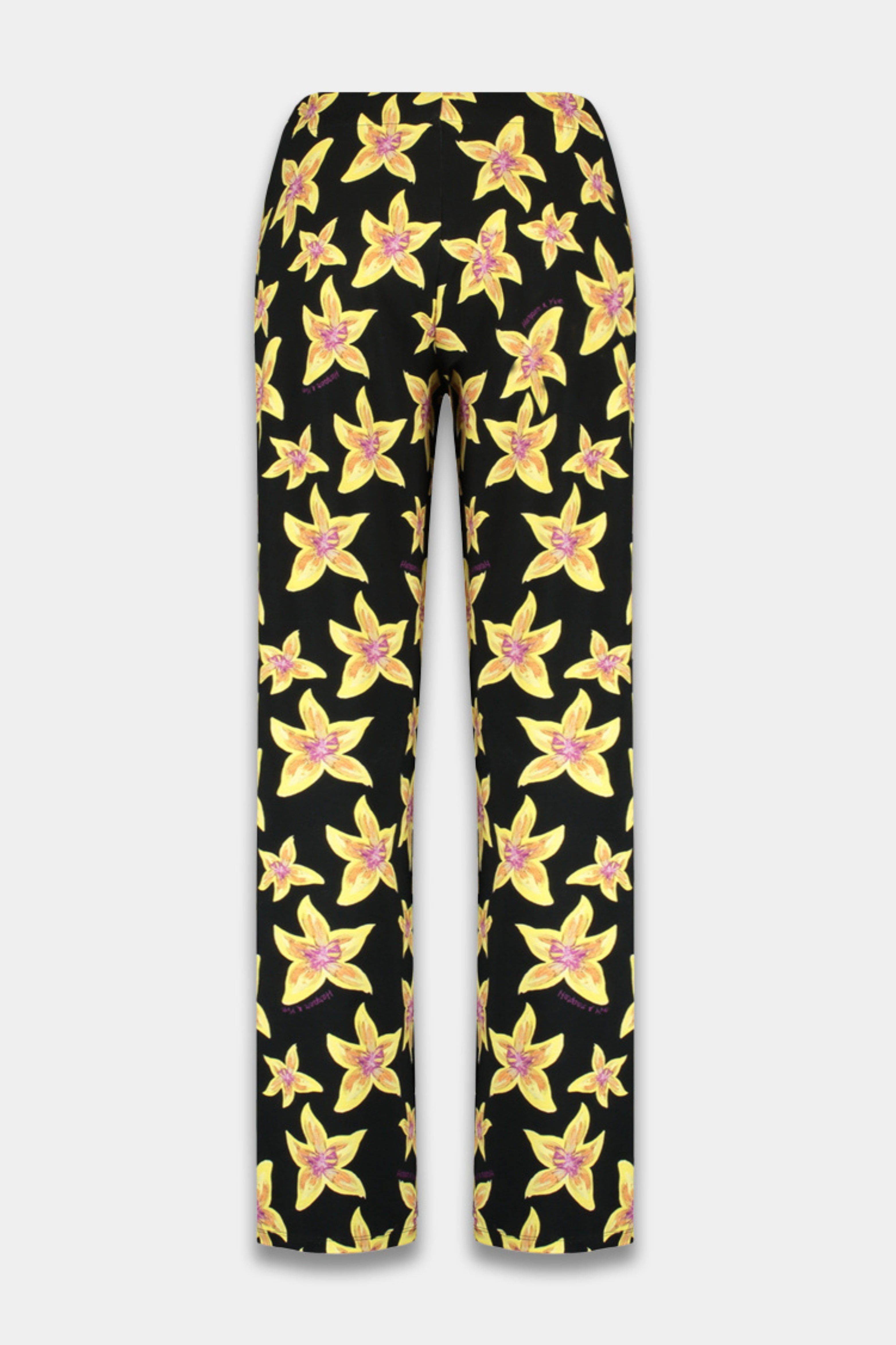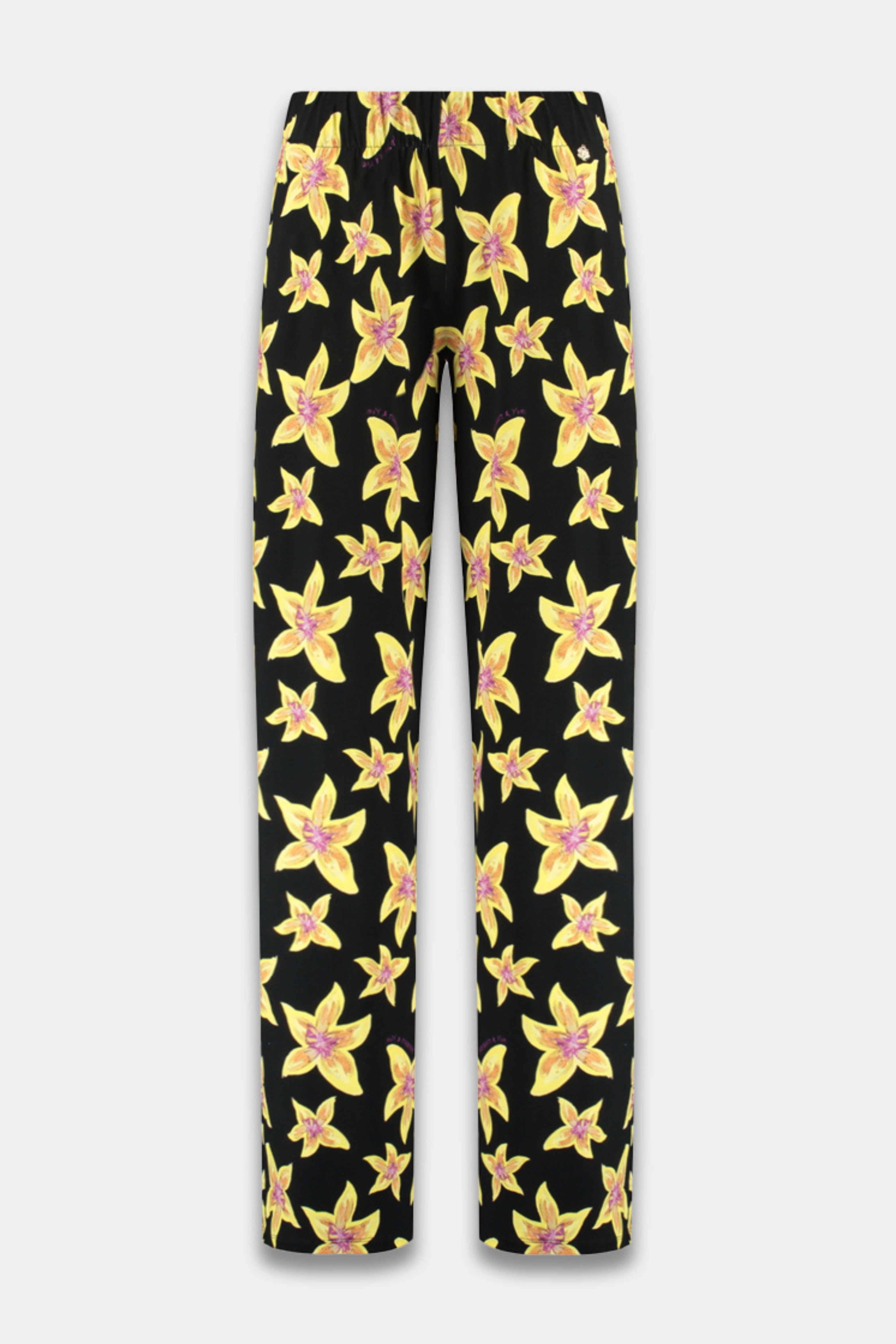 De Broek Jane Cheeky Flower Yellow van Harper & Yve is een opvallende en vrolijke keuze voor iedereen die houdt van kleur en print. Deze broek met wijde pijpen is versierd met een speelse bloemenprint in gele en roze tinten op een donkere achtergrond.