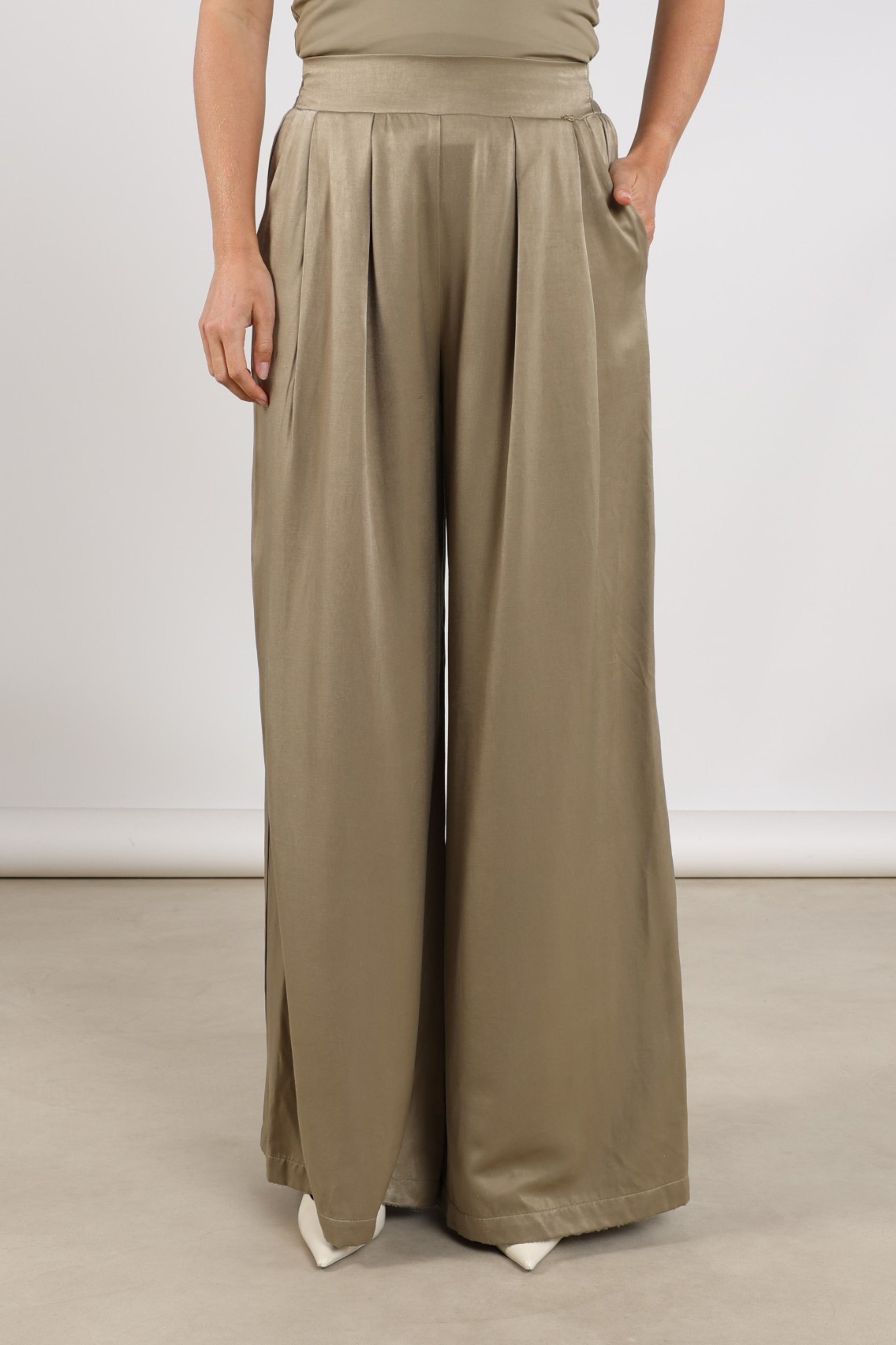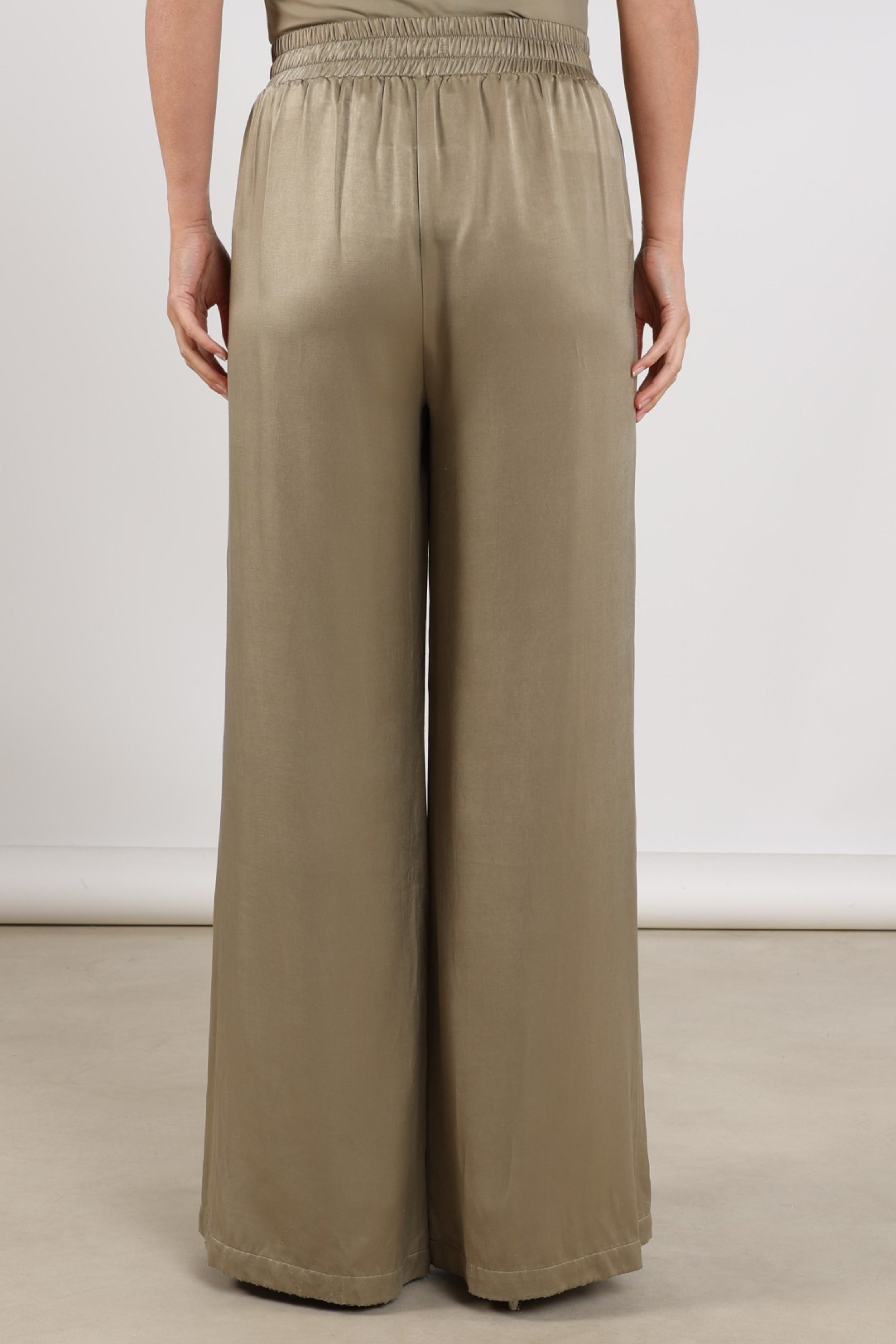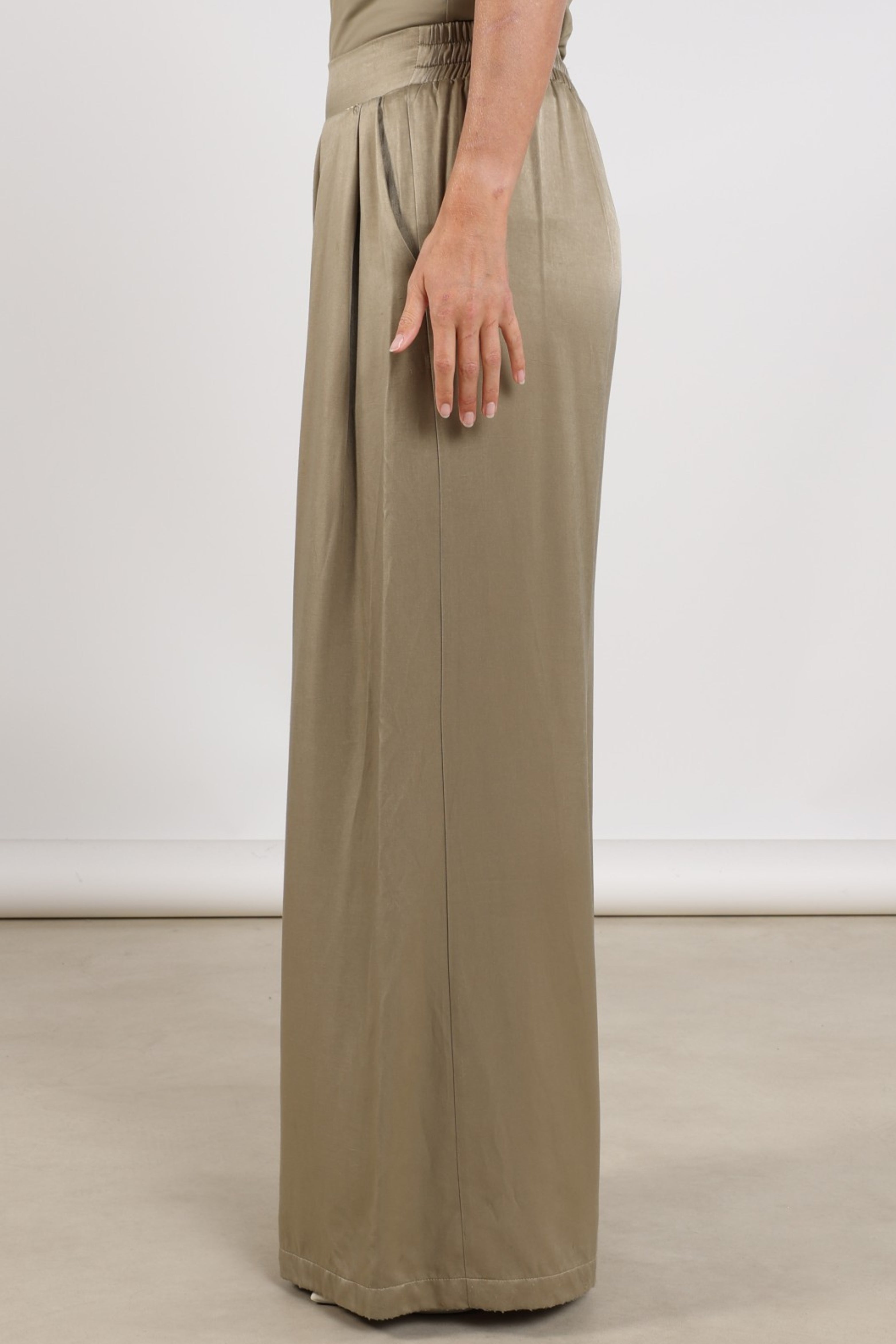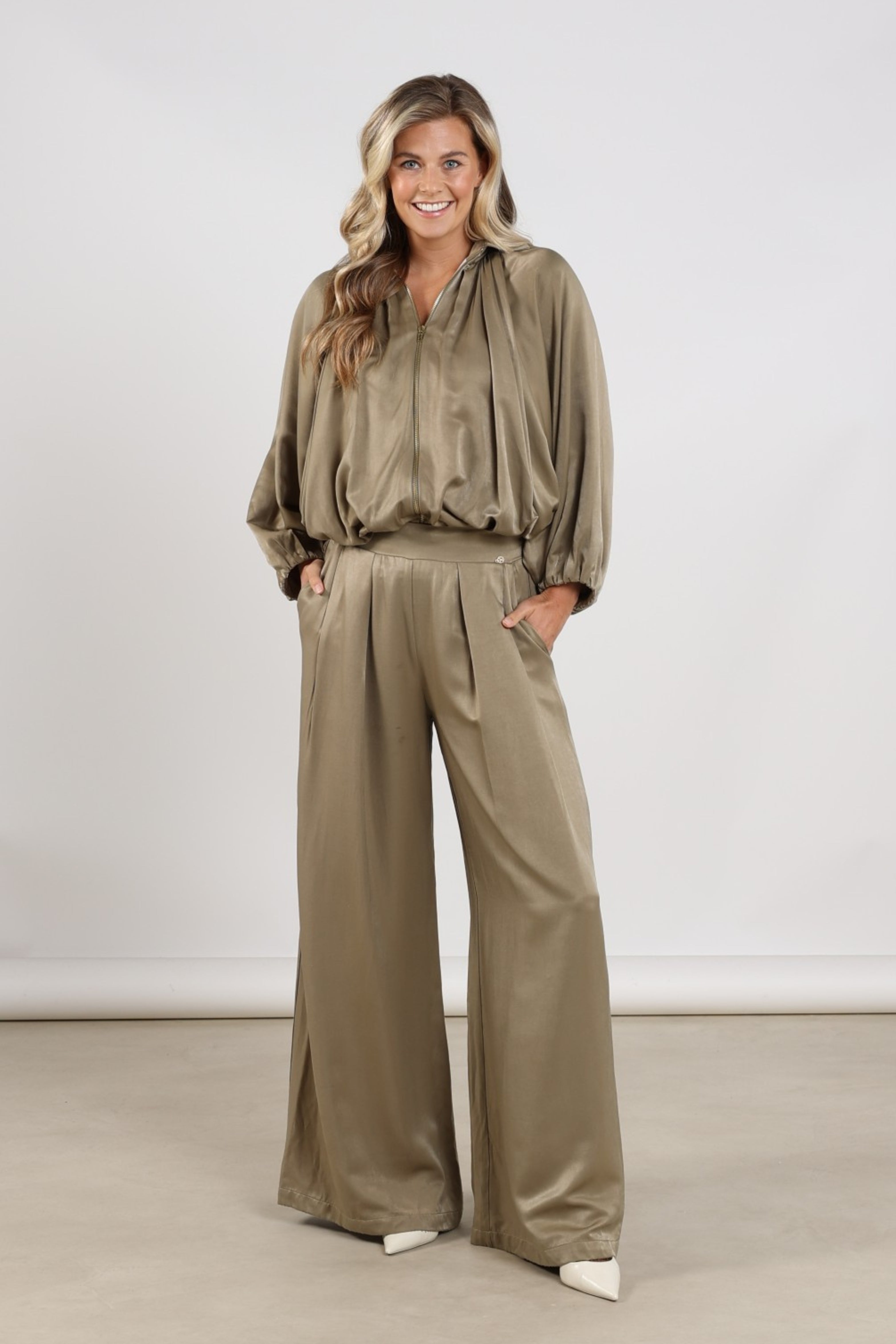 De Broek Juna Army van Nukus is een elegante broek met hoge taille en wijde pijpen. De soepele, licht glanzende stof met plooien voor zorgt voor een luxe, luchtige look. Perfect voor werk én etentjes.