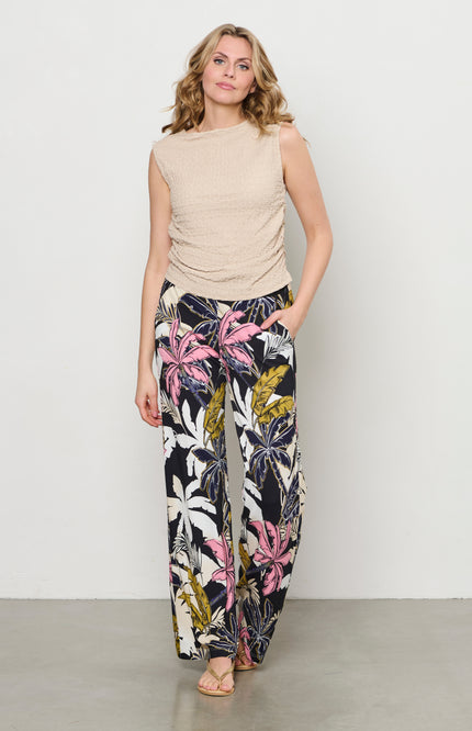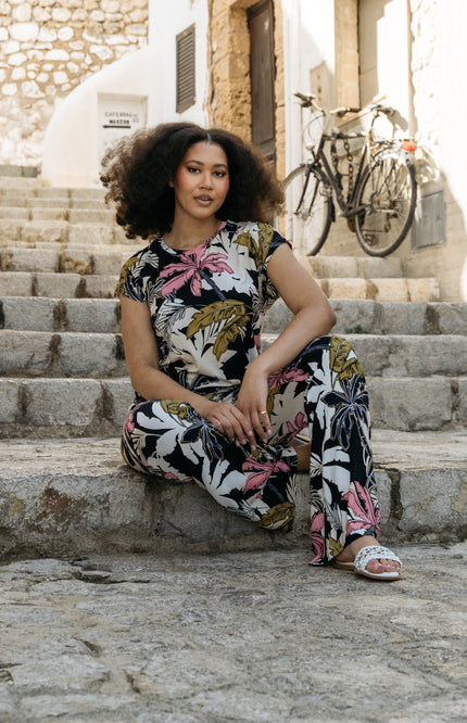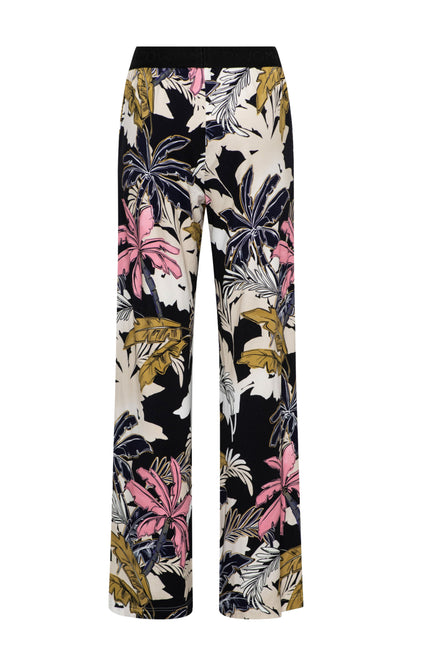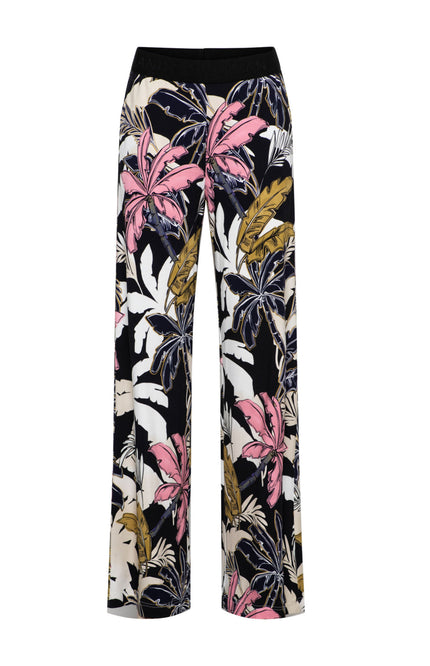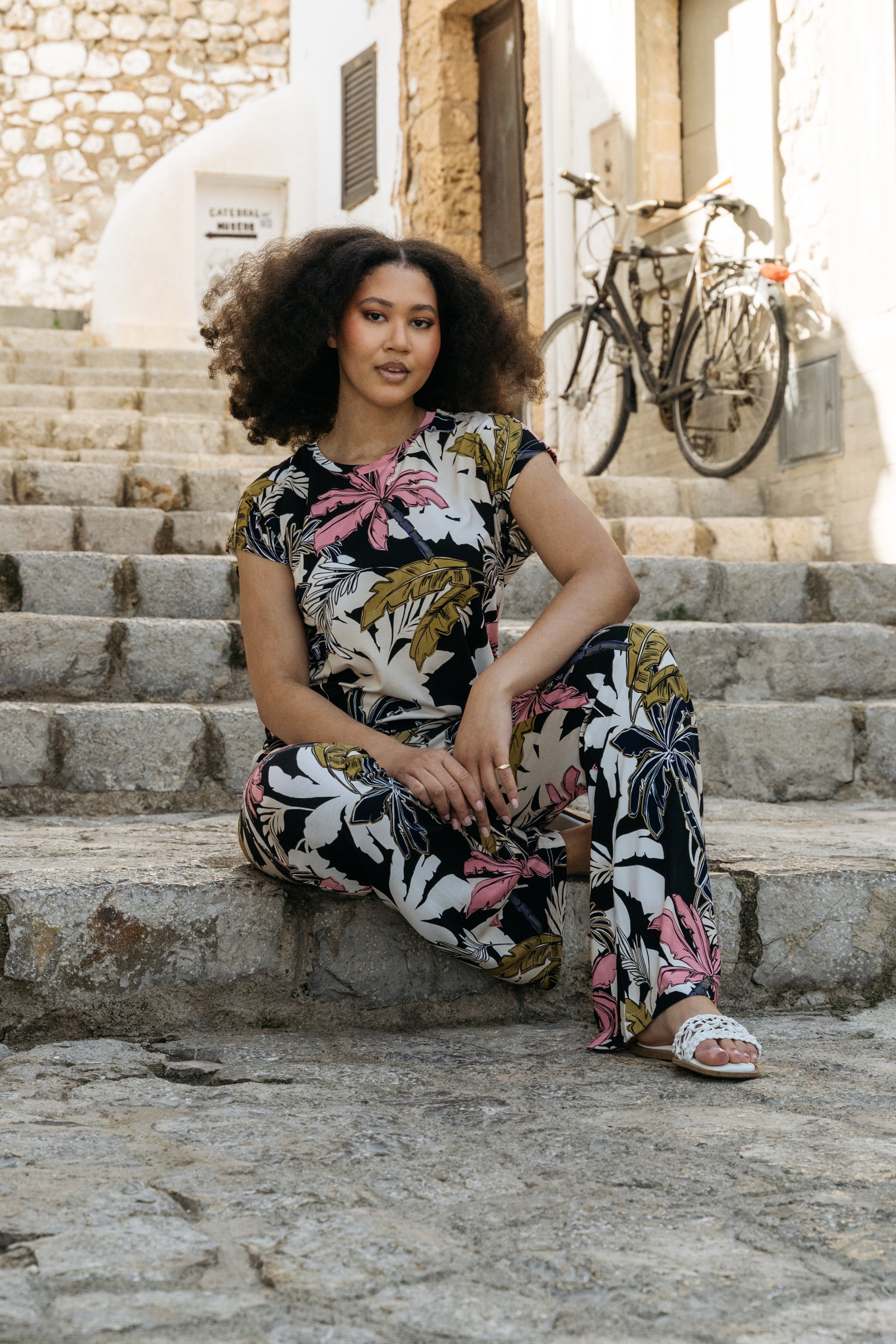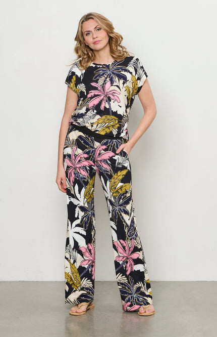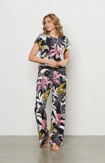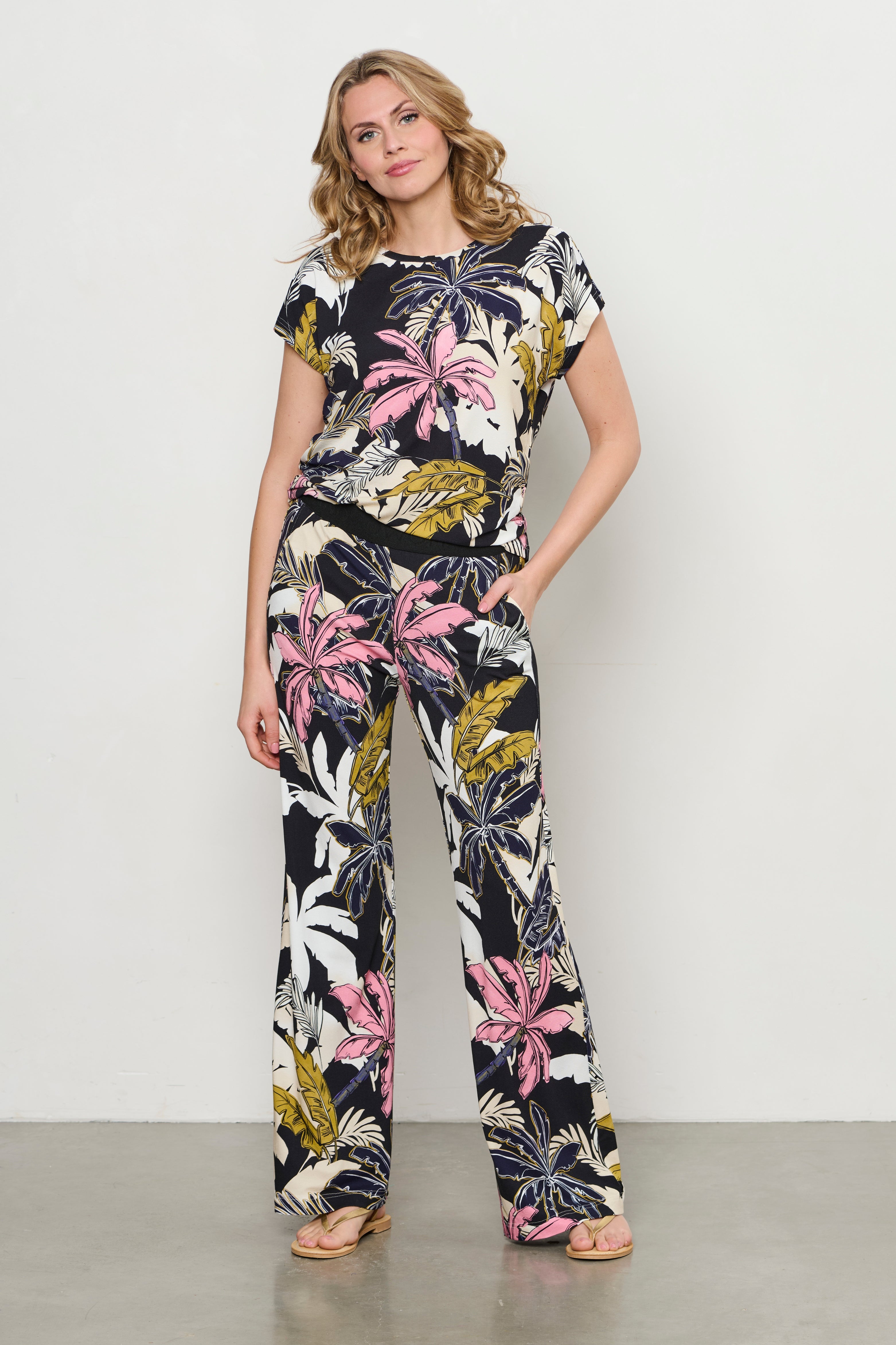 Broek Loa Palm Black Multi van &Co Woman is een opvallende keuze met een tropische palmprint in roze, geel en wit. De soepele stof en wijde pijpen zorgen voor een luchtige, vrouwelijke look – perfect voor zomerse dagen.