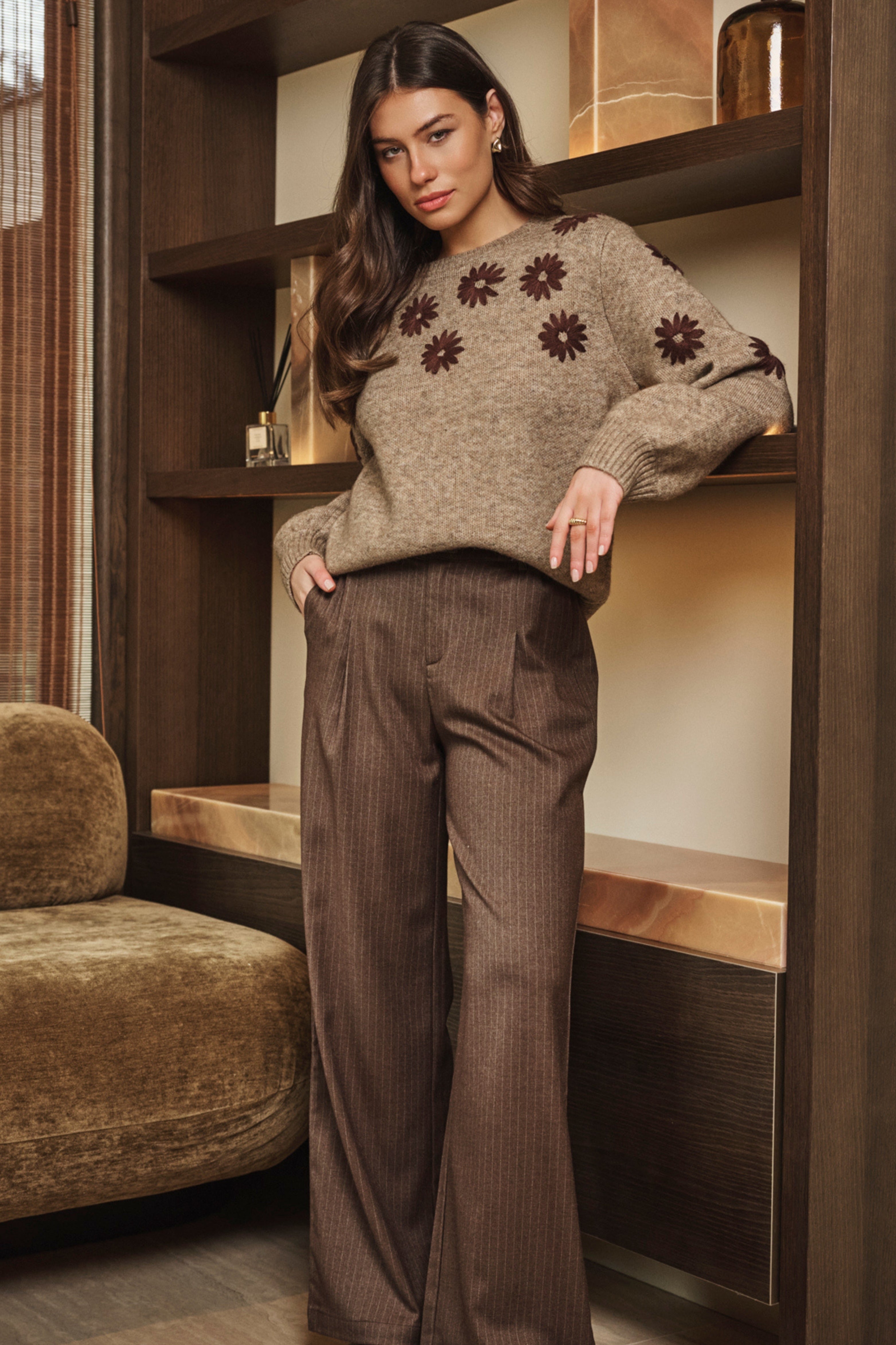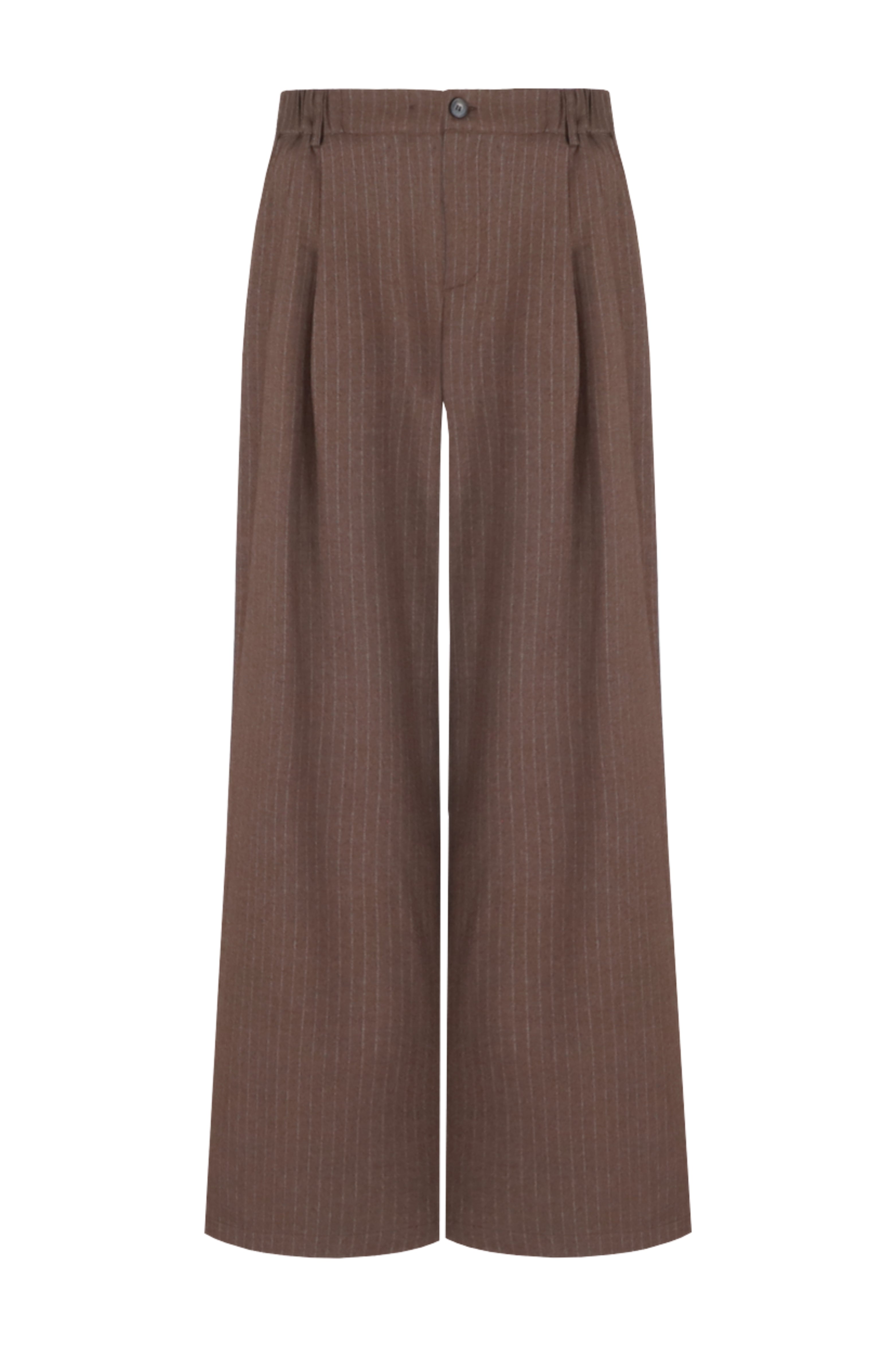 Broek Malala Dark Brown van G-maxx is een elegante wide leg pantalon met een subtiele krijtstreep. De comfortabele fit en tijdloze kleur maken het een perfecte keuze voor zowel werk als vrije tijd.