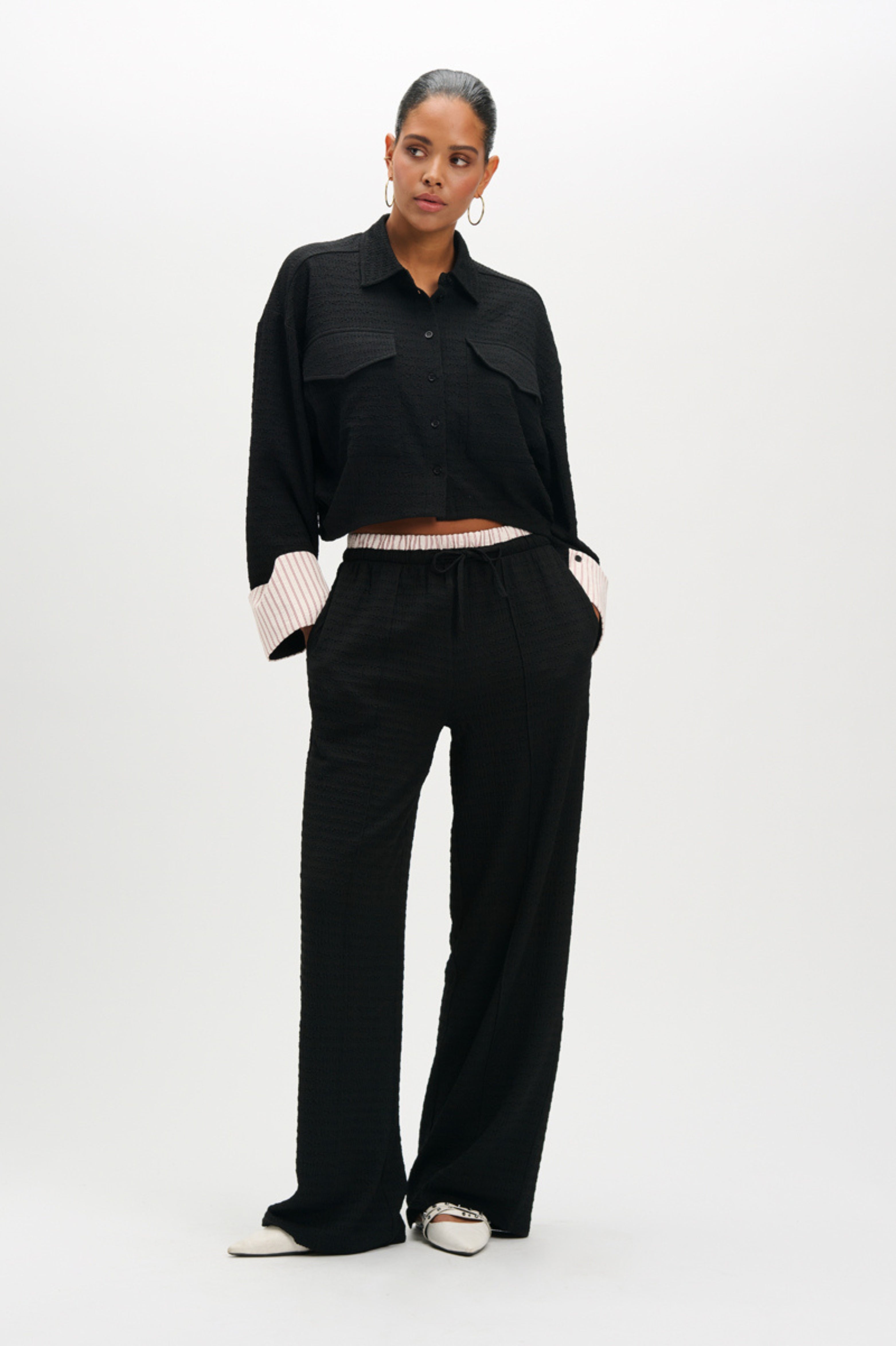 De Broek Mara Black van Refined Department is een echte musthave voor elke garderobe. Het wide-leg model in diepzwart oogt stijlvol en modern, terwijl de gestreepte tailleband met strikkoord zorgt voor een sportieve touch en ultiem draagcomfort.
