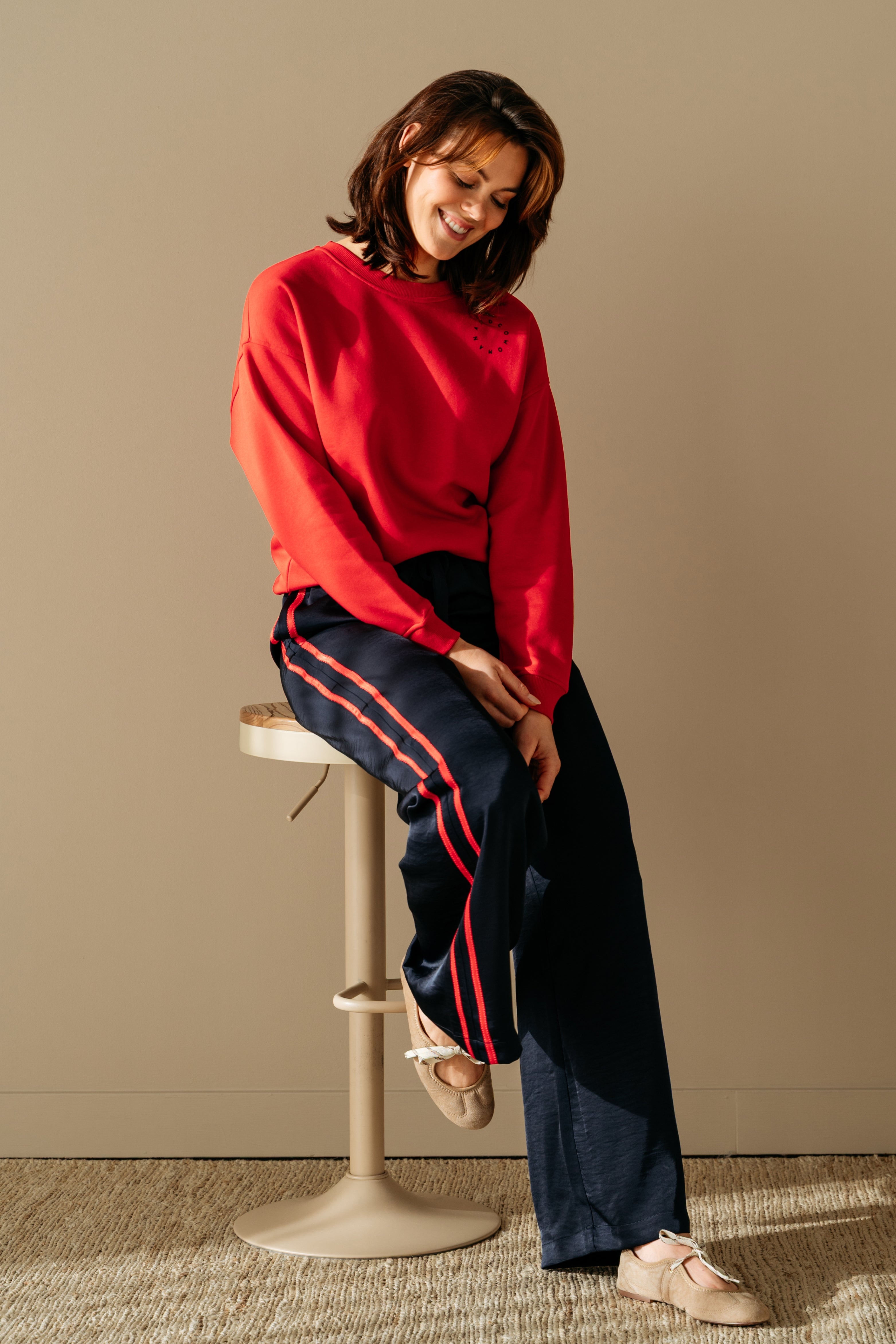 • Het ecom model is 177 cm, het campagne model is 179 cm, beiden dragen maat M