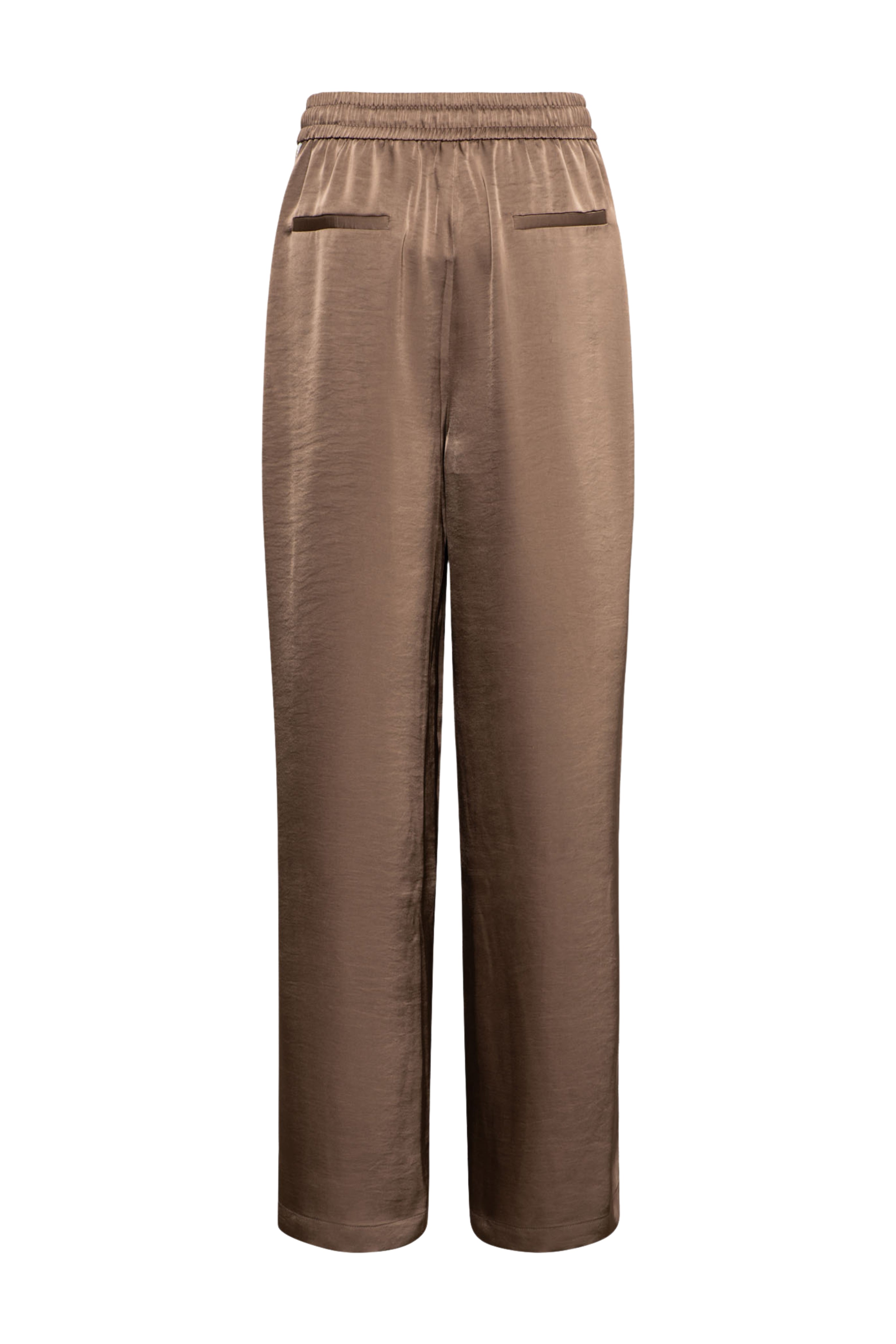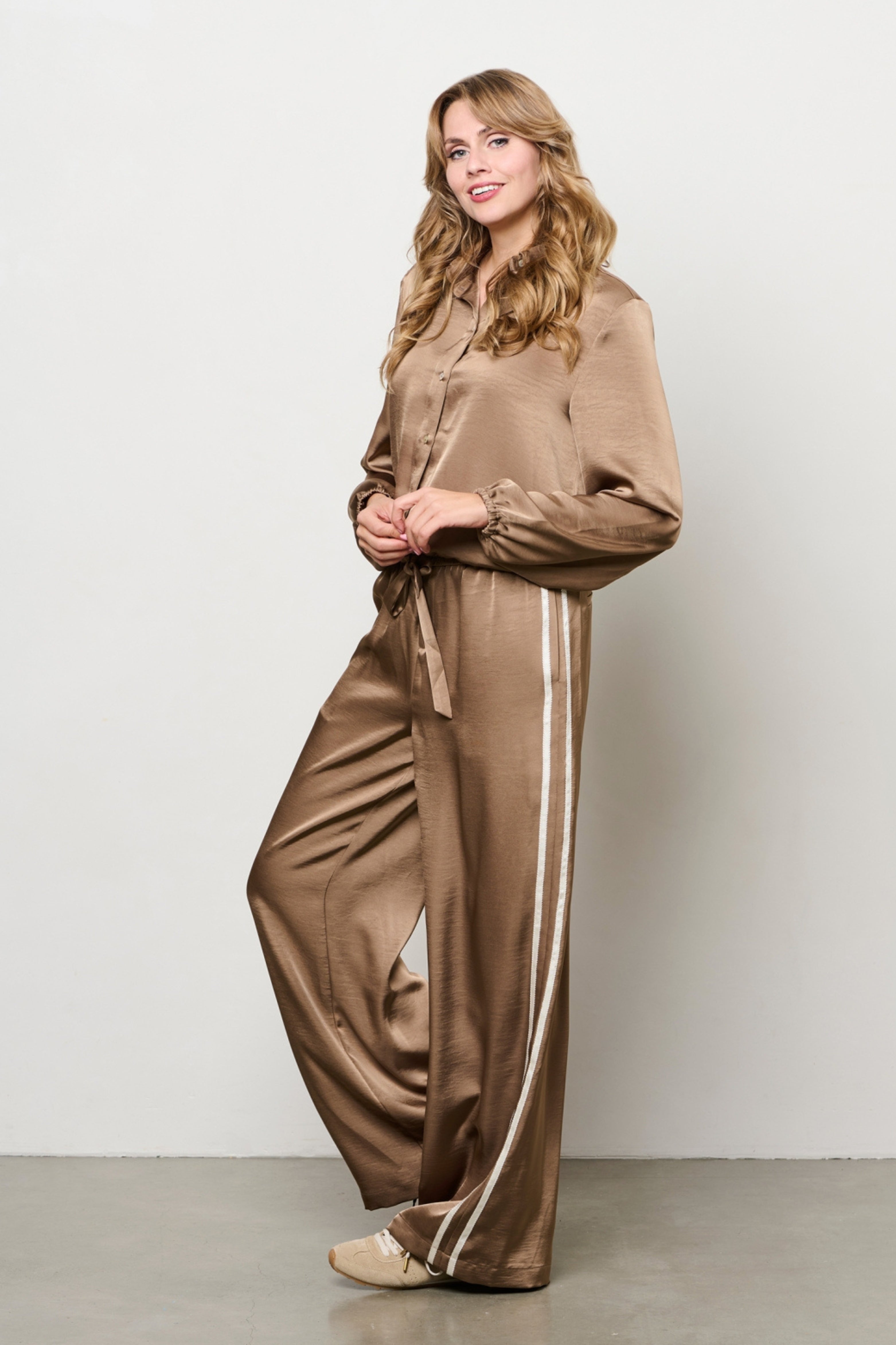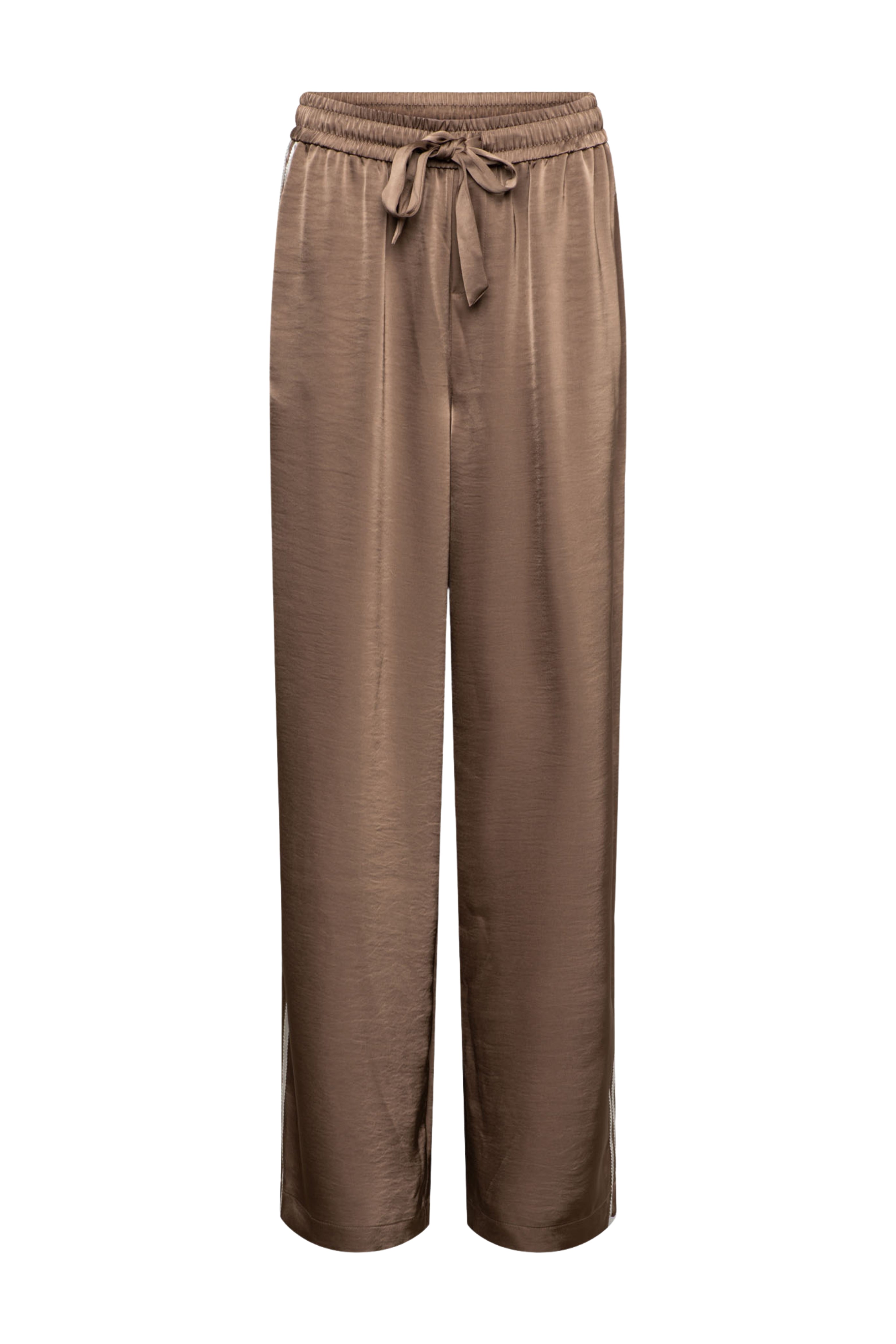 Broek Neomi Taupe is een elegante, soepelvallende broek met een subtiele glans. De elastische tailleband met strikceintuur en de wijde pijpen zorgen voor een comfortabele fit met een luxe uitstraling.