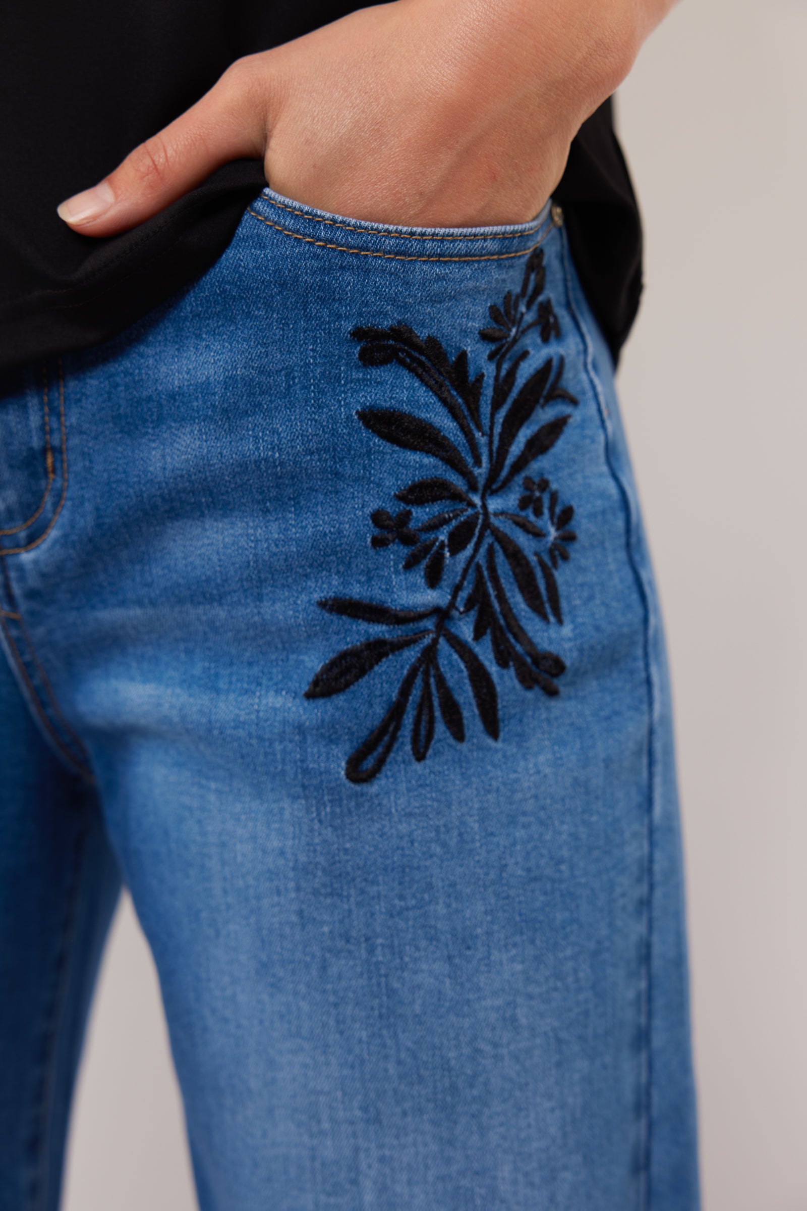 • Geborduurd detail op heup