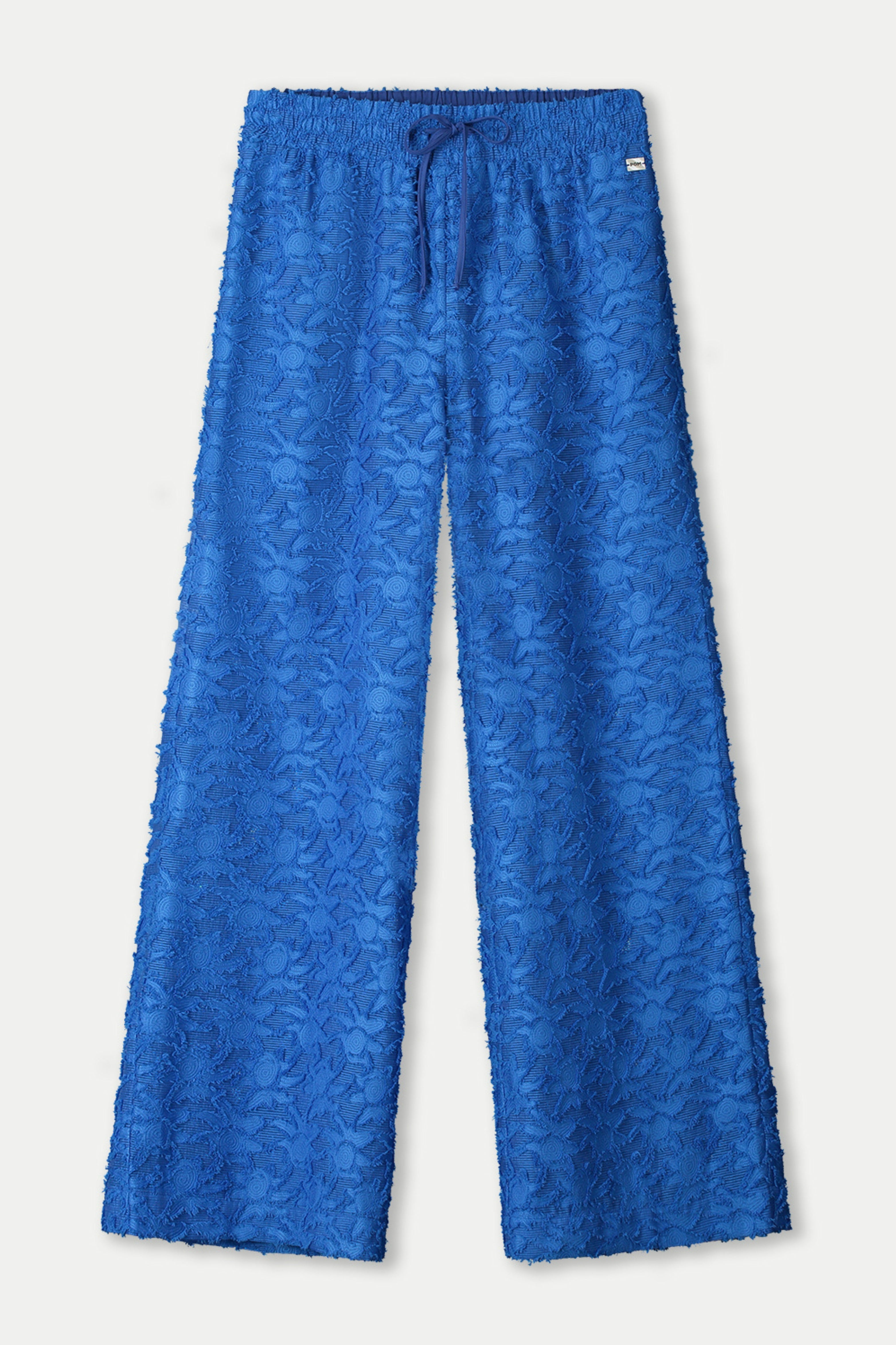 De Broek Ocean Blue Jacquard van POM Amsterdam is een opvallende, wijde broek met rijke jacquardstructuur. De elastische taille met strikkoord en diepe blauwe kleur zorgen voor comfort en een stijlvolle look.