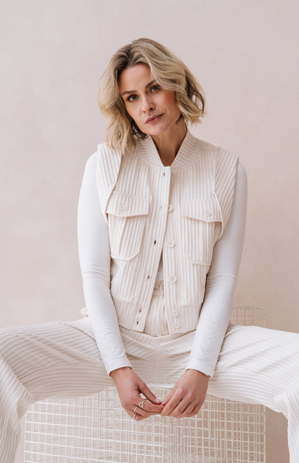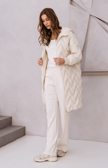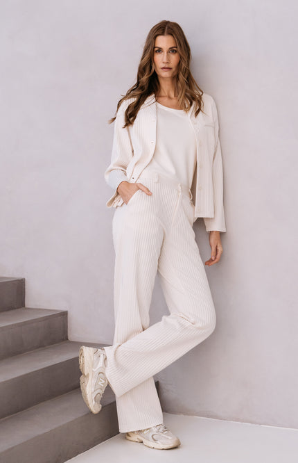 De Parla broek van Maicazz in offwhite is een stijlvolle keuze met een subtiele verticale ribstructuur. De elegante flare pijp en zachte stretchstof zorgen voor ultiem draagcomfort en een flatterende pasvorm voor elk figuurtype.