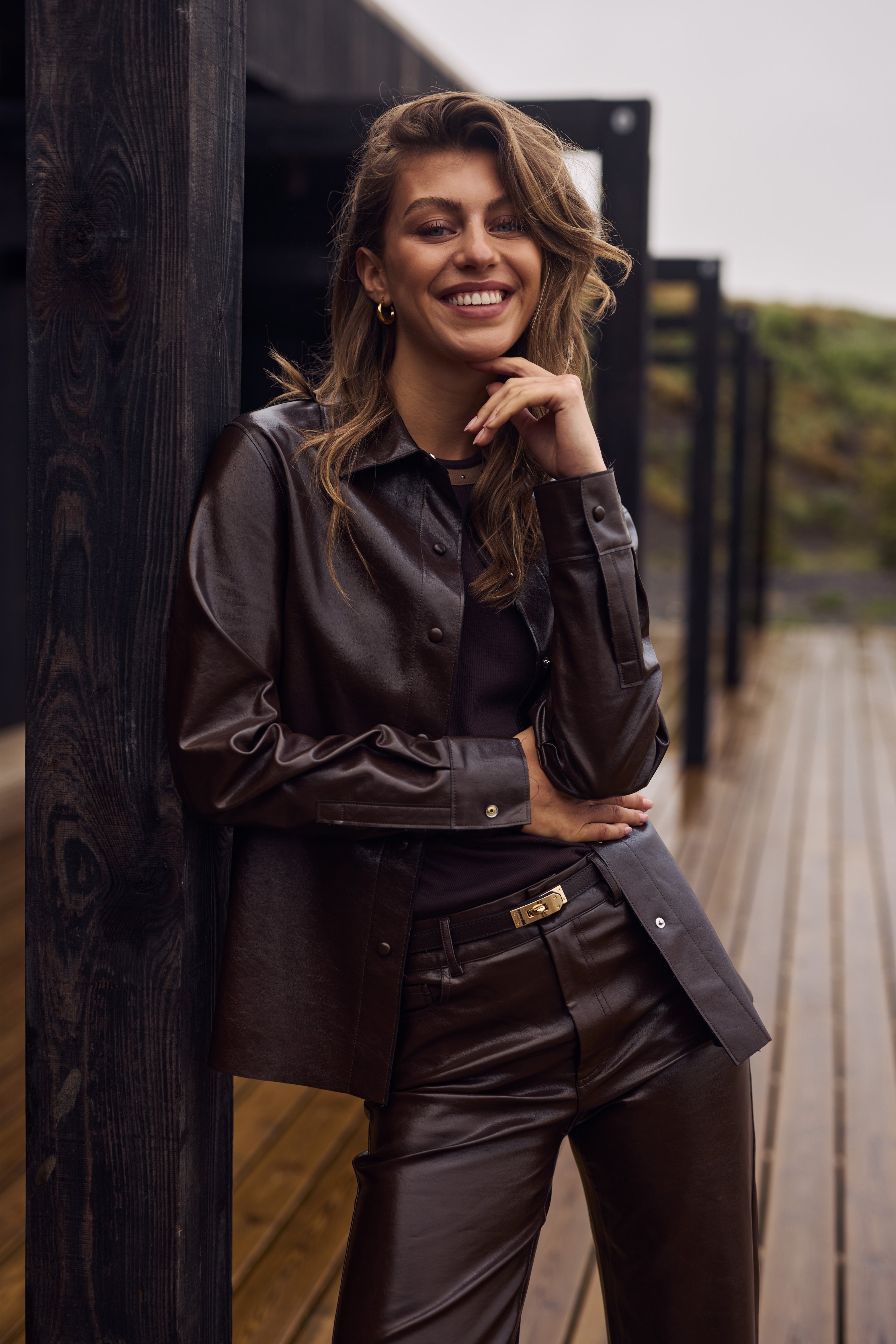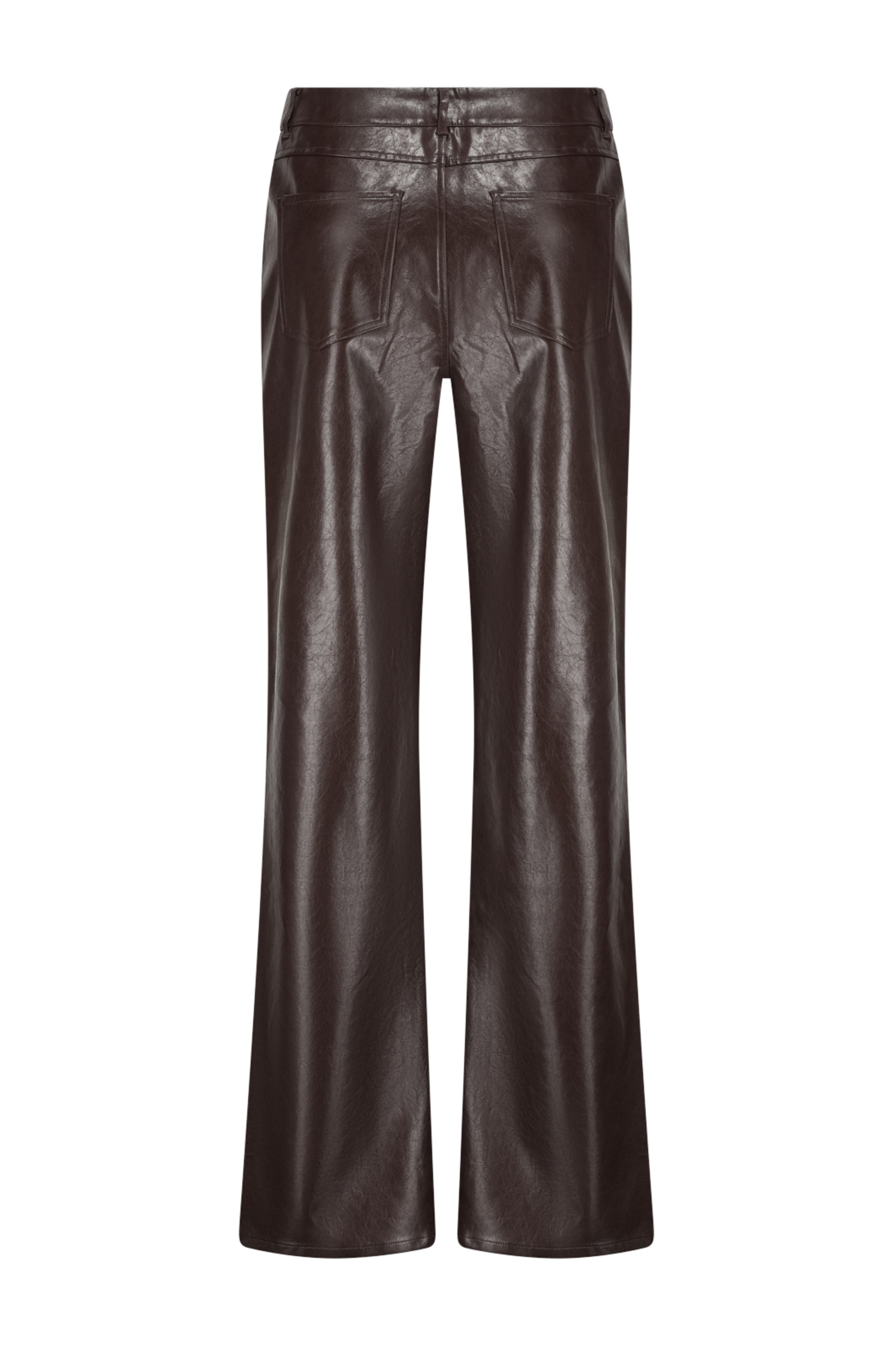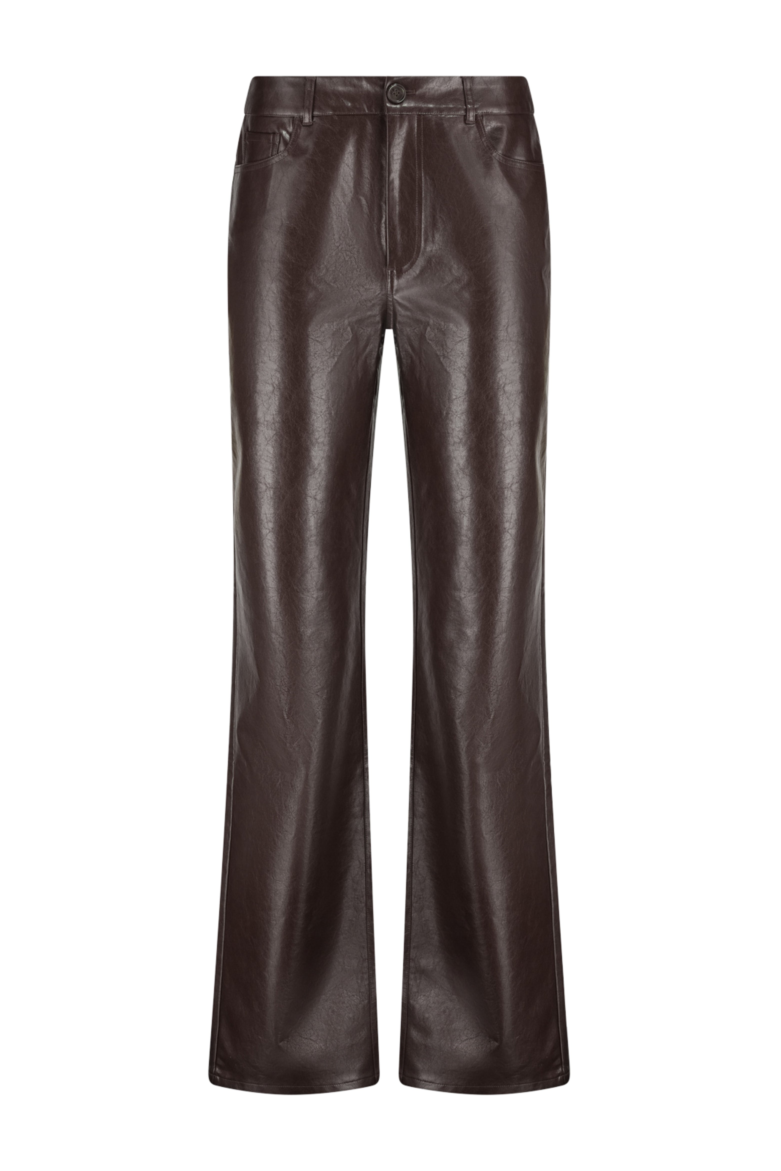 De Broek Patricia Dark Chocolate van Nukus is een stijlvolle broek in leatherlook. Het model heeft een rechte pijp met persvouw, hoge taille en riemlussen. Een tijdloos item dat zowel chic als casual te combineren is.