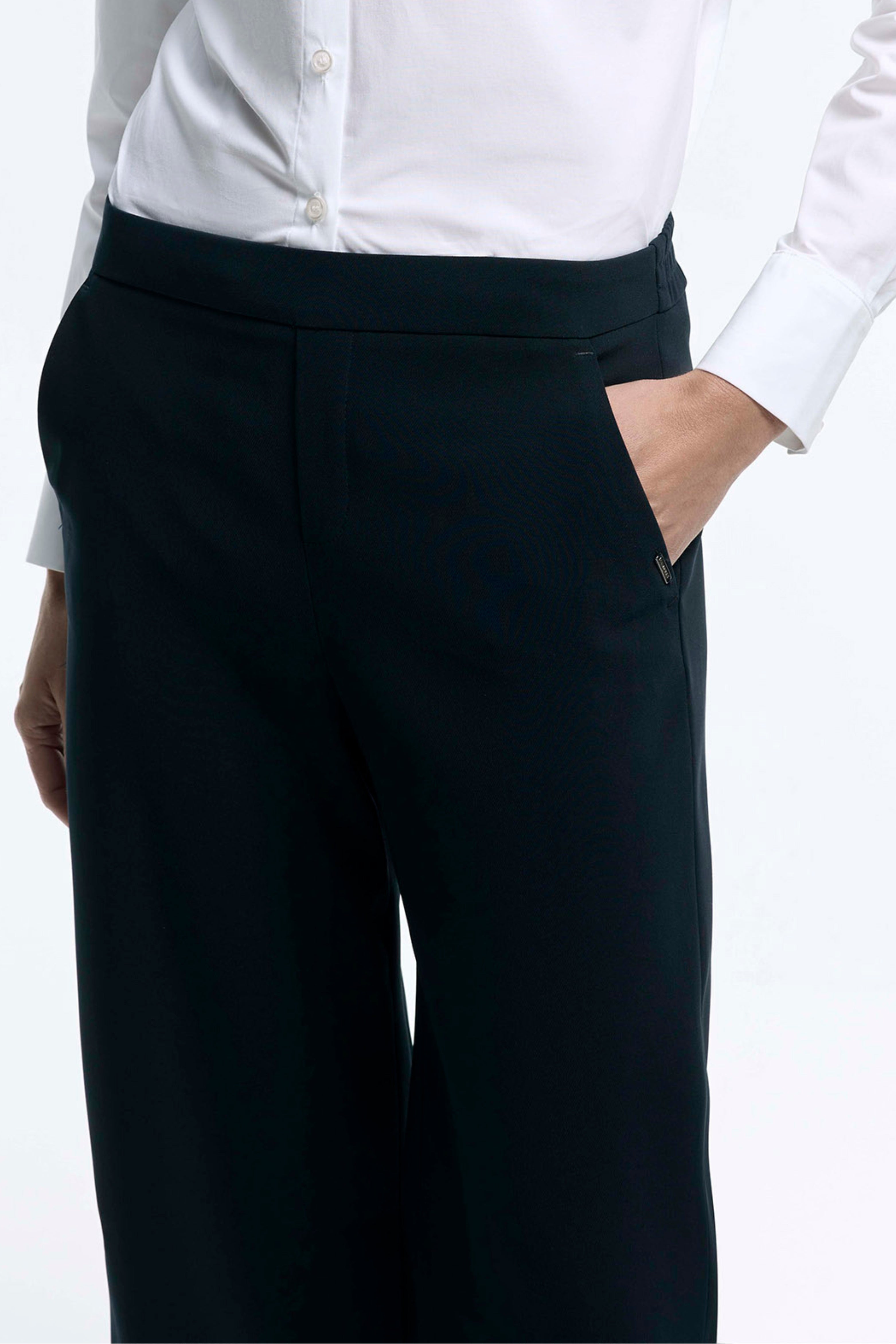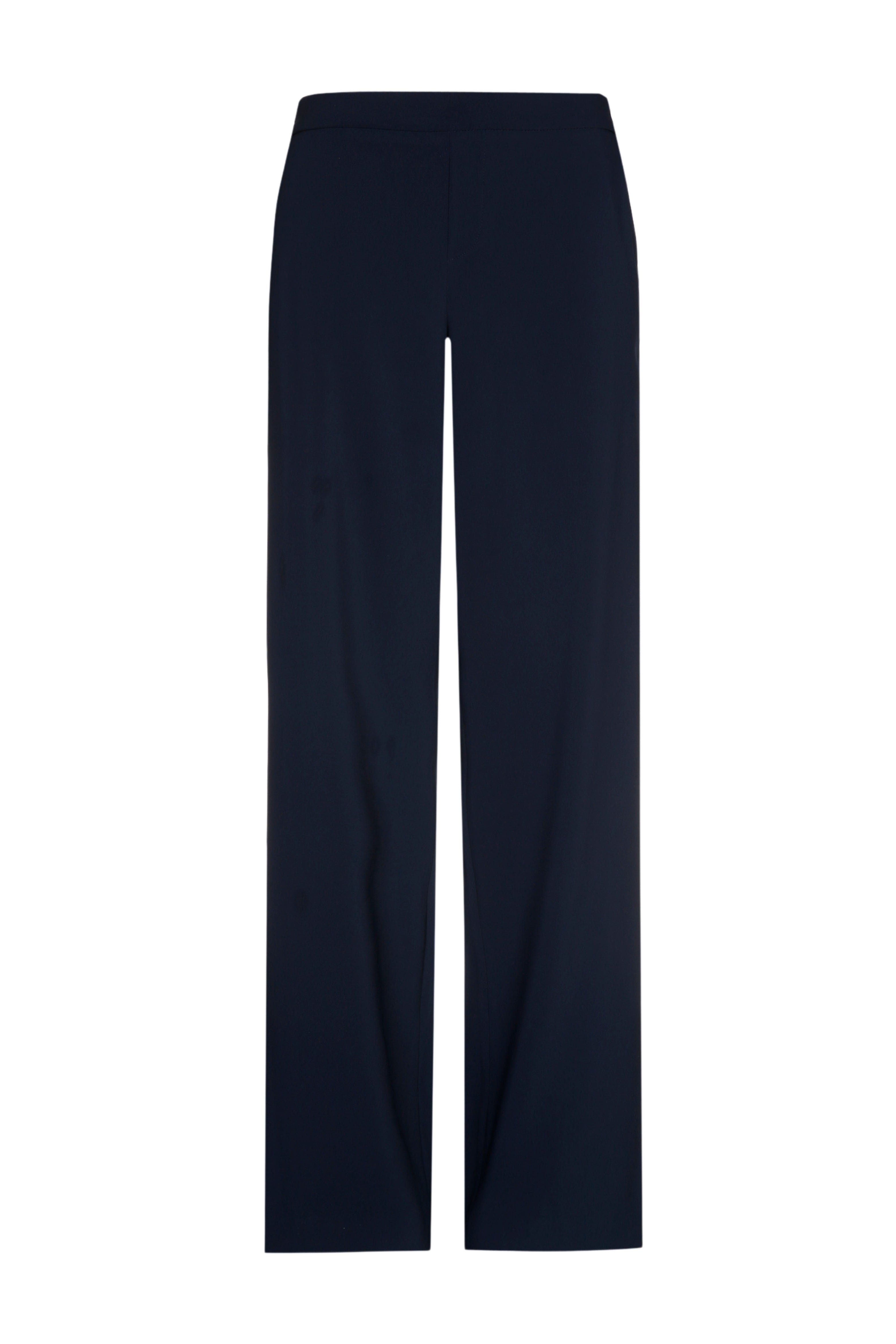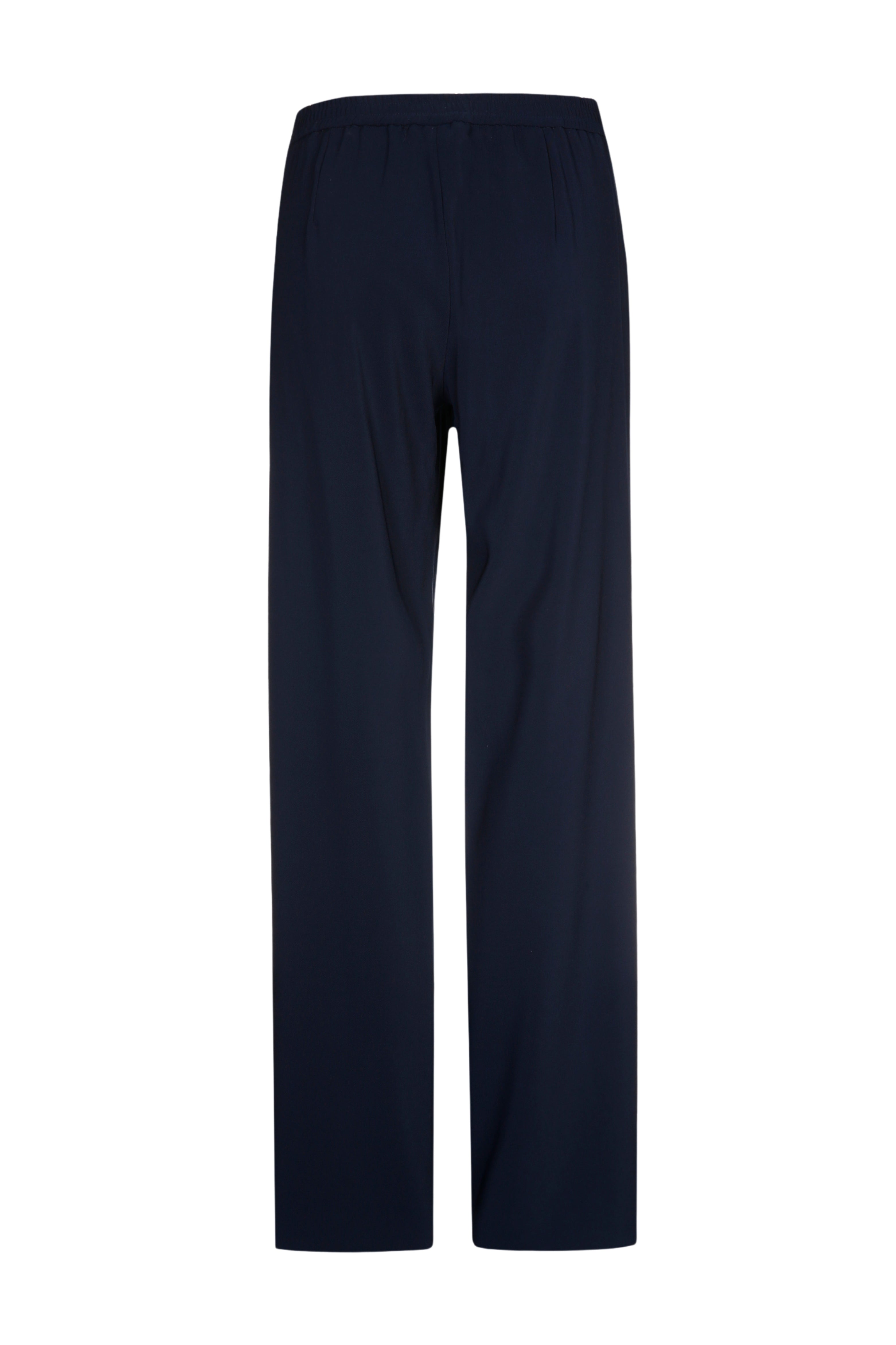 De Broek Phocas Navy van Xandres is een elegante, soepelvallende broek met rechte, wijde pijpen. De elastische tailleband zorgt voor comfort, terwijl de diepe navy kleur deze broek perfect maakt voor werk en avondlooks.