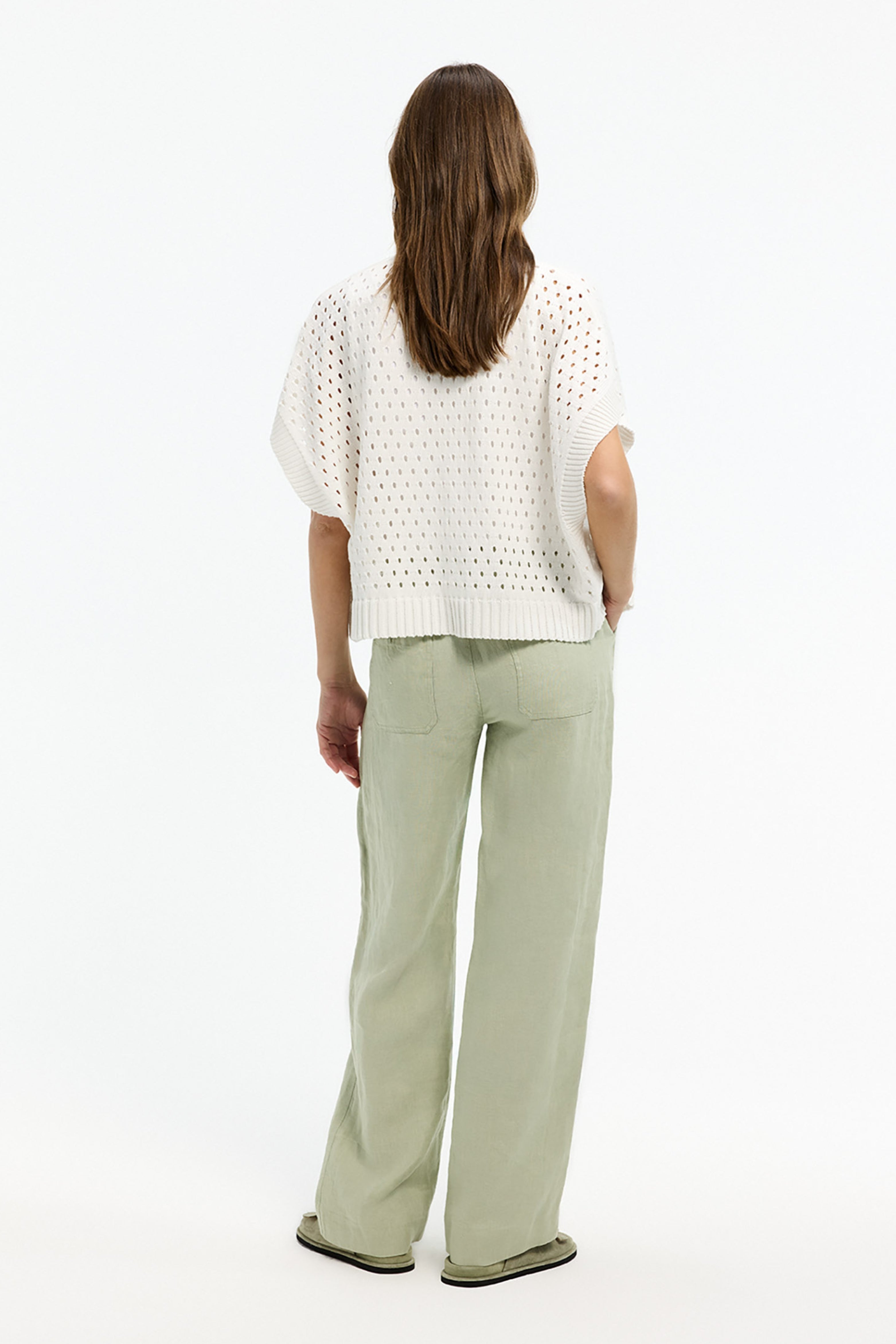 De Broek Phocus Misty Aqua van Xandres is een luchtige, casual broek met rechte, wijde pijpen. De linnenlook en comfortabele taille maken hem ideaal voor zomerse dagen en relaxte citytrips.