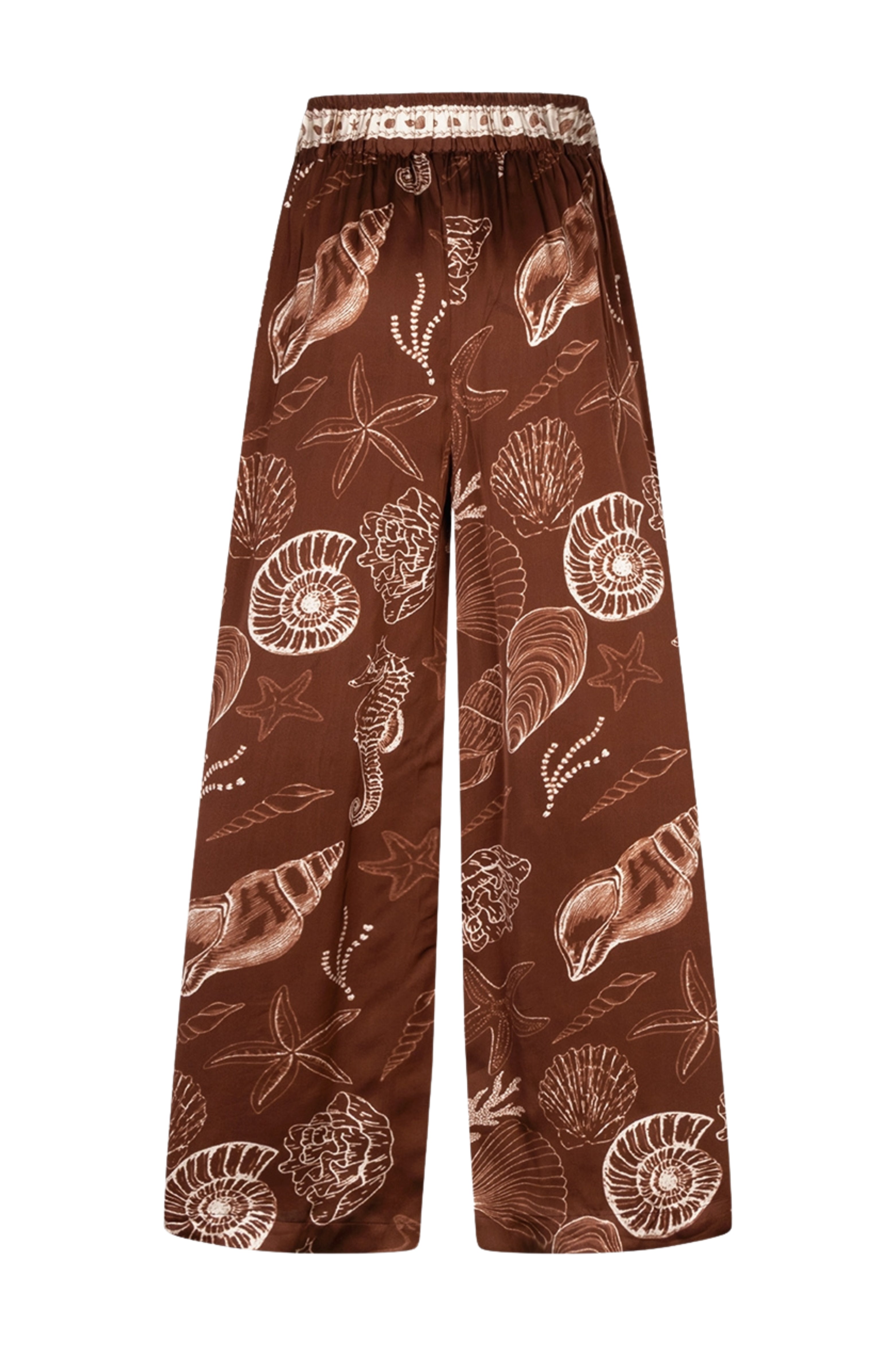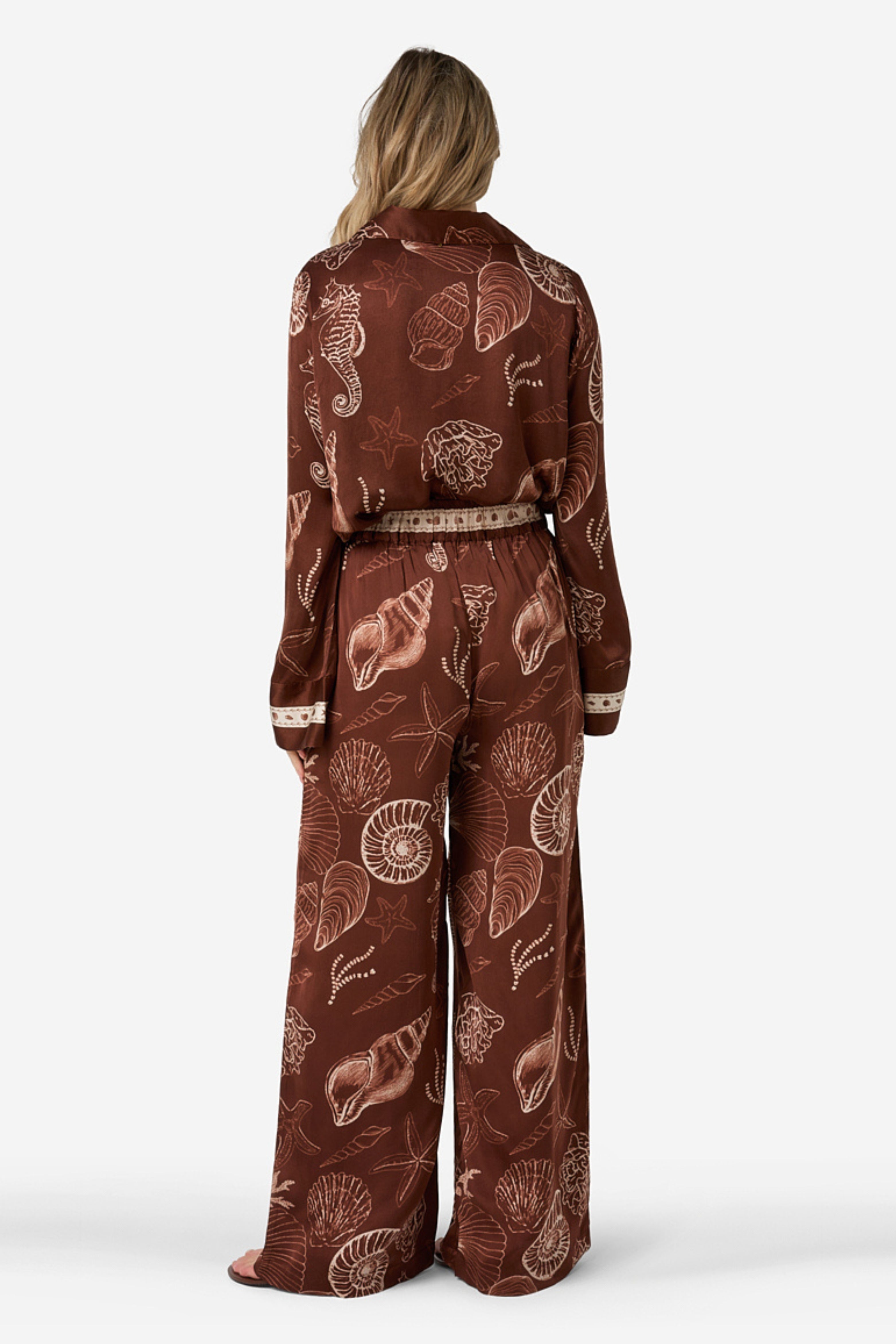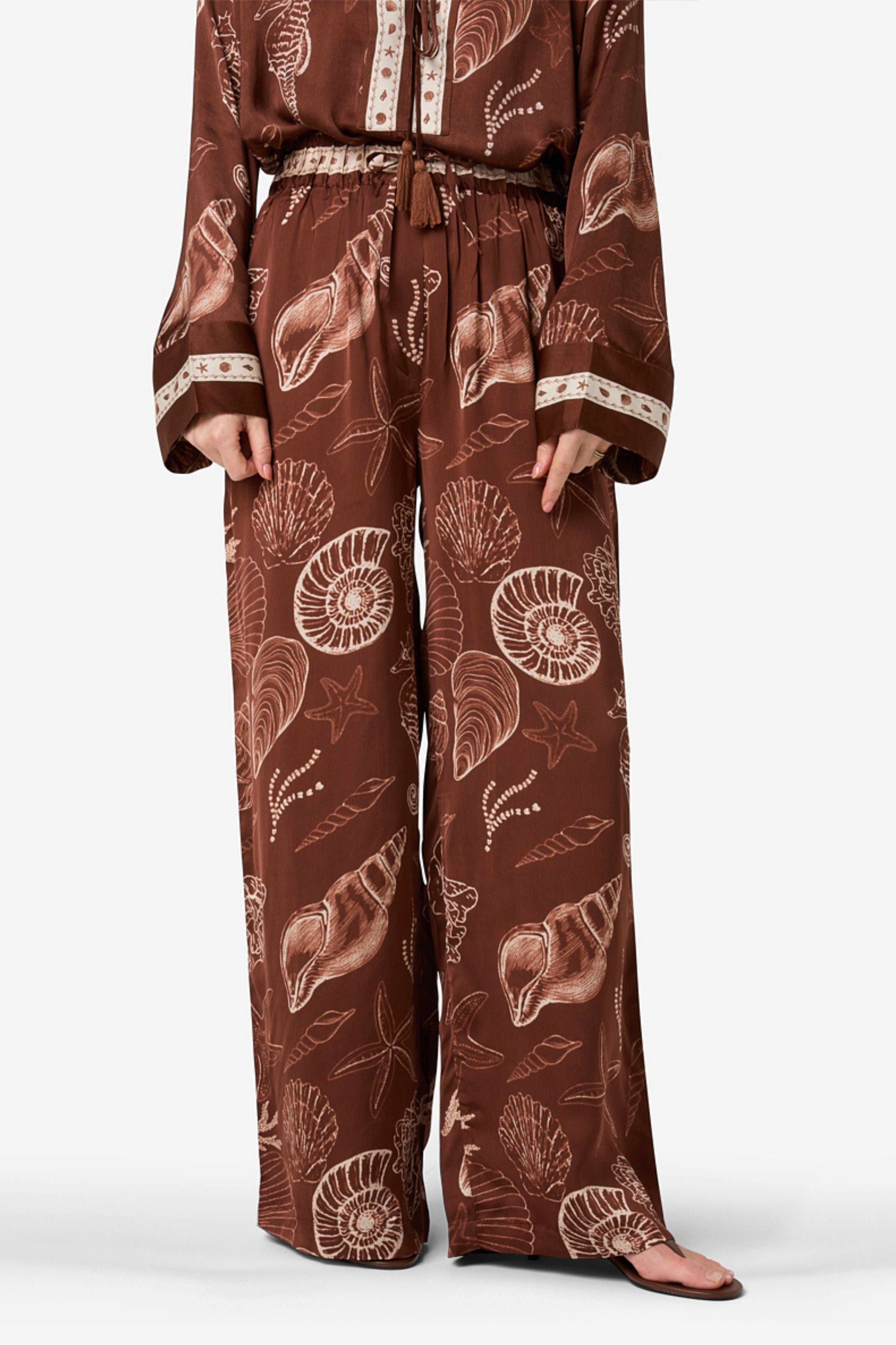 De Broek Piero Shell Marrón van Ibana is een comfortabele en stijlvolle broek met wijde pijpen en een speelse all-over schelpenprint. De luchtige stof en elastische taille zorgen voor een relaxte, zomerse uitstraling met een bohemian touch.