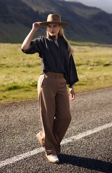 De Seme Camel broek van Nukus combineert elegantie met comfort. De high-waist fit en wijde pijpen zorgen voor een vrouwelijke en stijlvolle uitstraling. Perfect te dragen met blouses of truien โ€“ deze broek tilt elke outfit moeiteloos naar een hoger niveau.