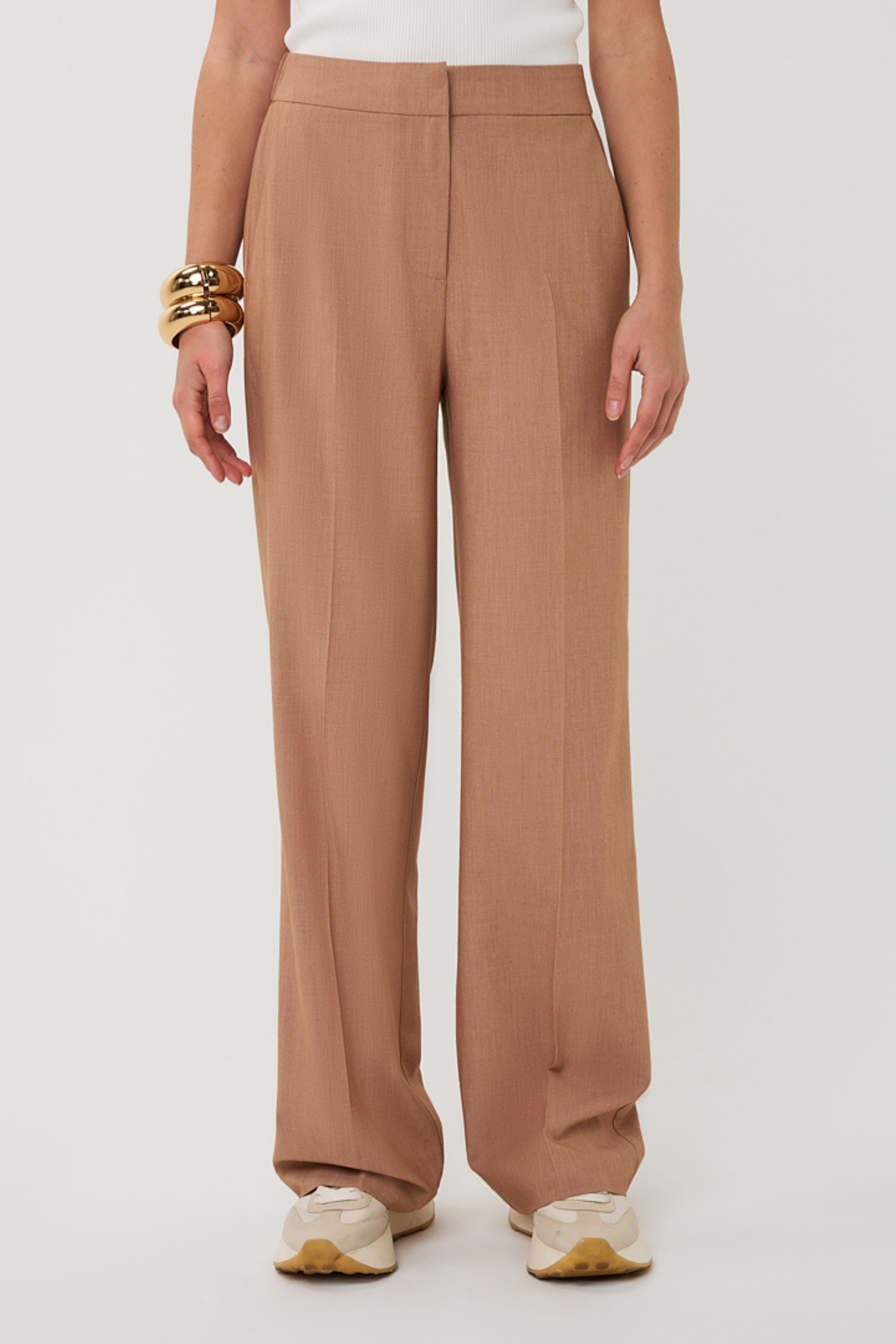 De Broek Straight Melange Cappuccino van Esqualo is een elegante broek met rechte pijpen. De zachte melangestof en nette persplooien creëren een tijdloze, comfortabele look. Perfect voor kantoor of een etentje.