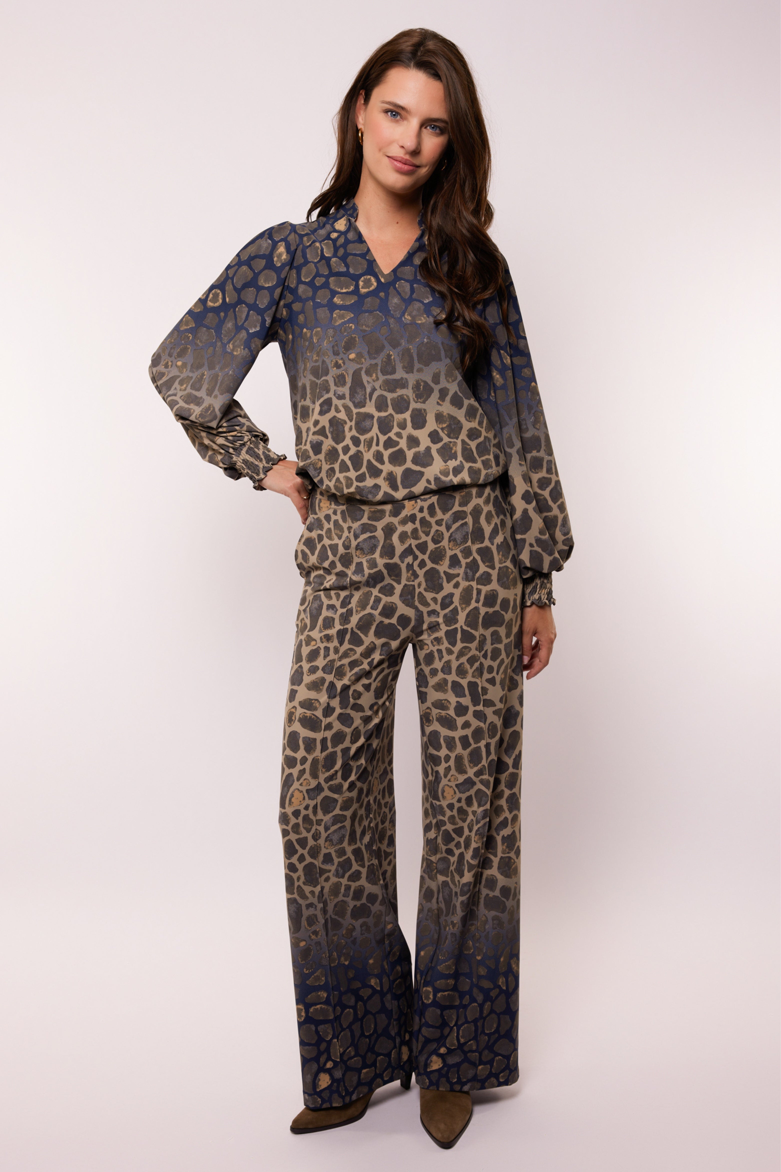 Broek Tahlia Sahara Dark Night Blue van G-maxx is een soepelvallende wide leg broek met een opvallende leopardprint in ombre-effect. De combinatie van zandtinten met diep nachtblauw geeft deze broek een luxe uitstraling.