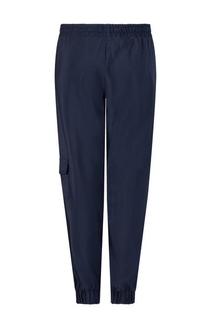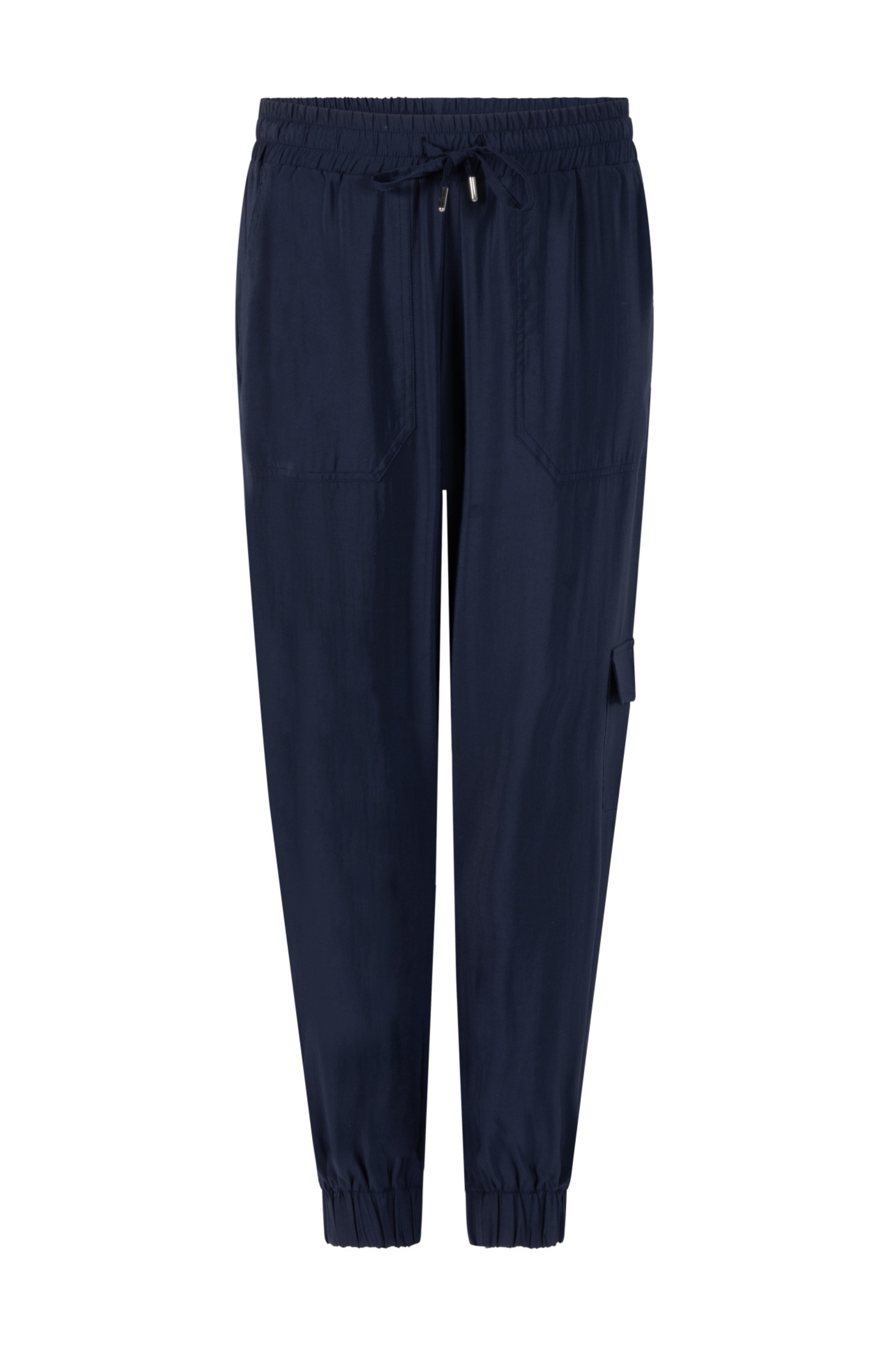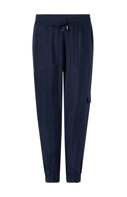 De Broek Vera Navy van Zoso is een sportieve broek met cargozak, elastische boorden en een comfortabele pasvorm. Gemaakt van een luchtige stof met subtiele glans.