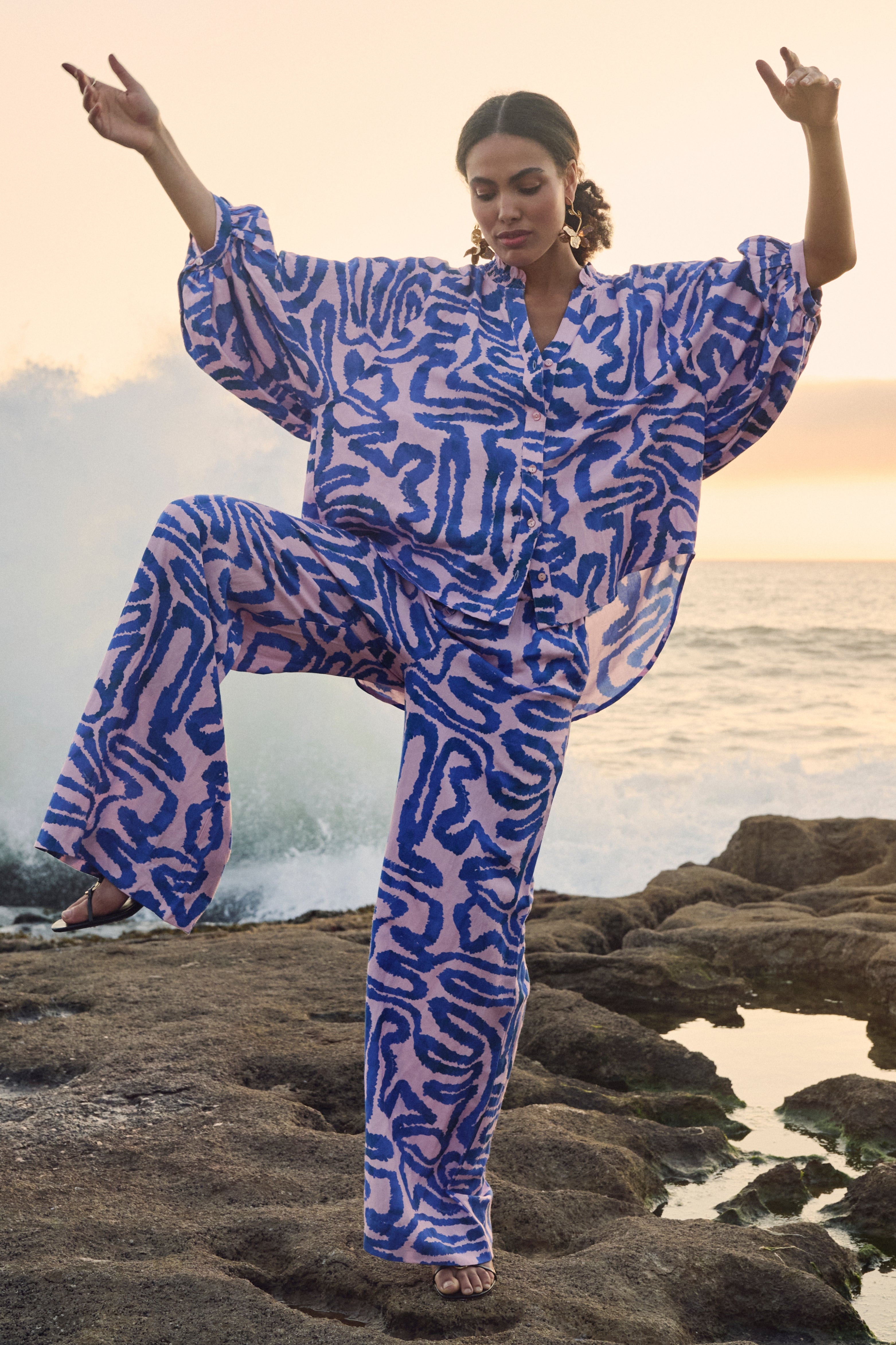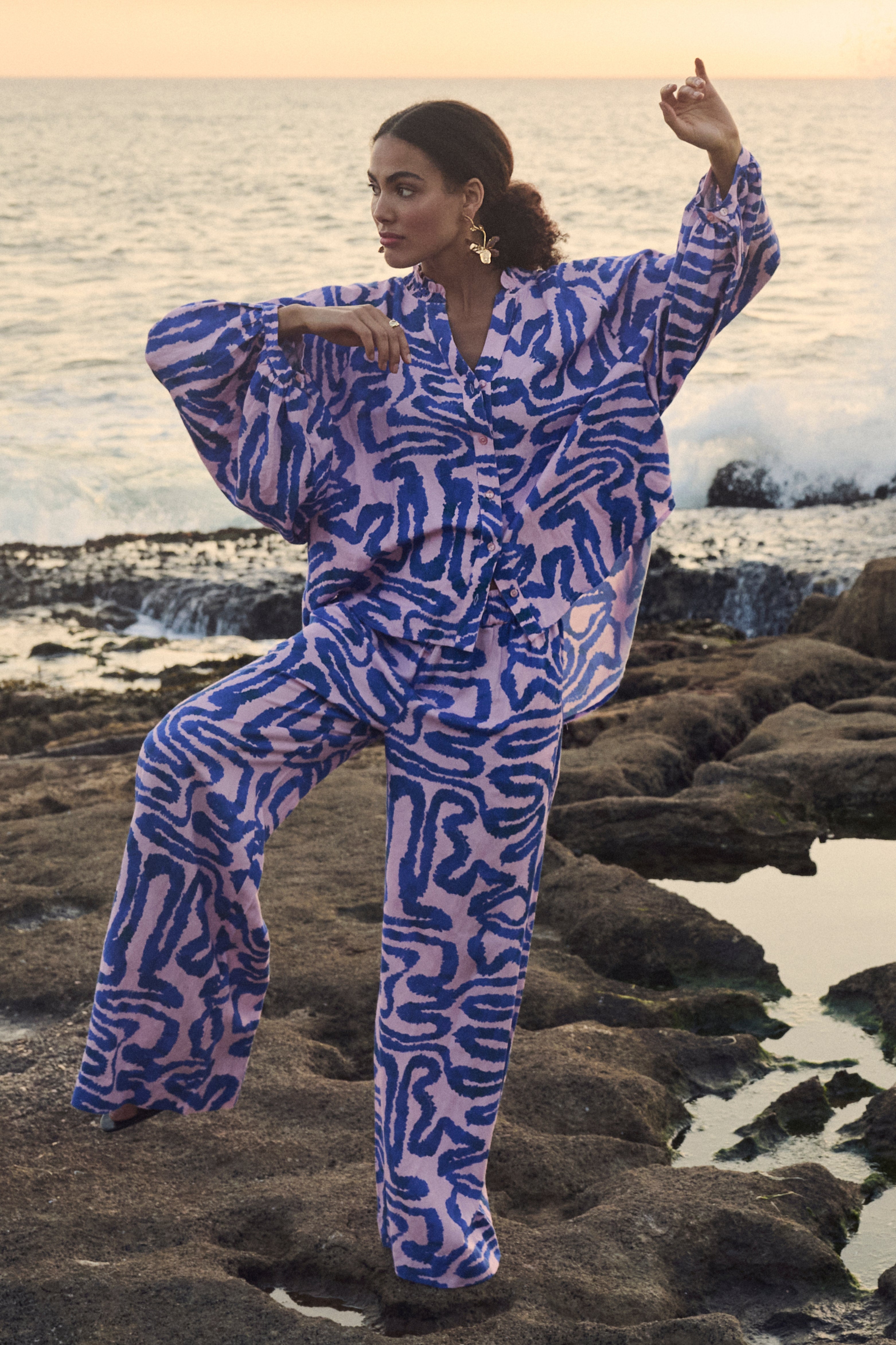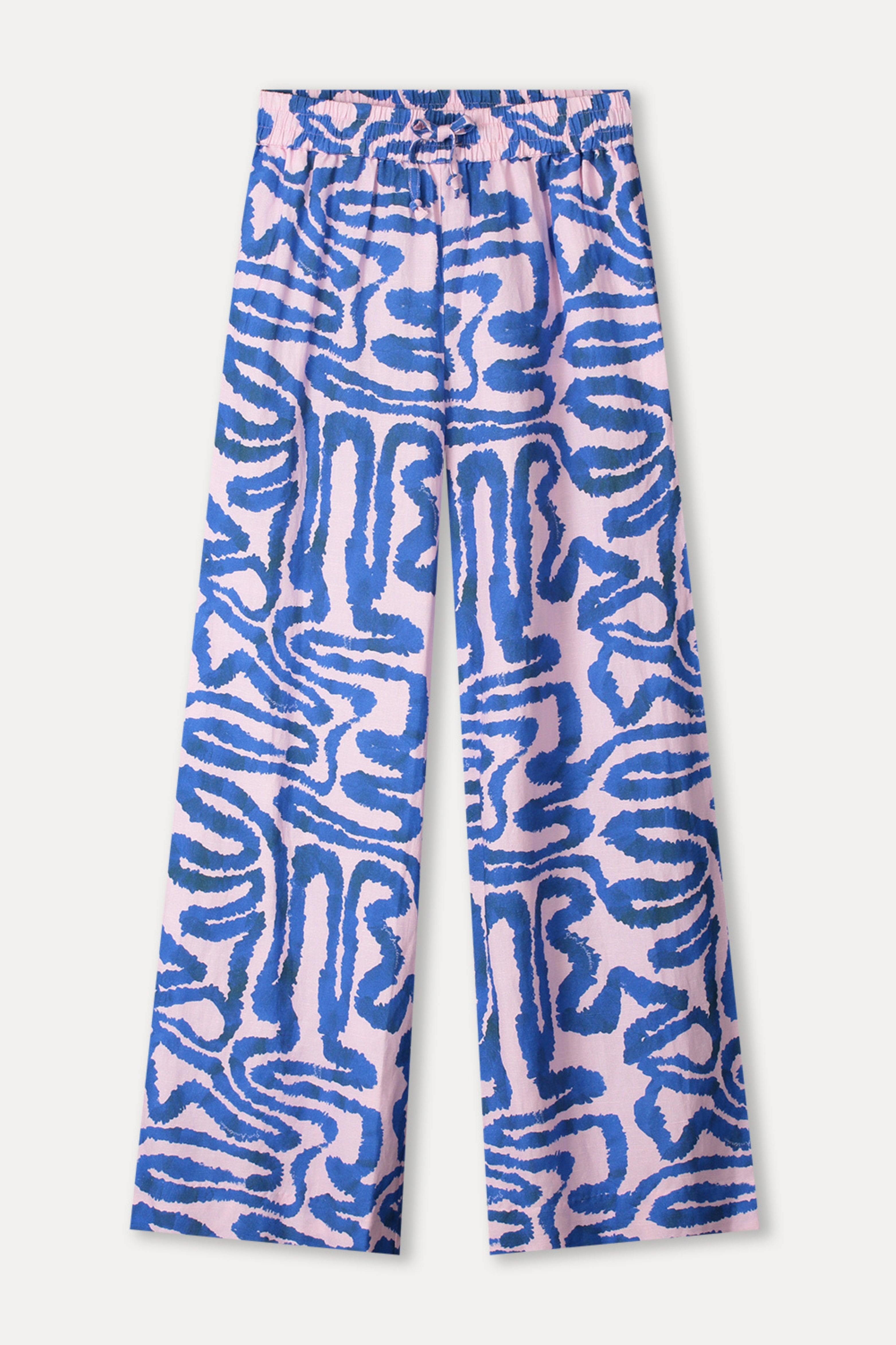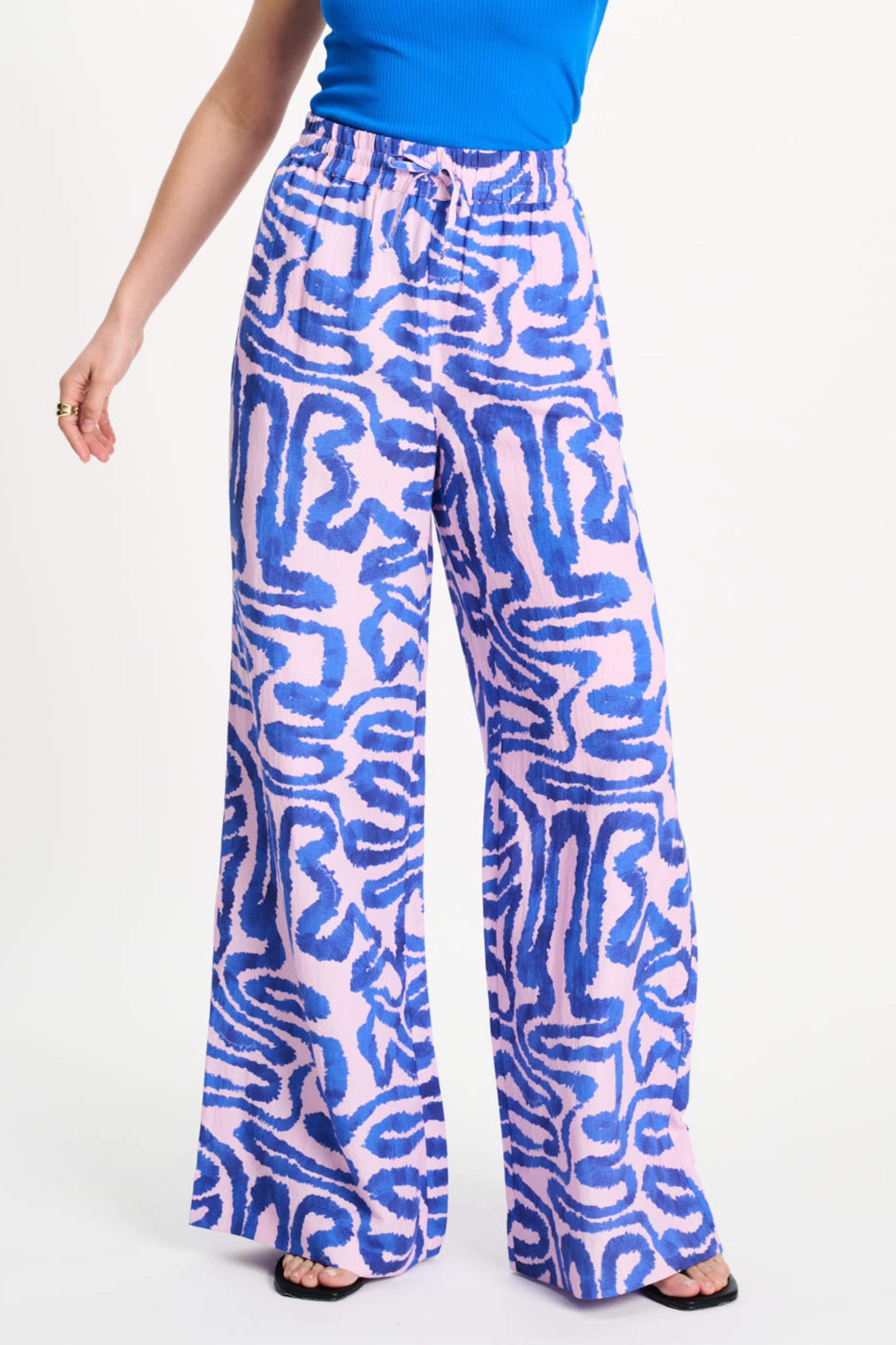 De Broek Waves Pink Linen Multi Colour van POM Amsterdam is een luchtige, wijde broek met een speels golvend dessin. De roze basis met blauwe accenten en het comfortabele linnen materiaal zorgen voor een zomerse, stijlvolle look.