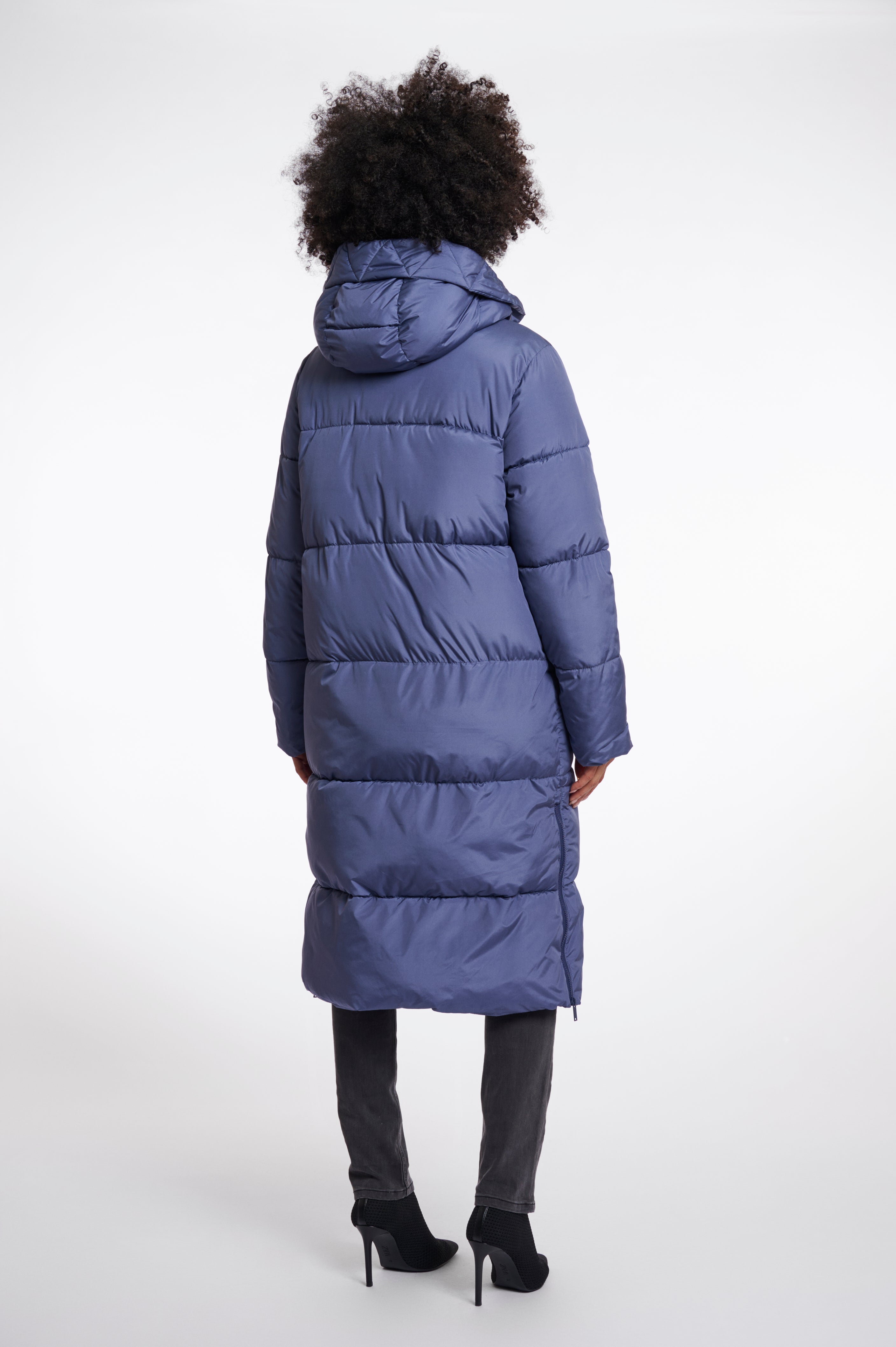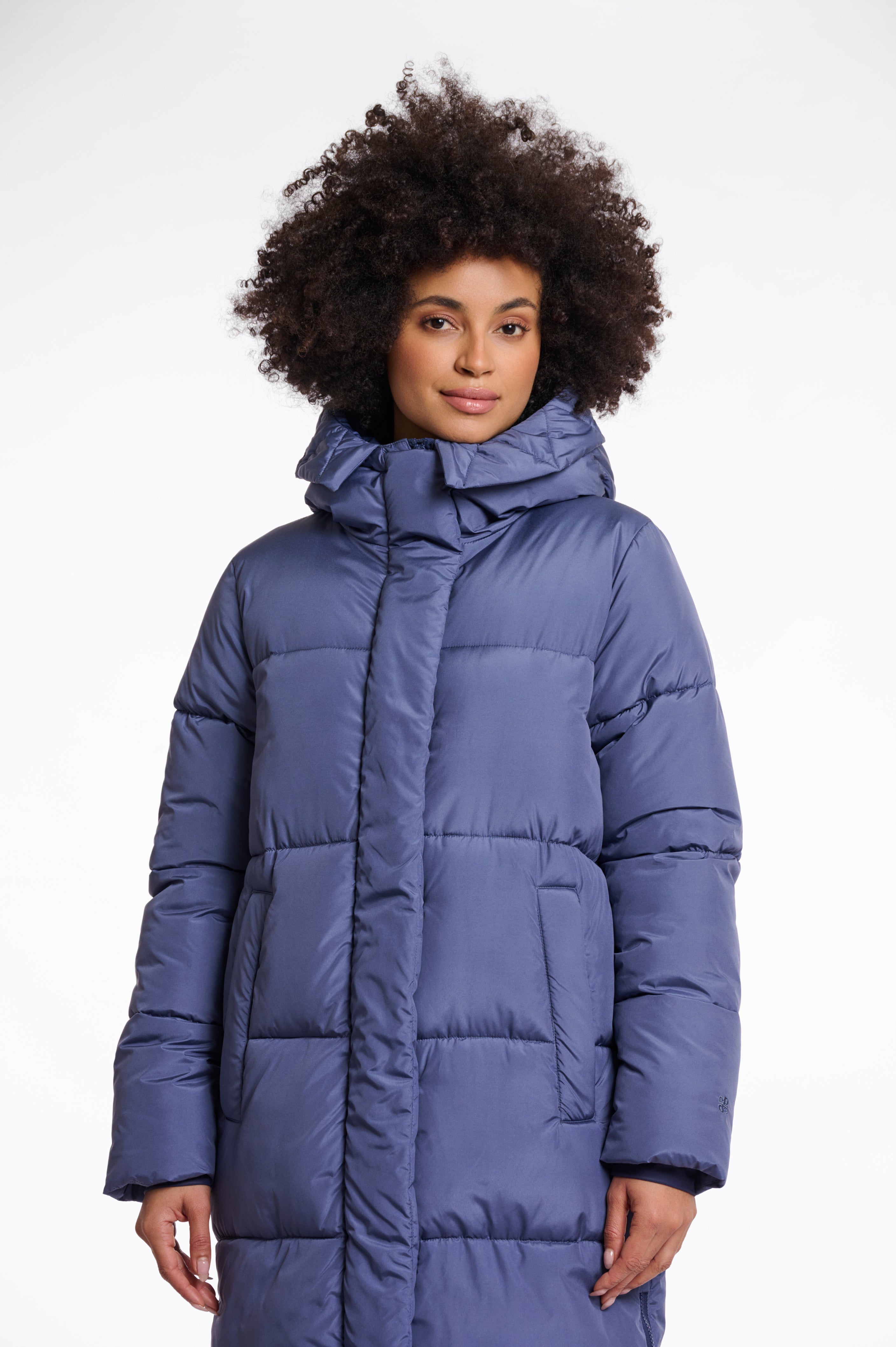 De Tessa Coat Blue Shadow van Rino & Pelle is een stijlvolle lange gewatteerde jas die warmte, comfort en een moderne uitstraling combineert. De jas heeft een rechte pasvorm en een matte, waterafstotende buitenlaag in een elegante blauwgrijze tint.