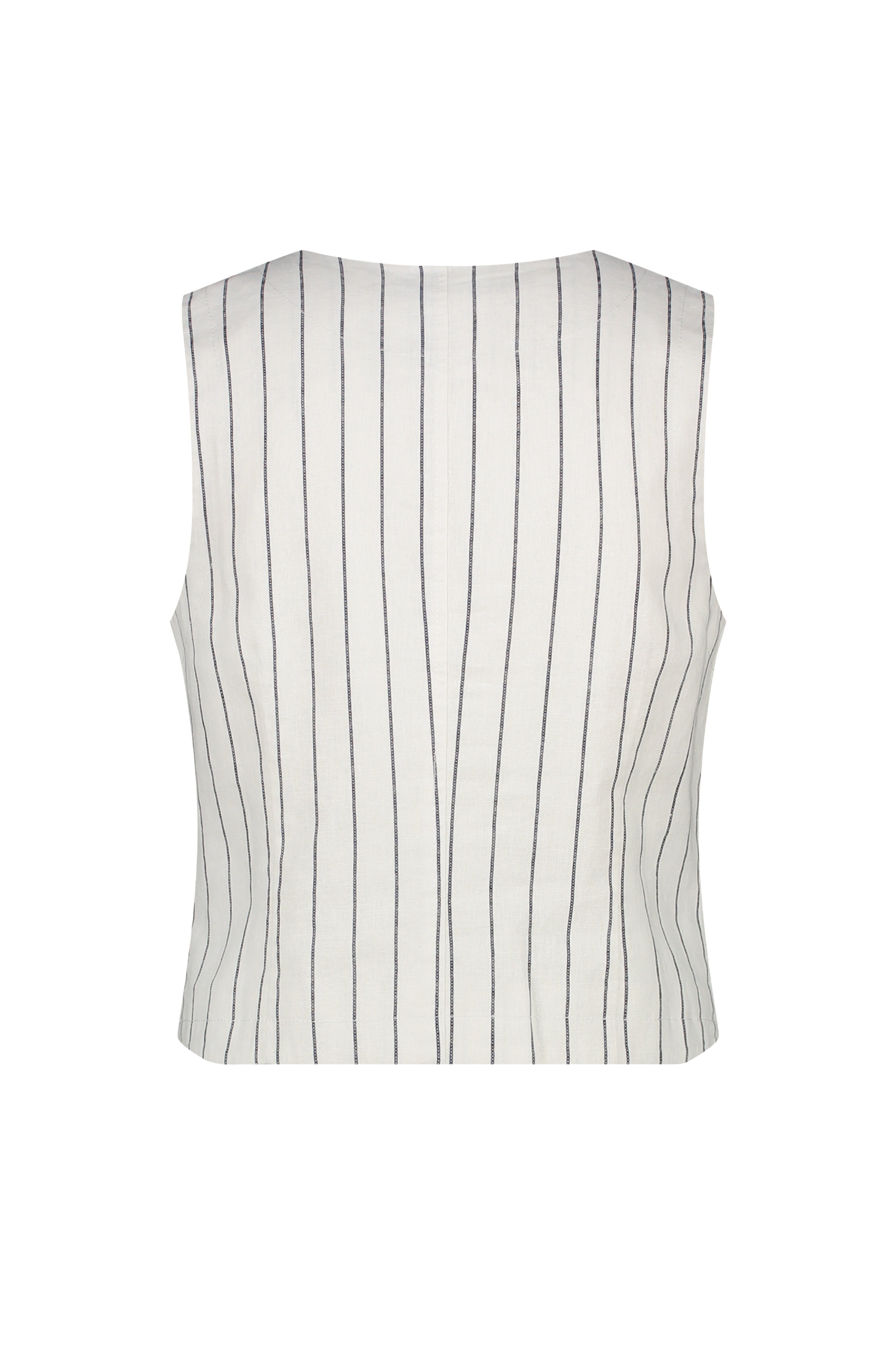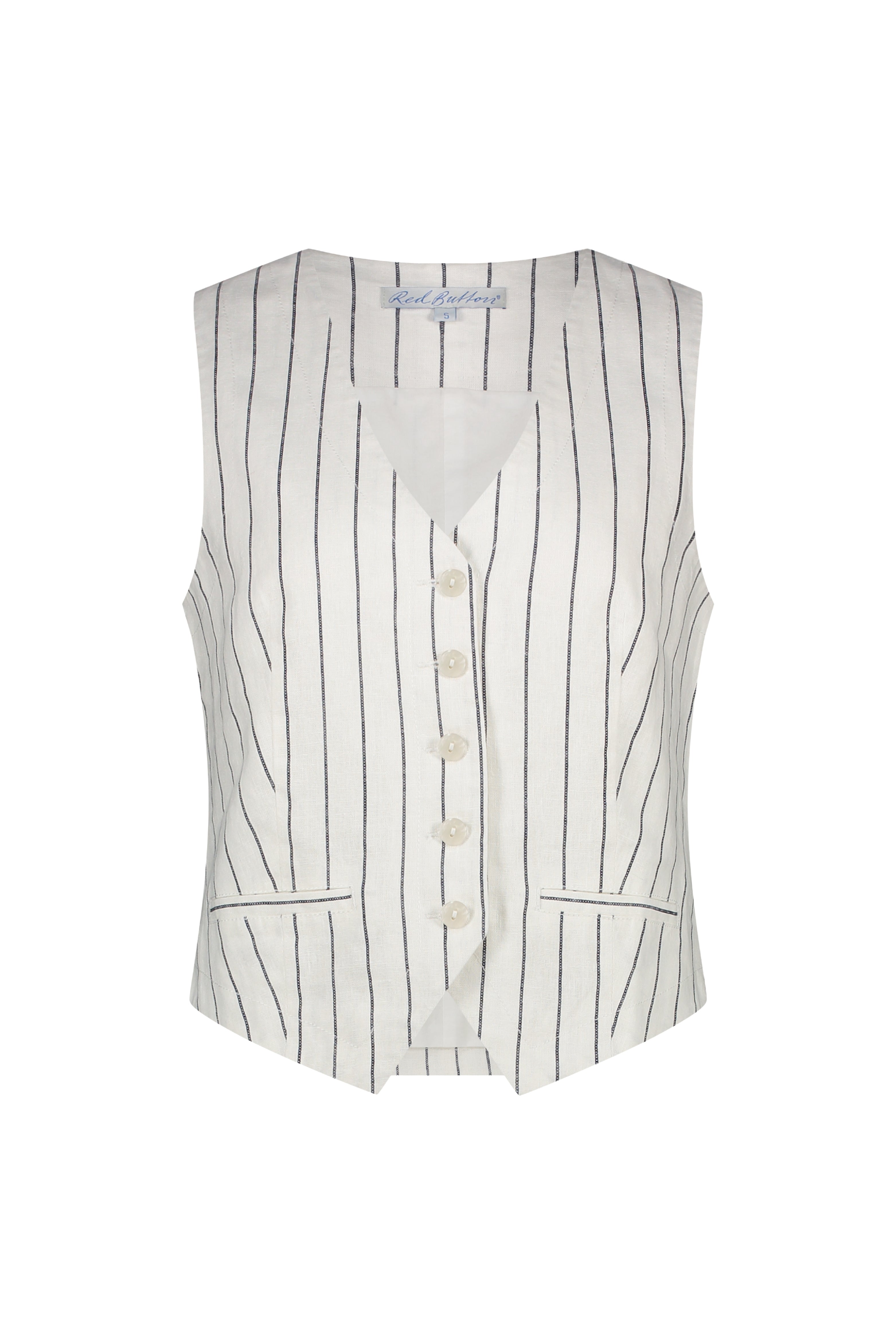 Gilet Cotton Linen Stripe Navy van Red Button is een stijlvol en luchtig gilet met een klassieke streep. De knoopsluiting en subtiele details zorgen voor een tijdloze uitstraling. Dankzij de lichte stofmix van katoen en linnen is het perfect voor warme dagen en ideaal om een outfit een extra stijlvolle touch te geven.