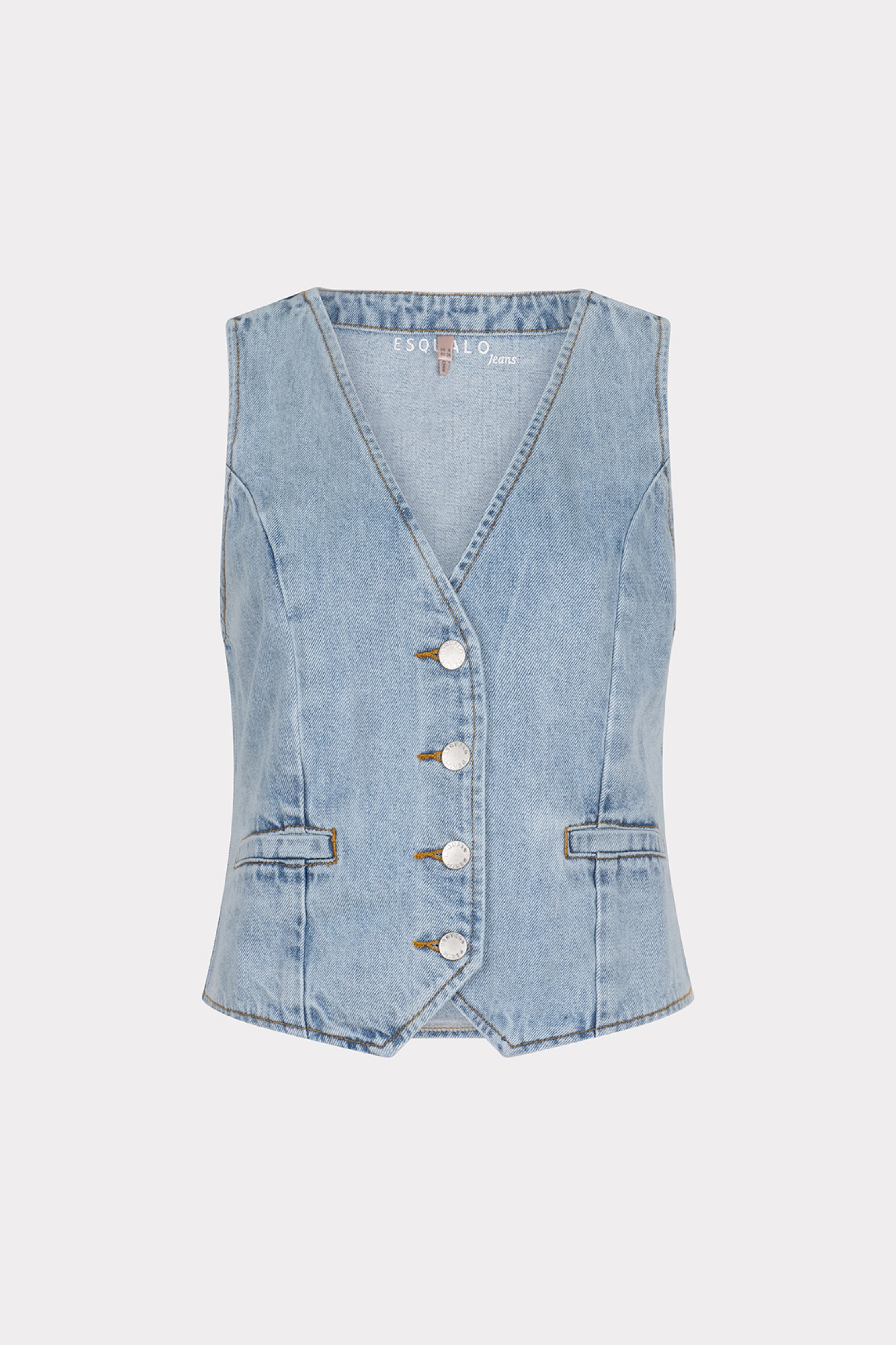 De Gilet Denim Blue van Esqualo is een stijlvol mouwloos gilet in een klassieke denimlook. Voorzien van een V-hals, knoopsluiting en subtiele zakdetails. Perfect te combineren voor een casual of trendy gelaagde outfit.