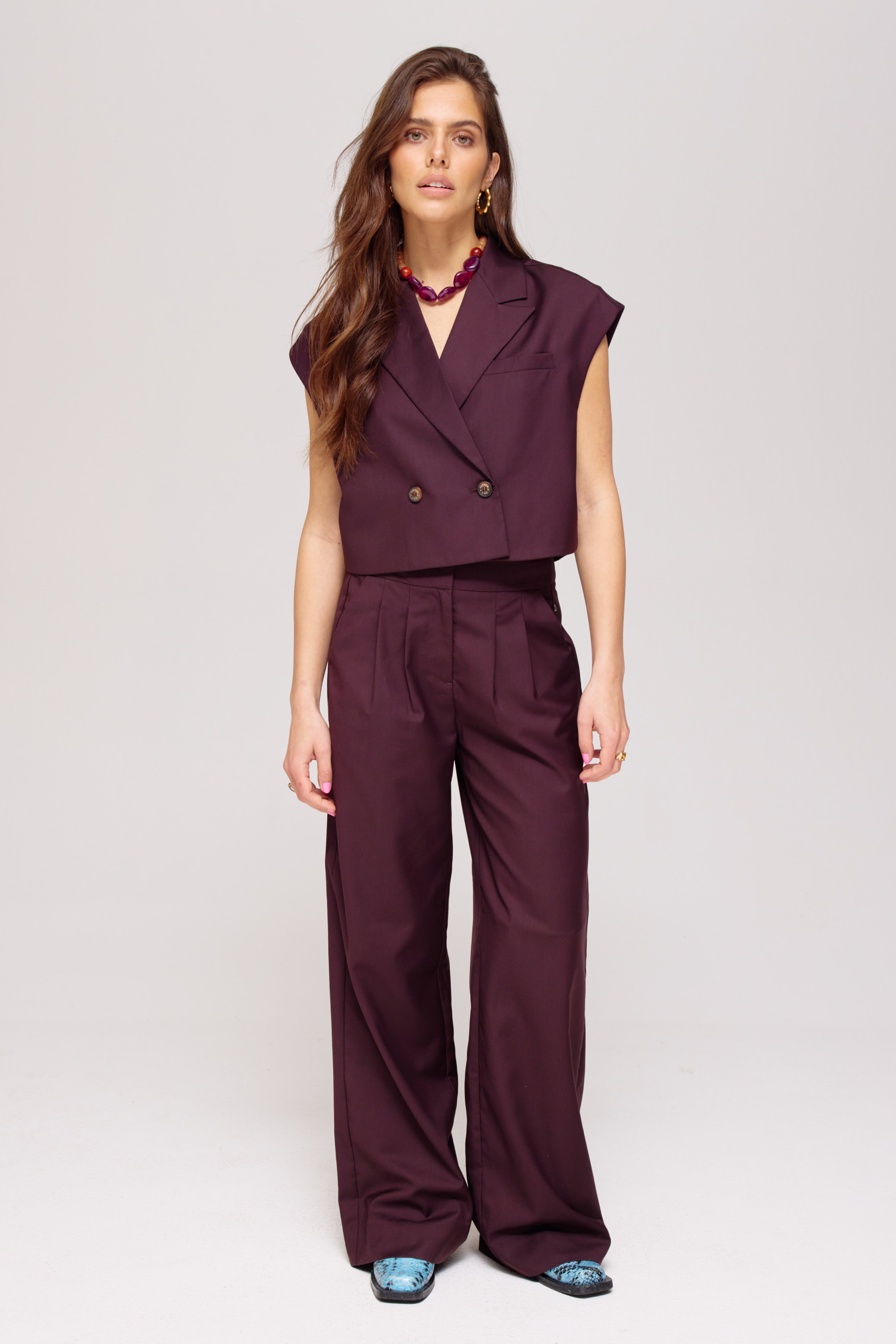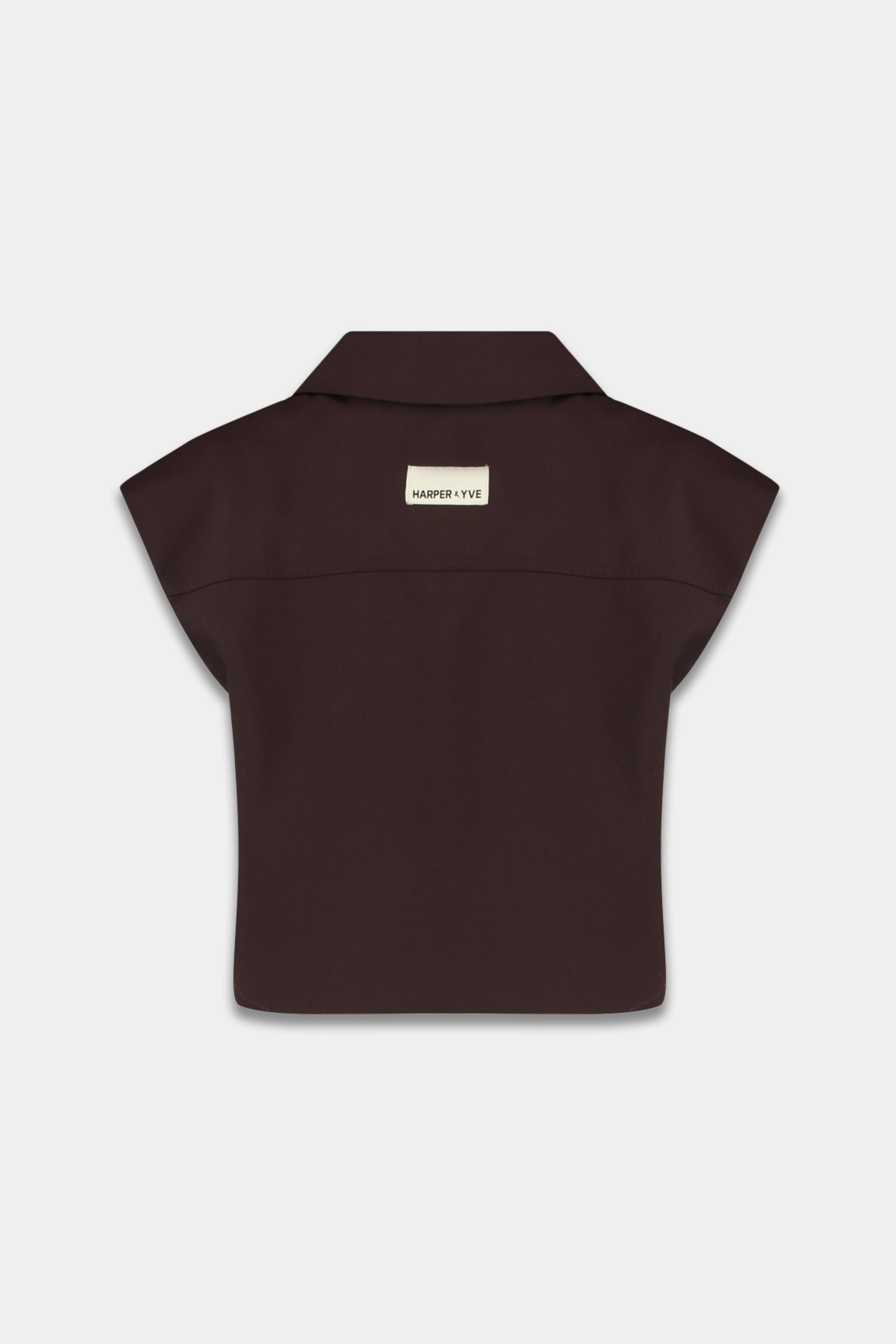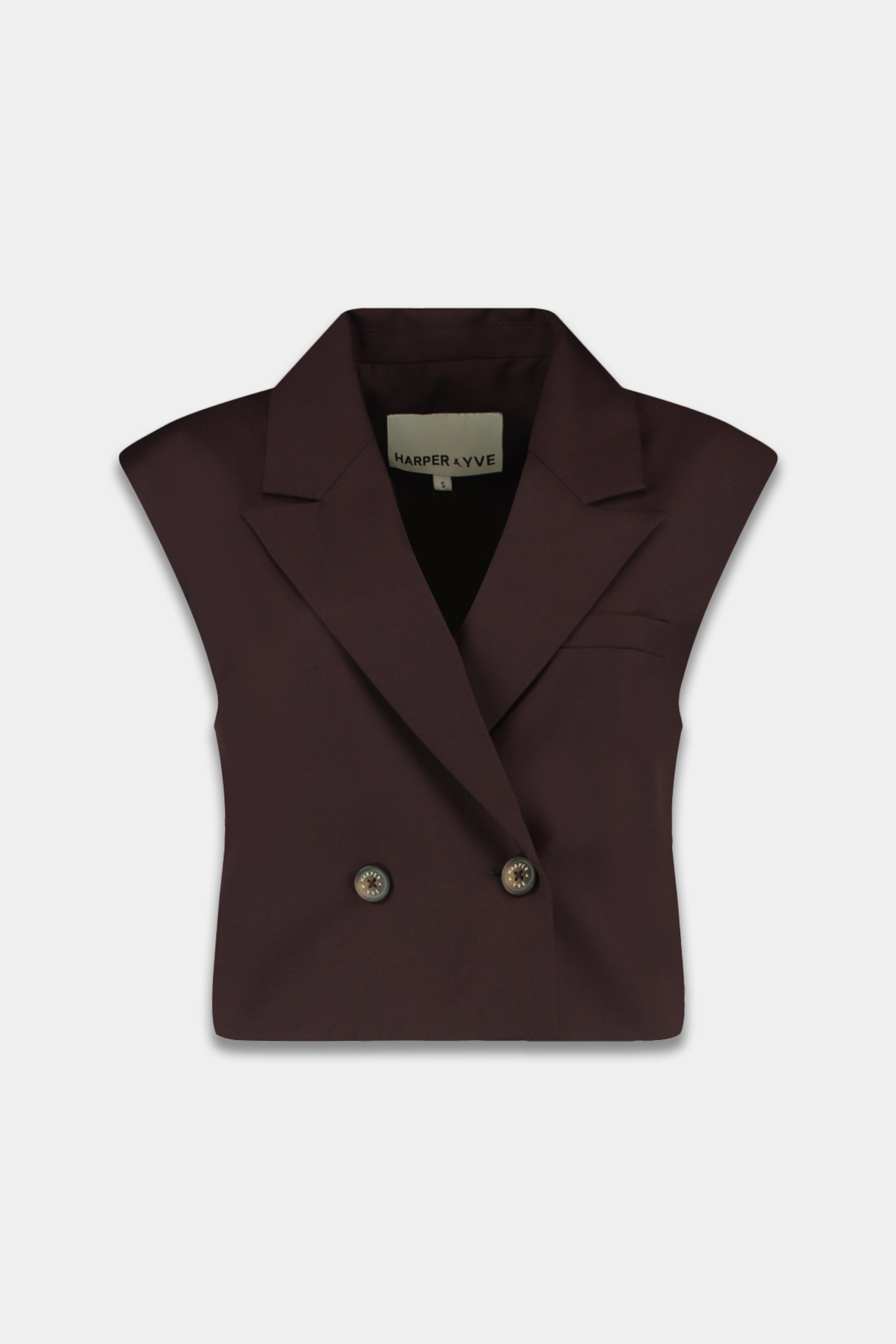 De Harper & Yve Gilet Esmee Dark Fudge is een mouwloos blazer-gilet in een rijke donkerbruine tint. De dubbele knoopsluiting en scherpe revers zorgen voor een vrouwelijke powerlook met een moderne twist.