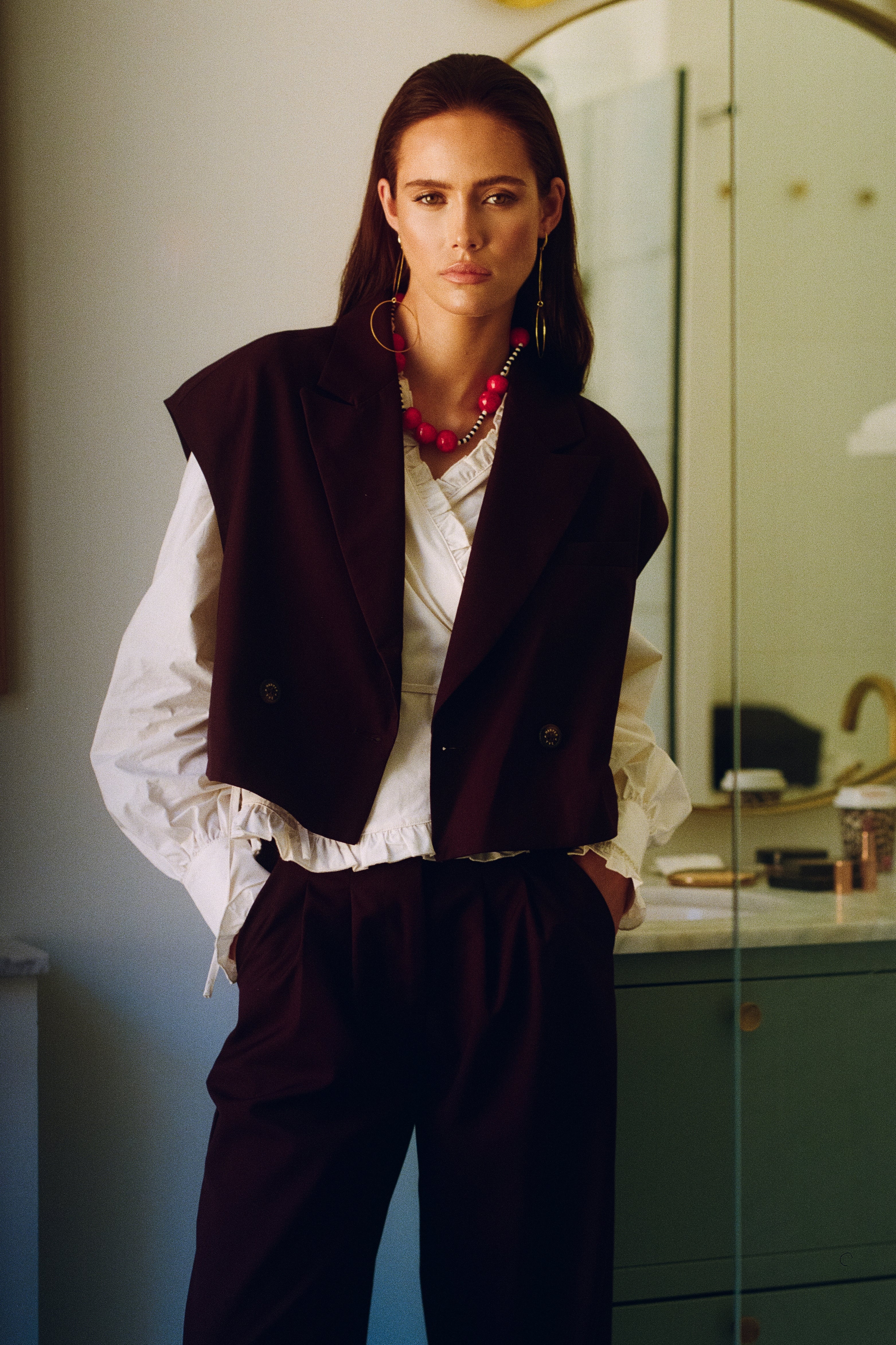 De Harper & Yve Gilet Esmee Dark Fudge is een mouwloos blazer-gilet in een rijke donkerbruine tint. De dubbele knoopsluiting en scherpe revers zorgen voor een vrouwelijke powerlook met een moderne twist.