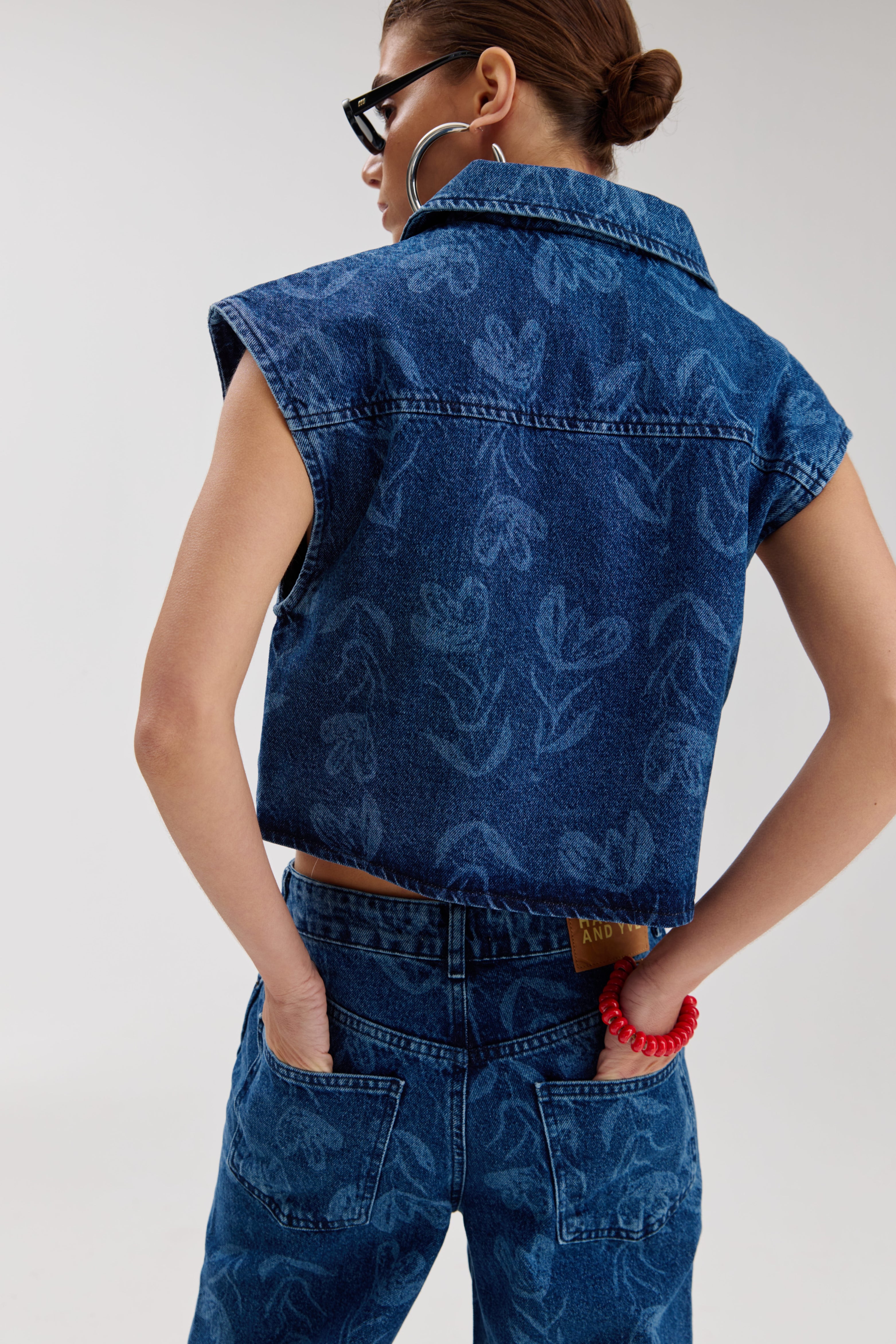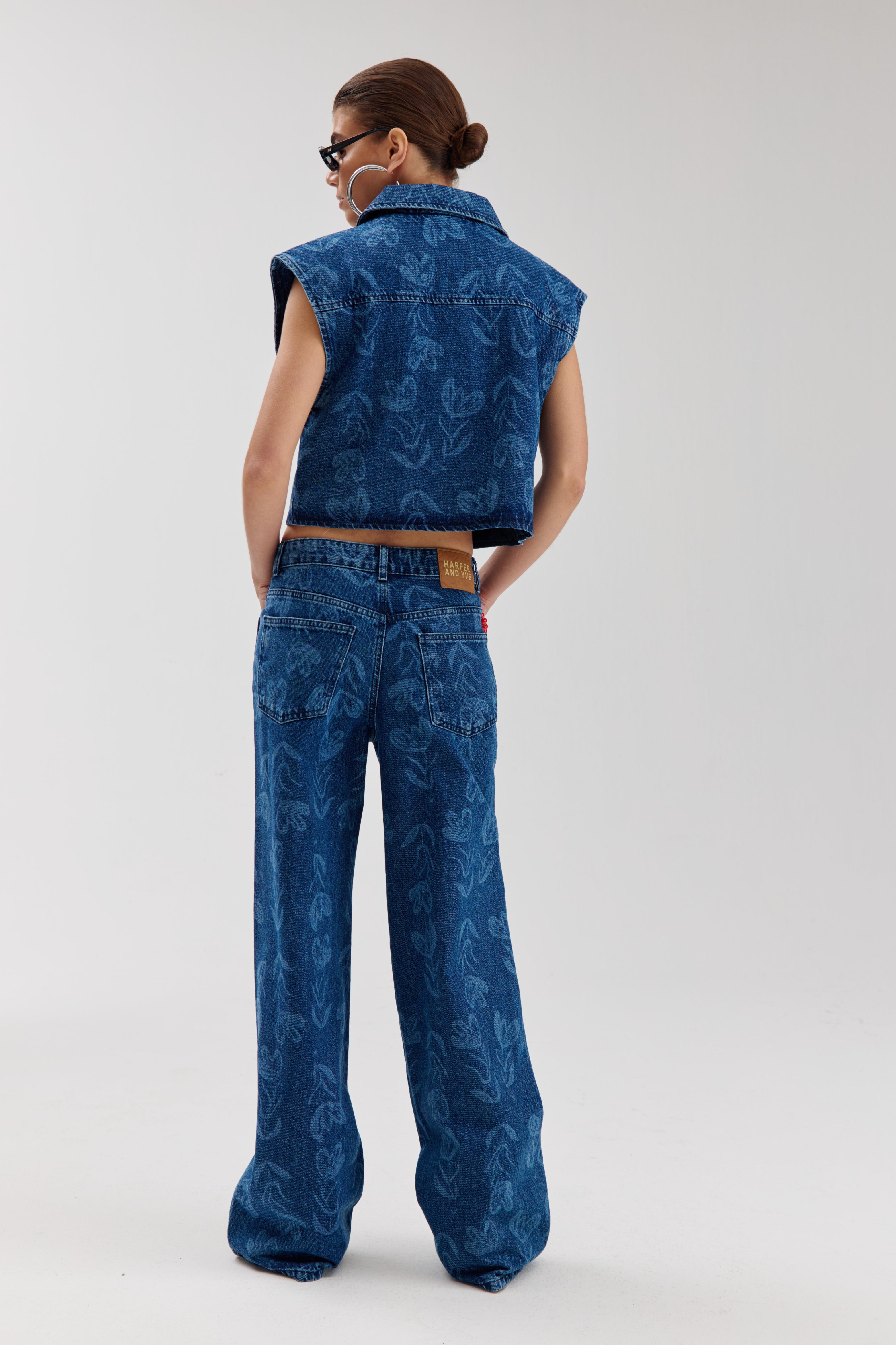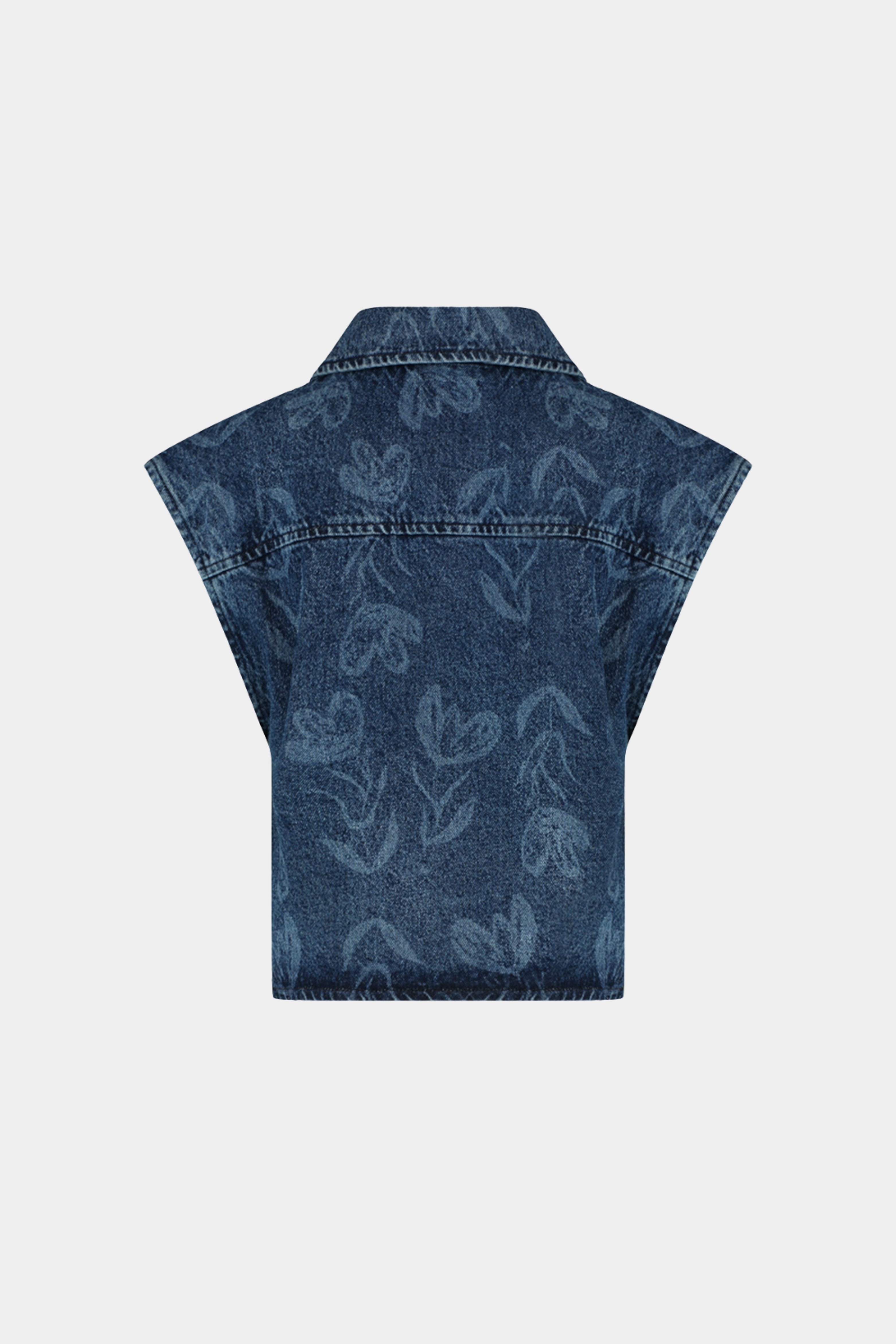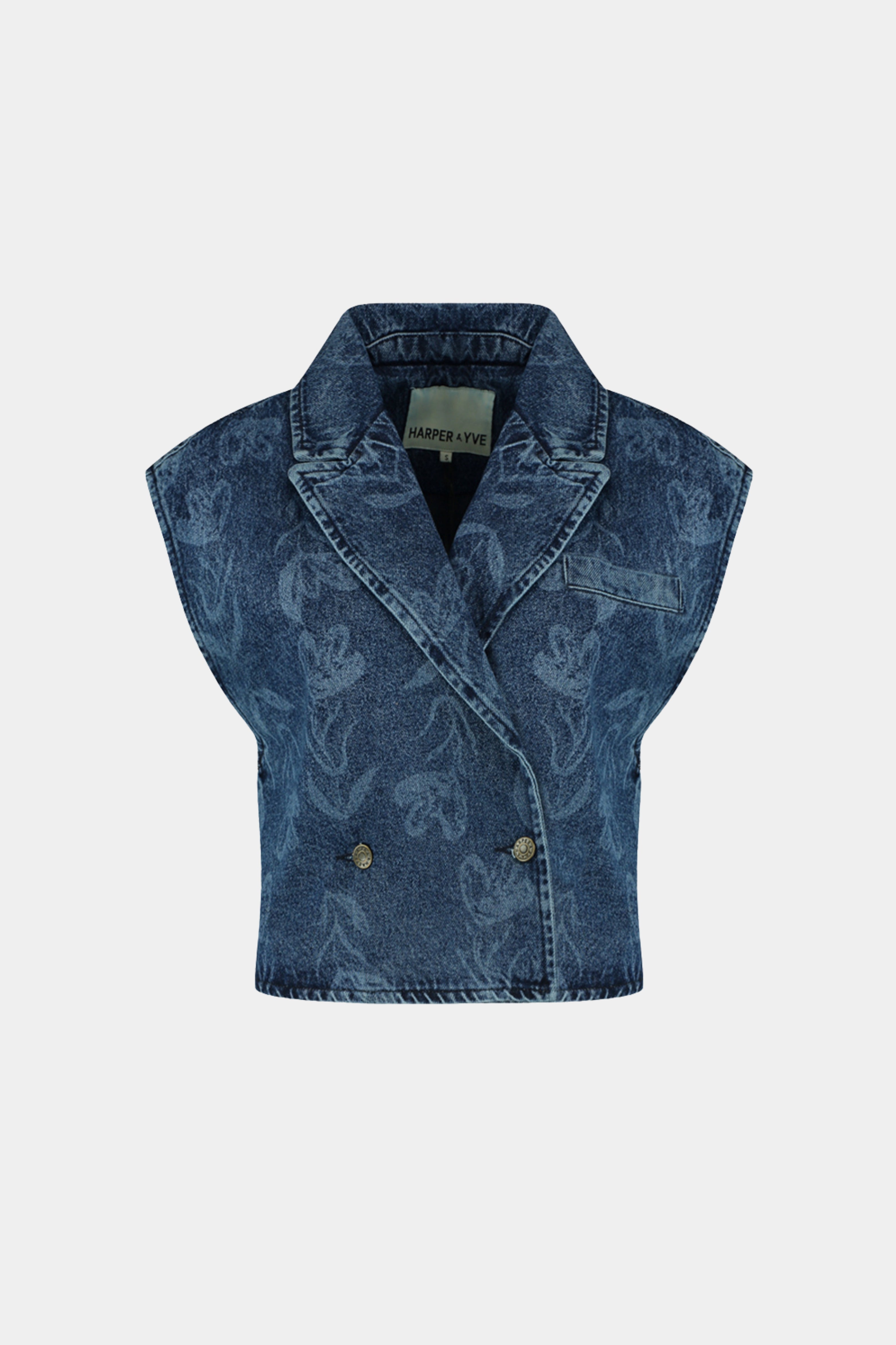 De Gilet Esmee Mid Blue van Harper & Yve is een stijlvolle denim gilet in middenblauw met subtiele bloemenprint. De double-breasted voorkant en de verbrede shoulders geven een moderne, edgy look.