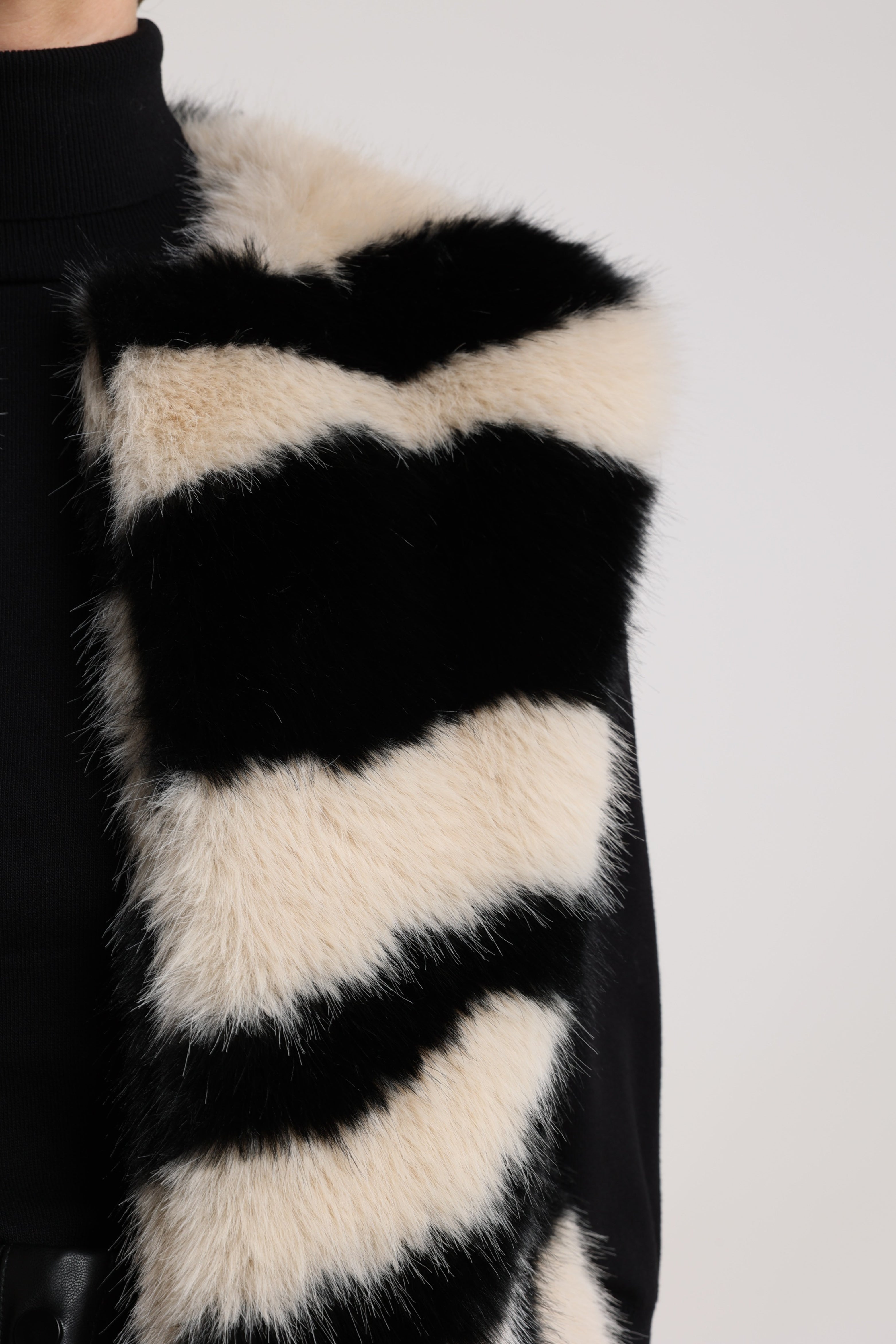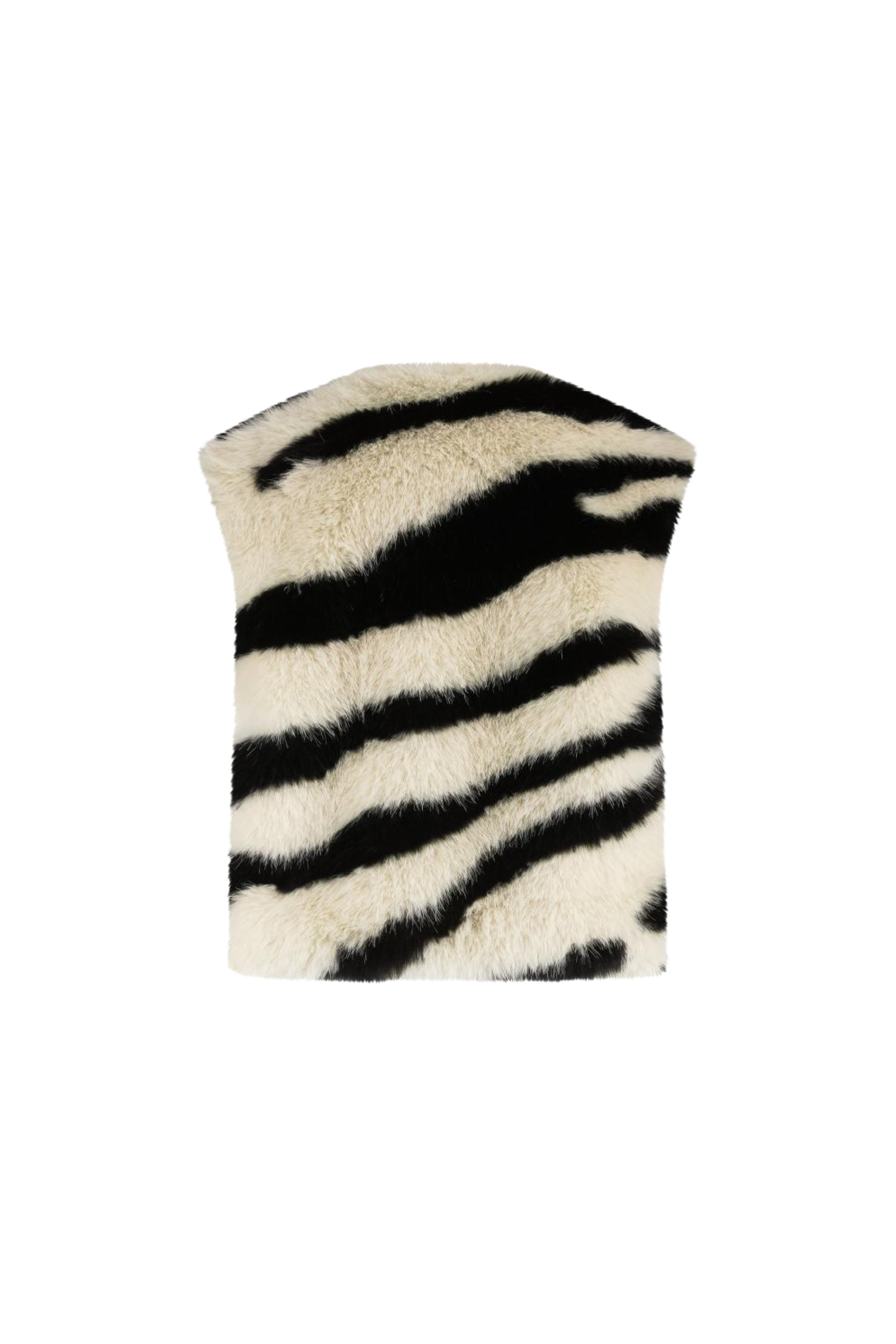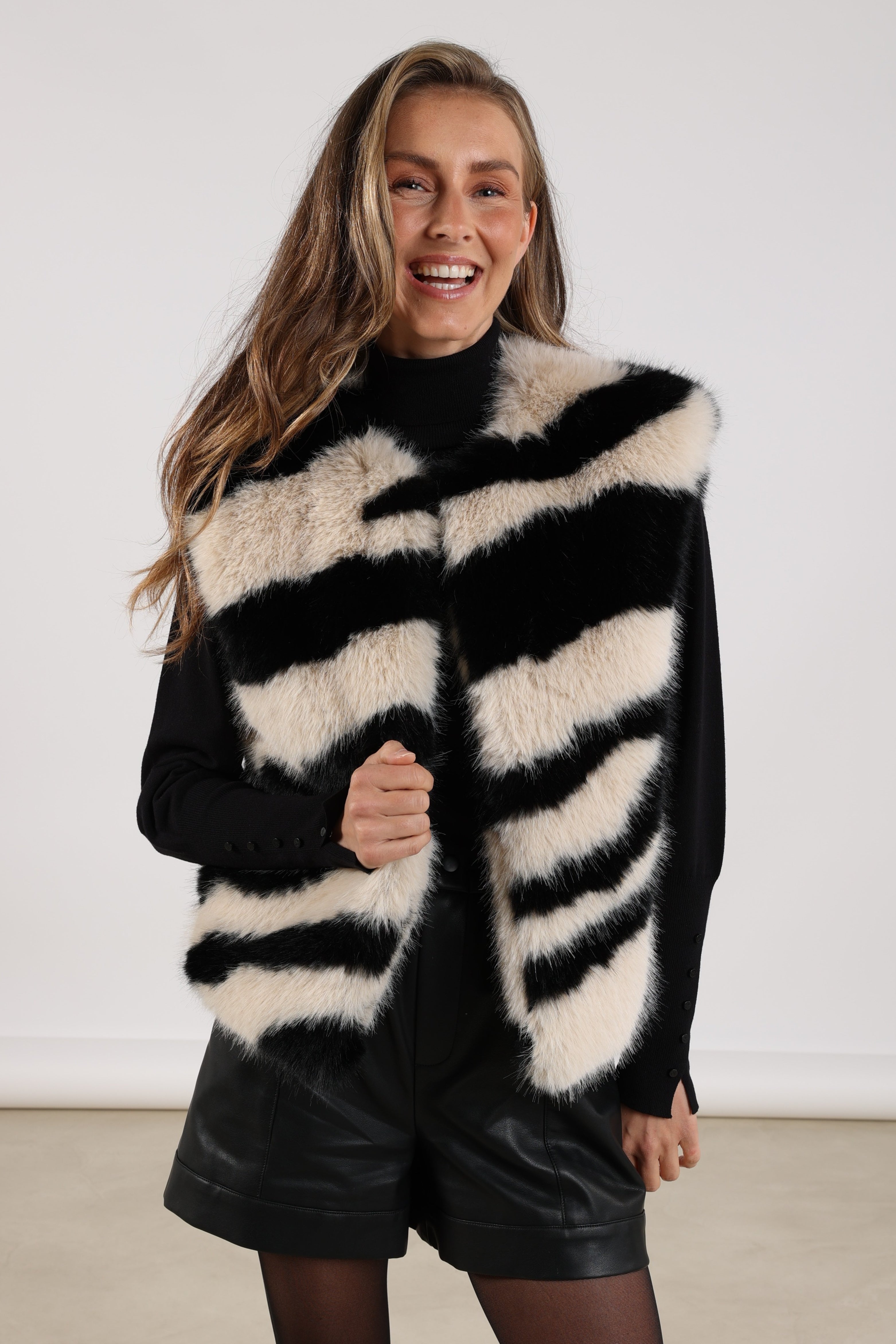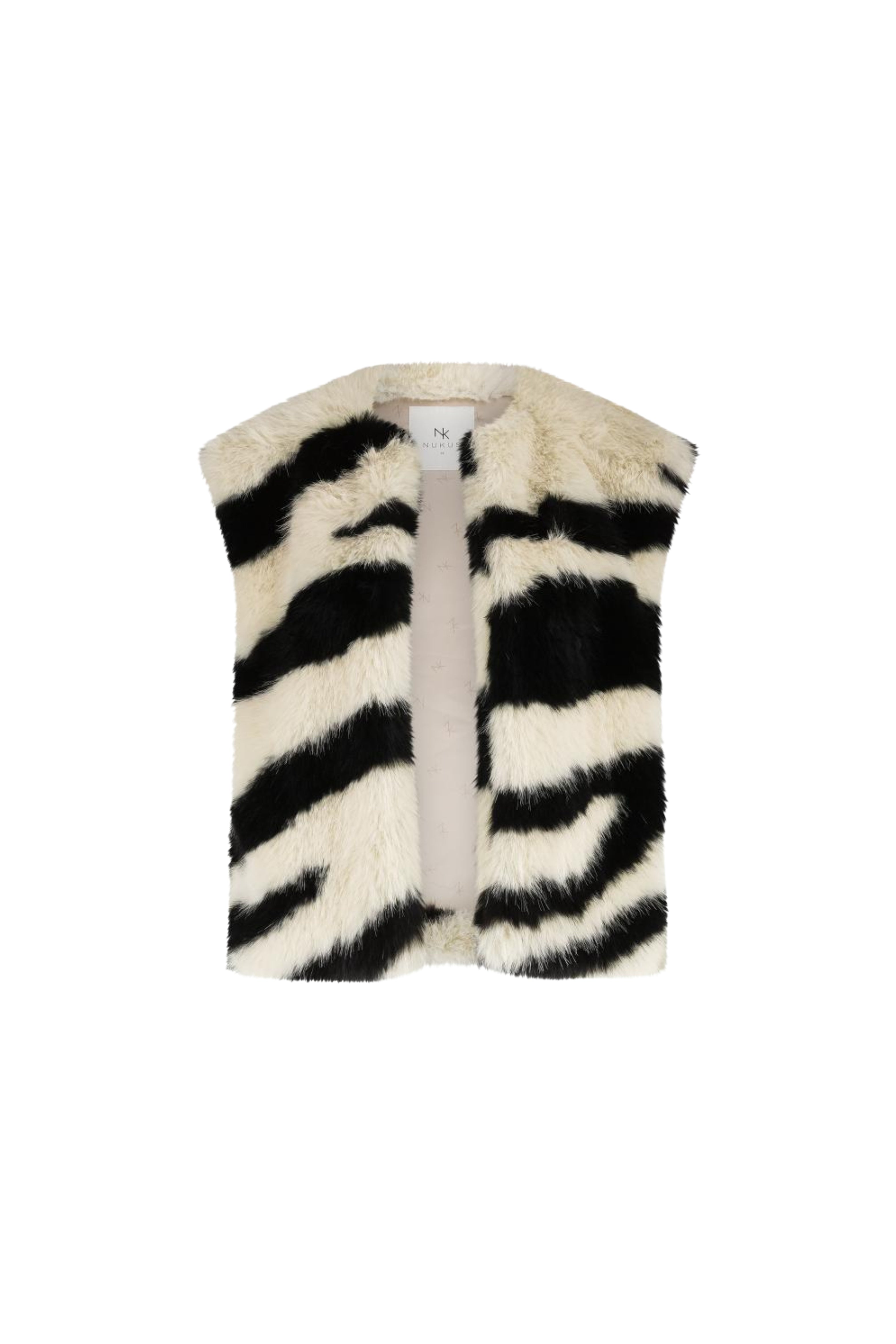 Het Nukus Gilet Fally Sand Black is een opvallend faux-fur gilet met zwart-wit zebraprint. Heerlijk zacht en stijlvol, ideaal om elke outfit een modieuze en luxueuze uitstraling te geven.