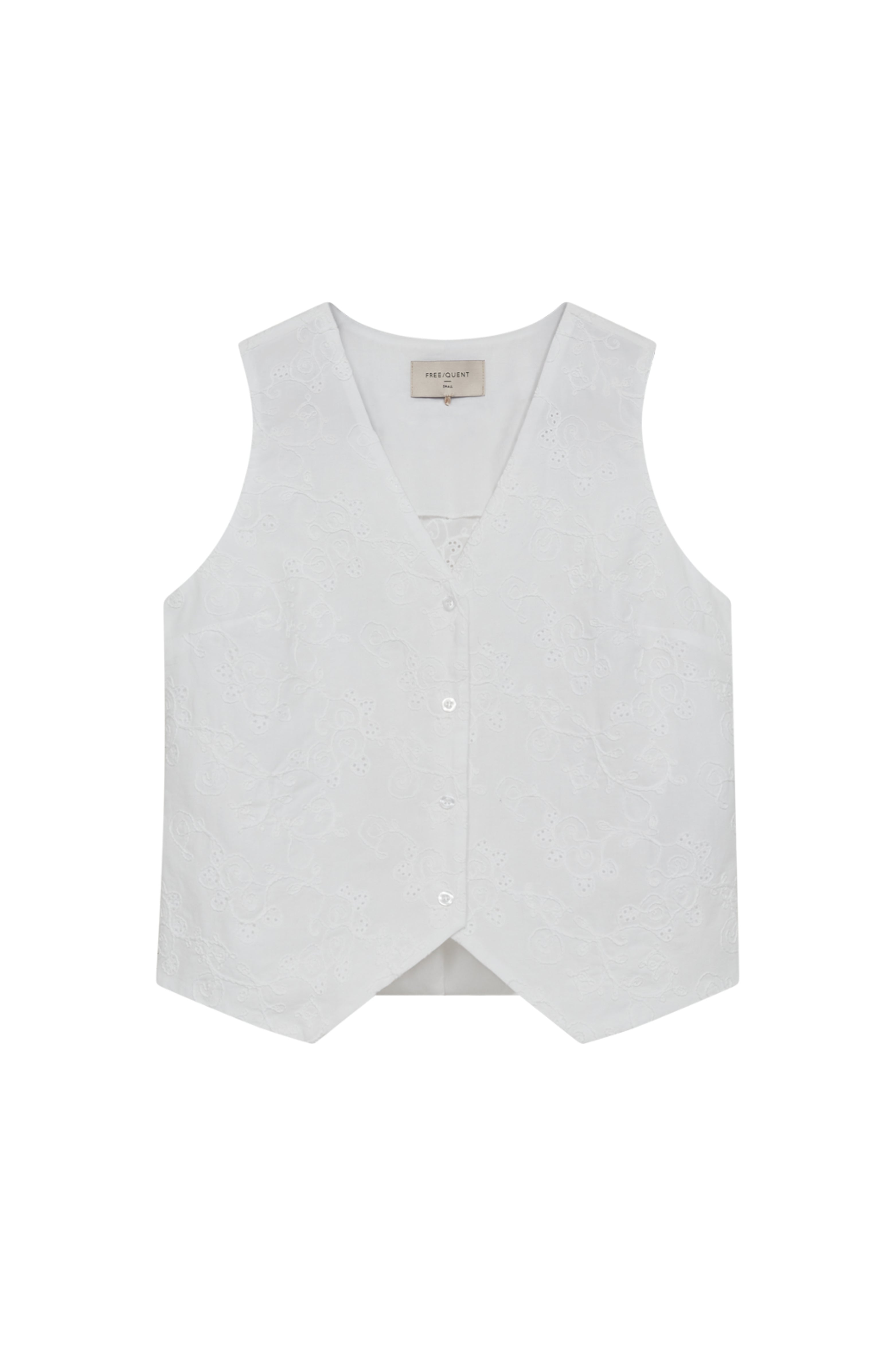 De Gilet Fquniqua in Brilliant White van Freequent is een verfijnde mouwloze waistcoat met elegante broderie-details. Draag ‘m chic over een blouse of casual op een jeans voor een vrouwelijke touch. Tijdloos, stijlvol en verrassend veelzijdig!