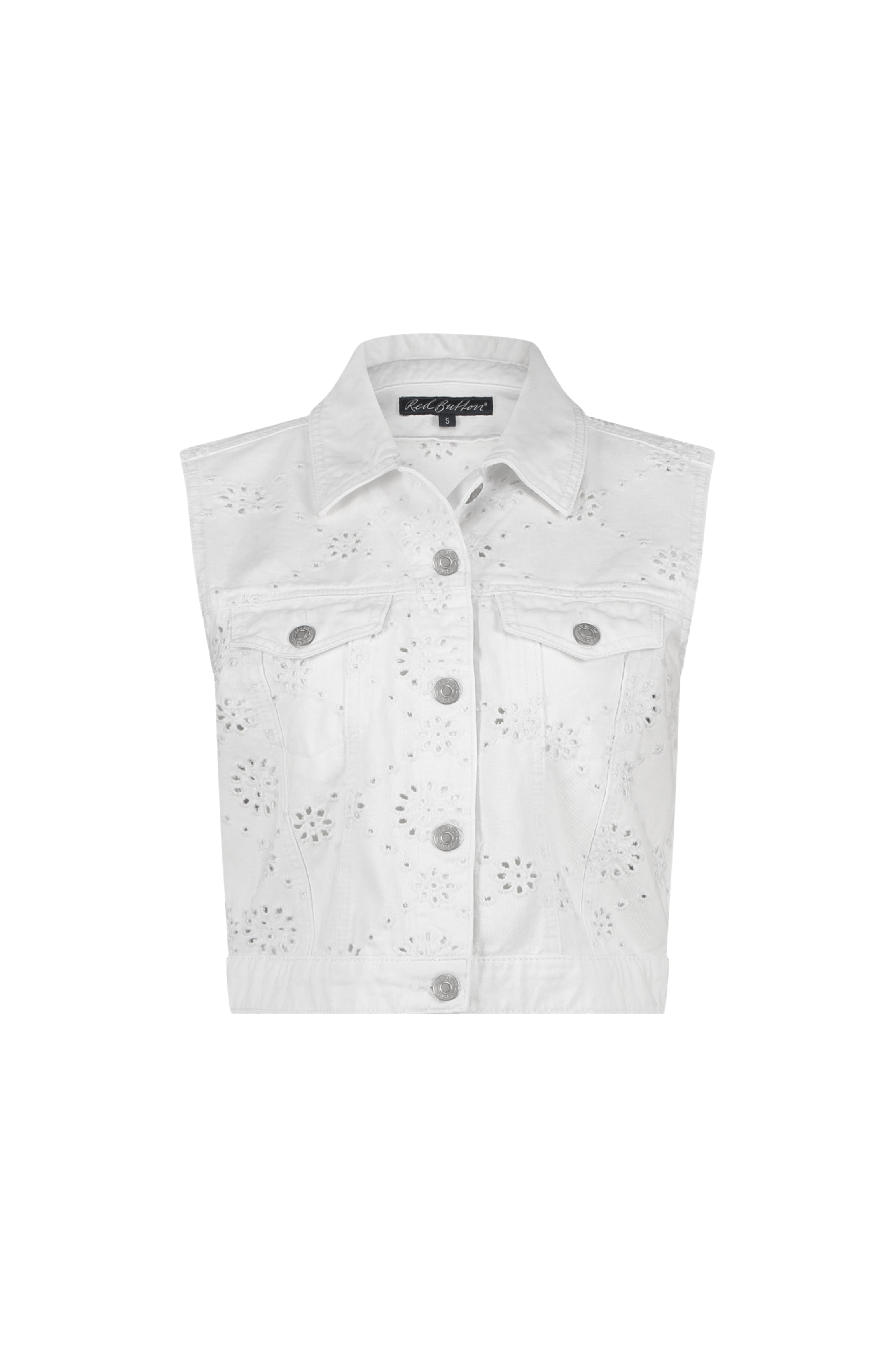 De Joekie Broderie White gilet van Red Button is een zomerse eyecatcher met verfijnde broderie details. Deze mouwloze denim-look bodywarmer geeft elke outfit een romantische en stoere twist.