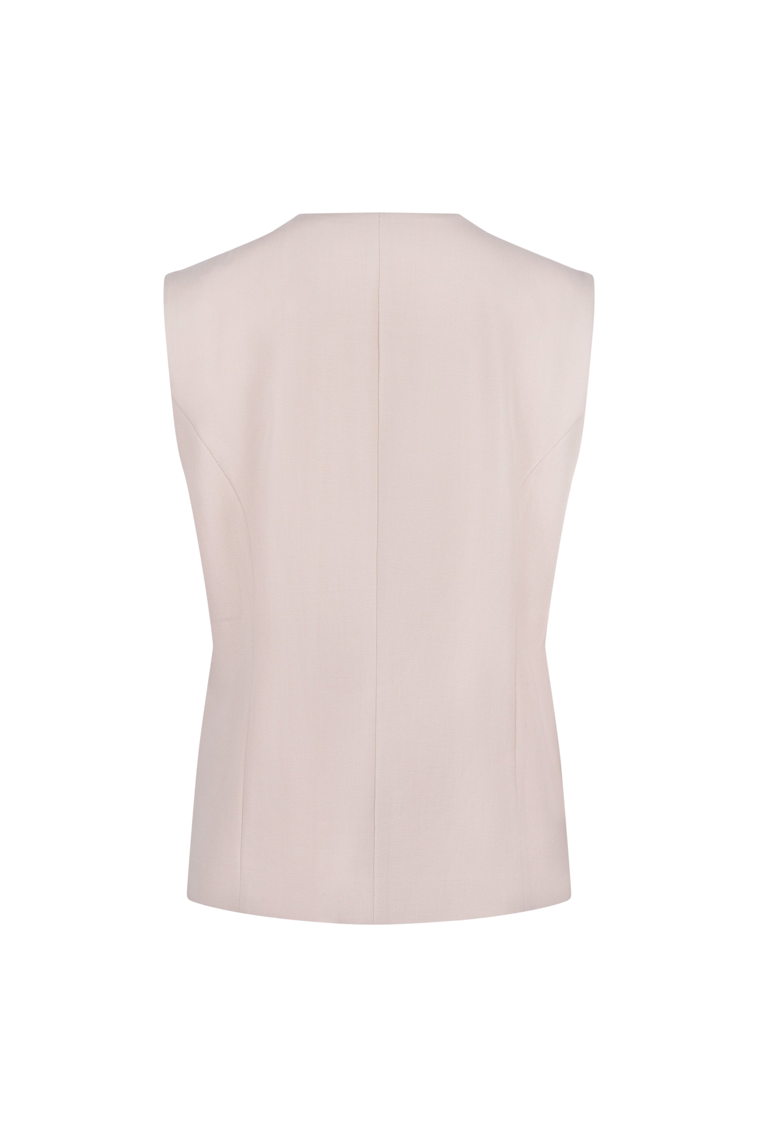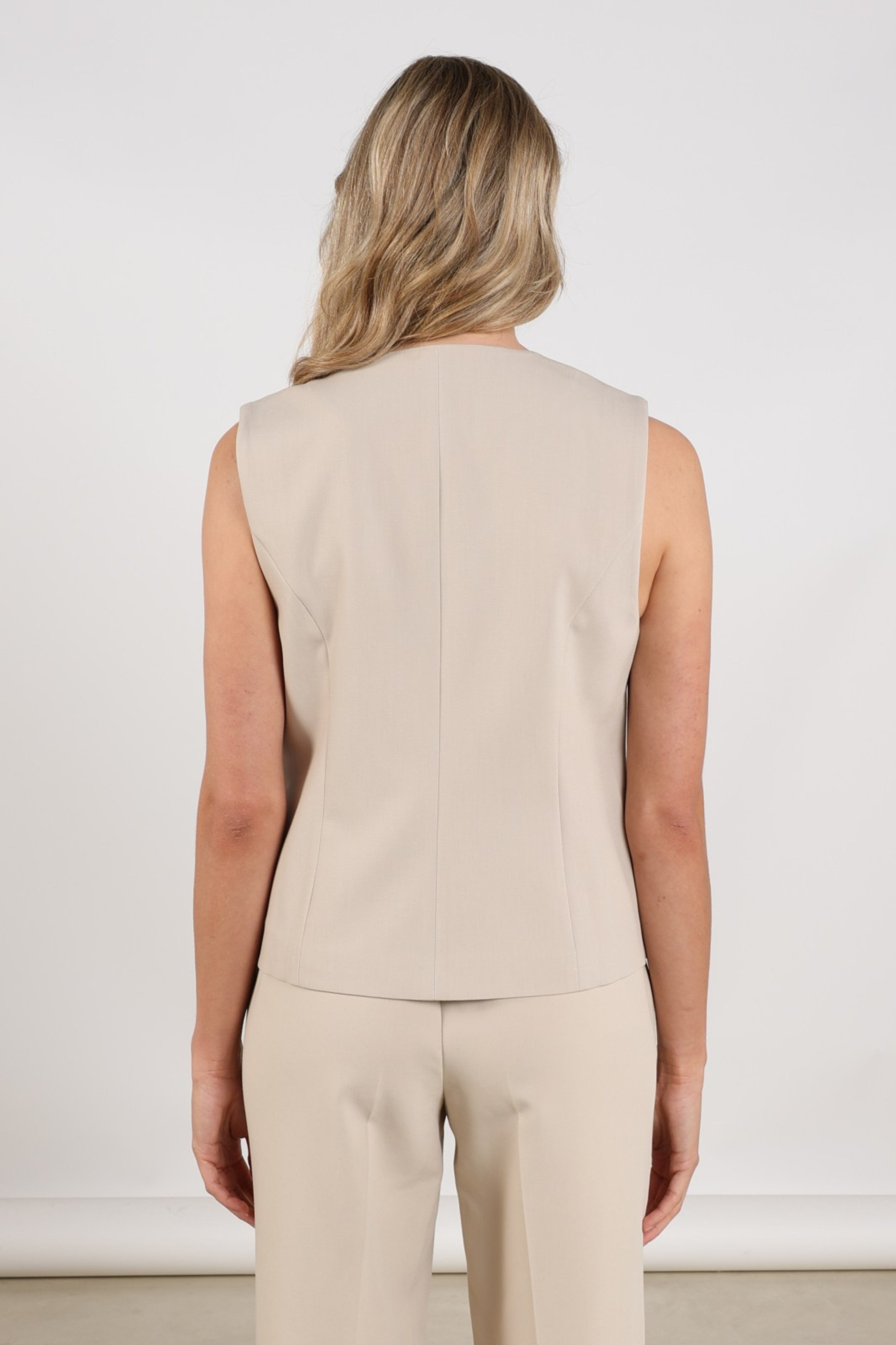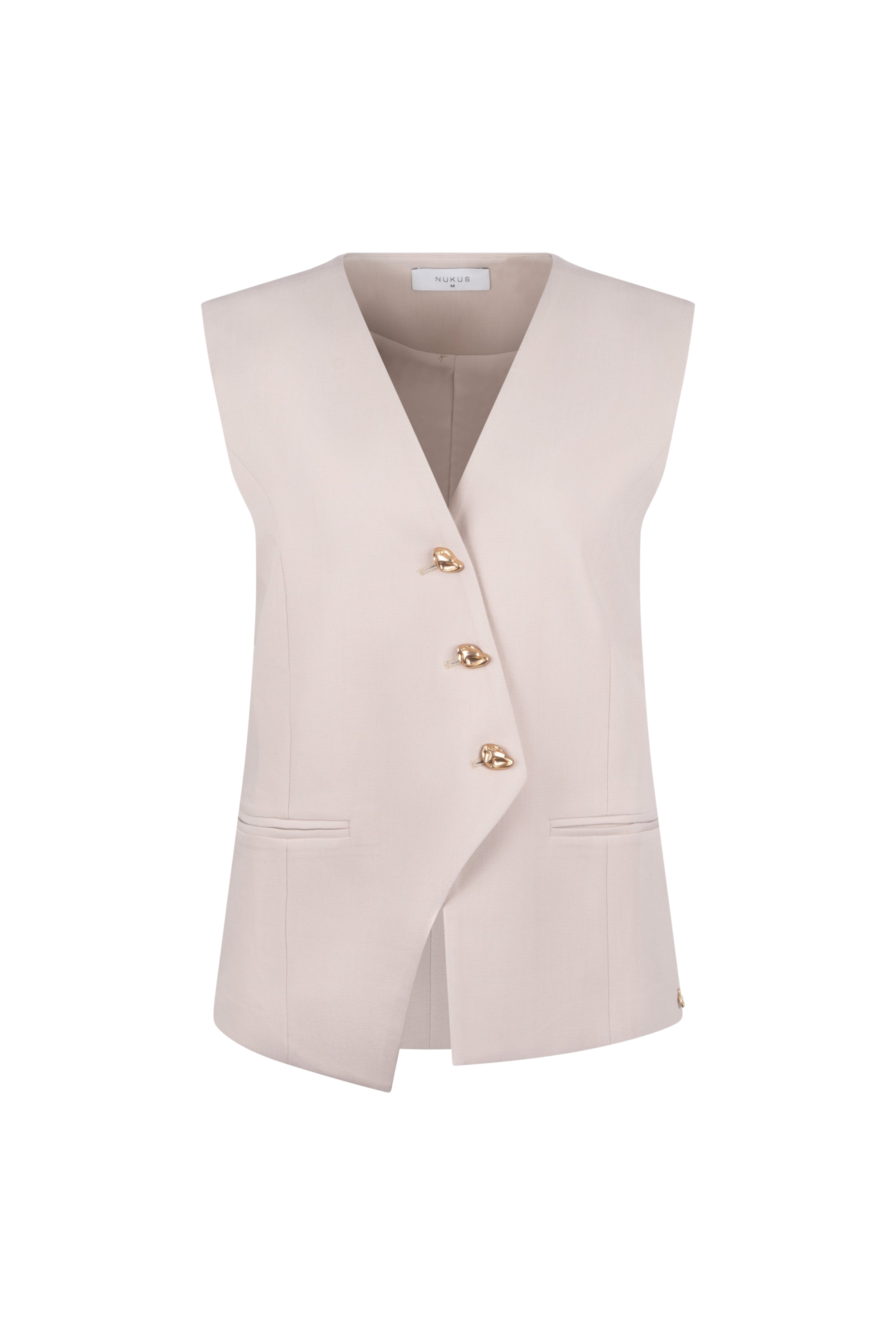 De Gilet Julia Sand van Nukus is een elegante gilet met V-hals. De getailleerde belijning en goudkleurige knopen geven een chique look. Perfect voor kantoor of een diner.