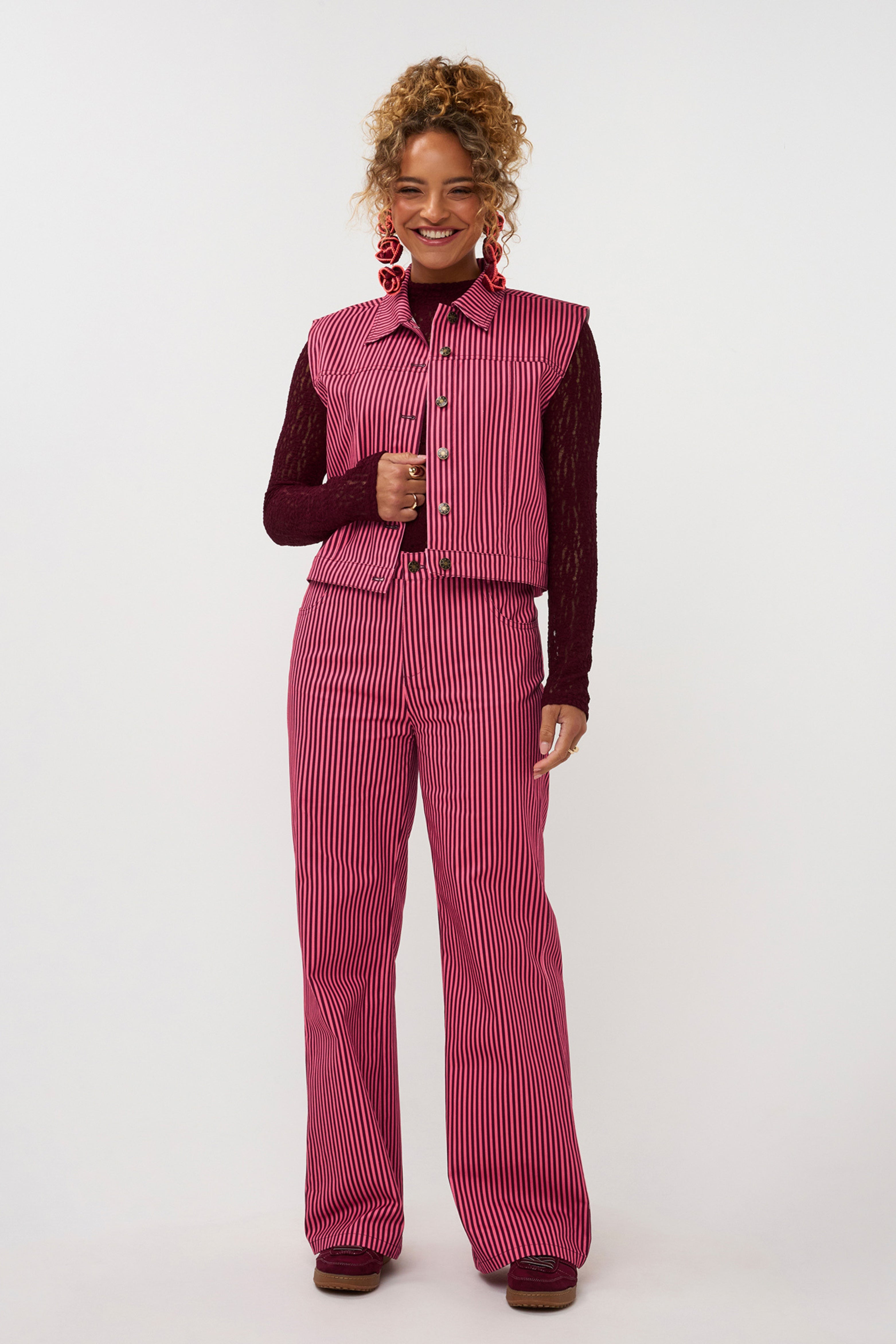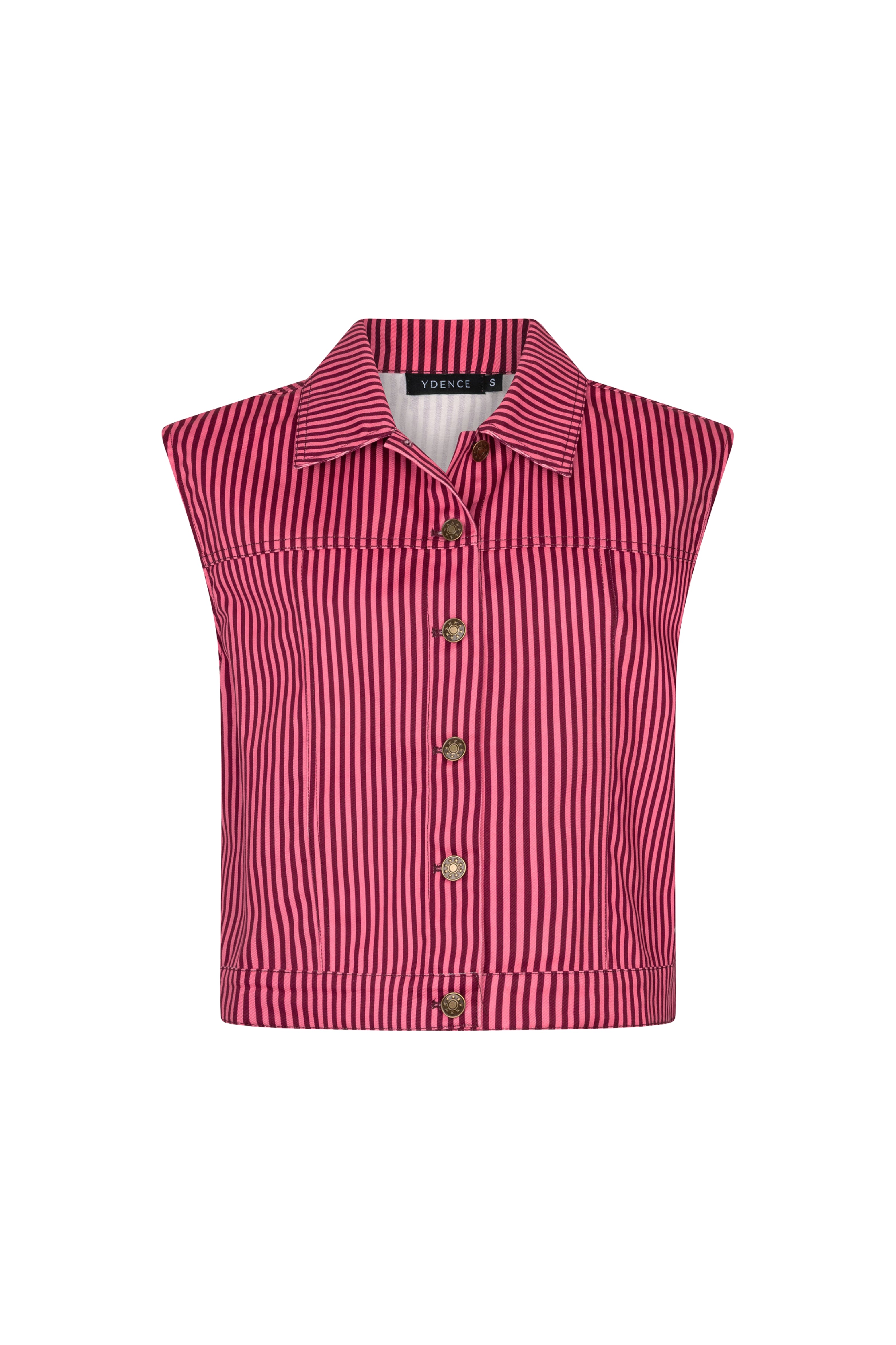 Gilet Marit Coral Pink Burgundy van Ydence is een mouwloos gilet met een speelse streepprint en goudkleurige knopen. Het korte model maakt dit item perfect als co-ord set of los gestyled.