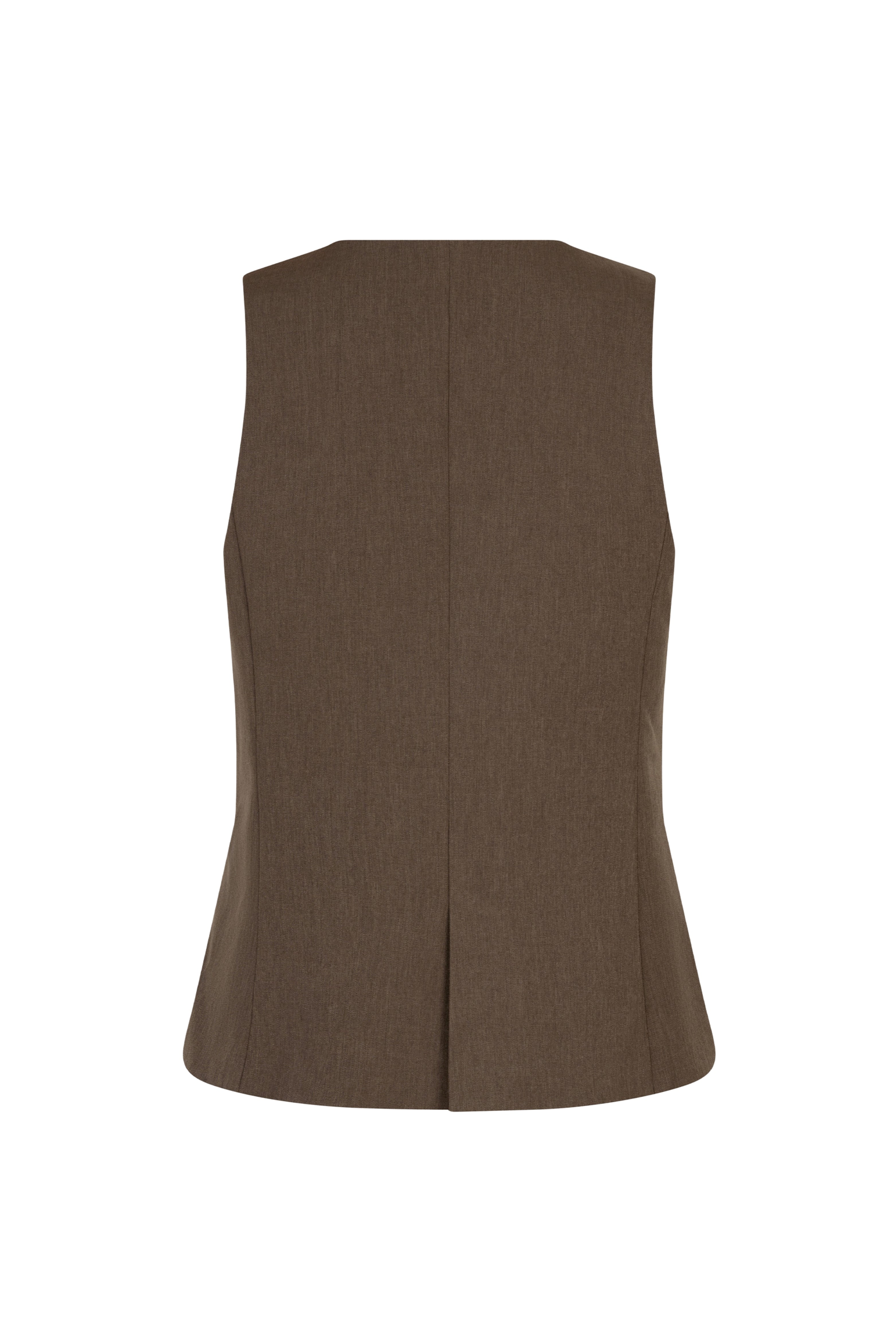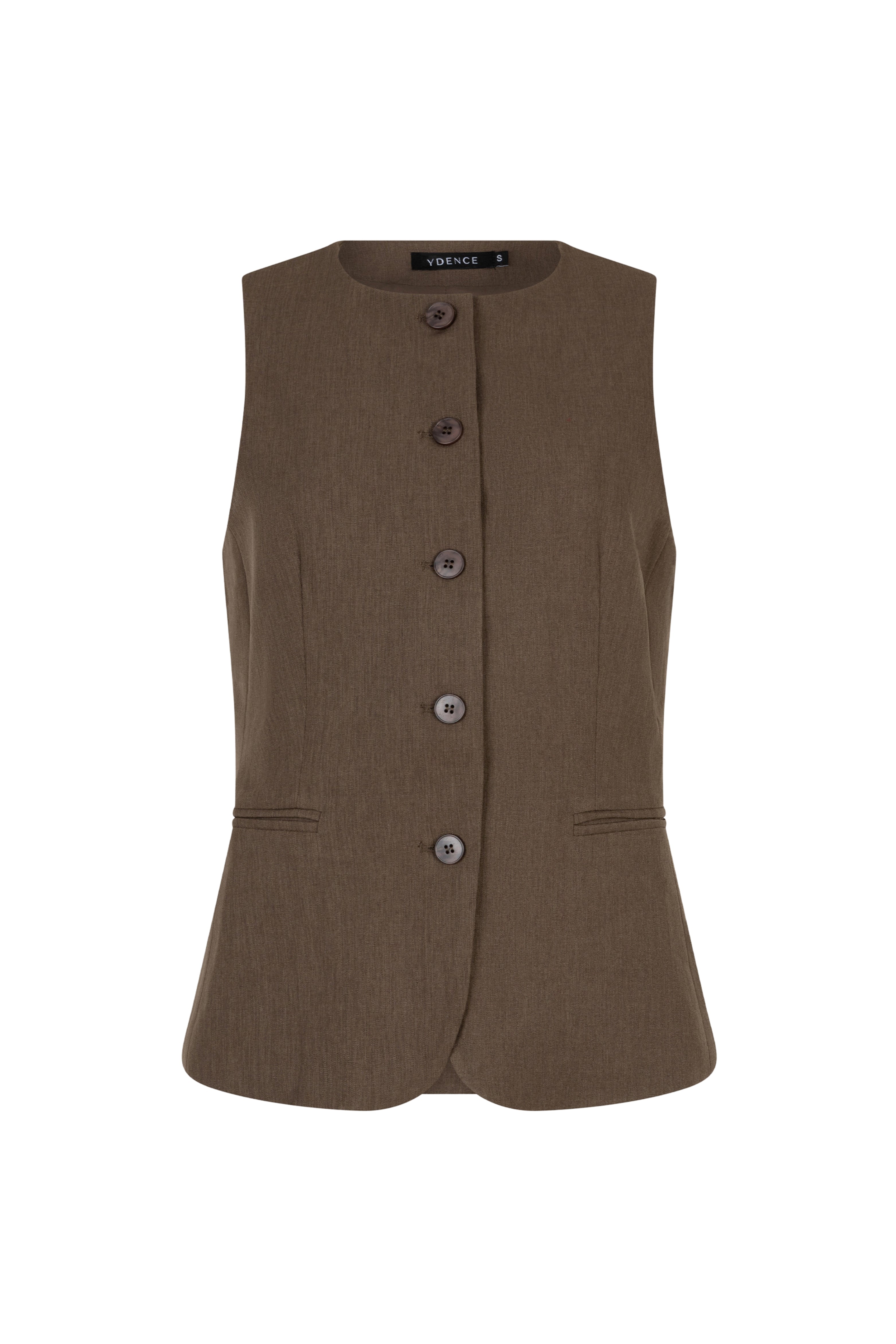 Het Gilet Mellie Mud van Ydence is een tijdloos, mouwloos gilet in een warme bruintint. Uitgevoerd met een ronde hals, knoopsluiting en twee sierzakken voor een klassieke uitstraling. Draag over een blouse of als onderdeel van een co-ord set.