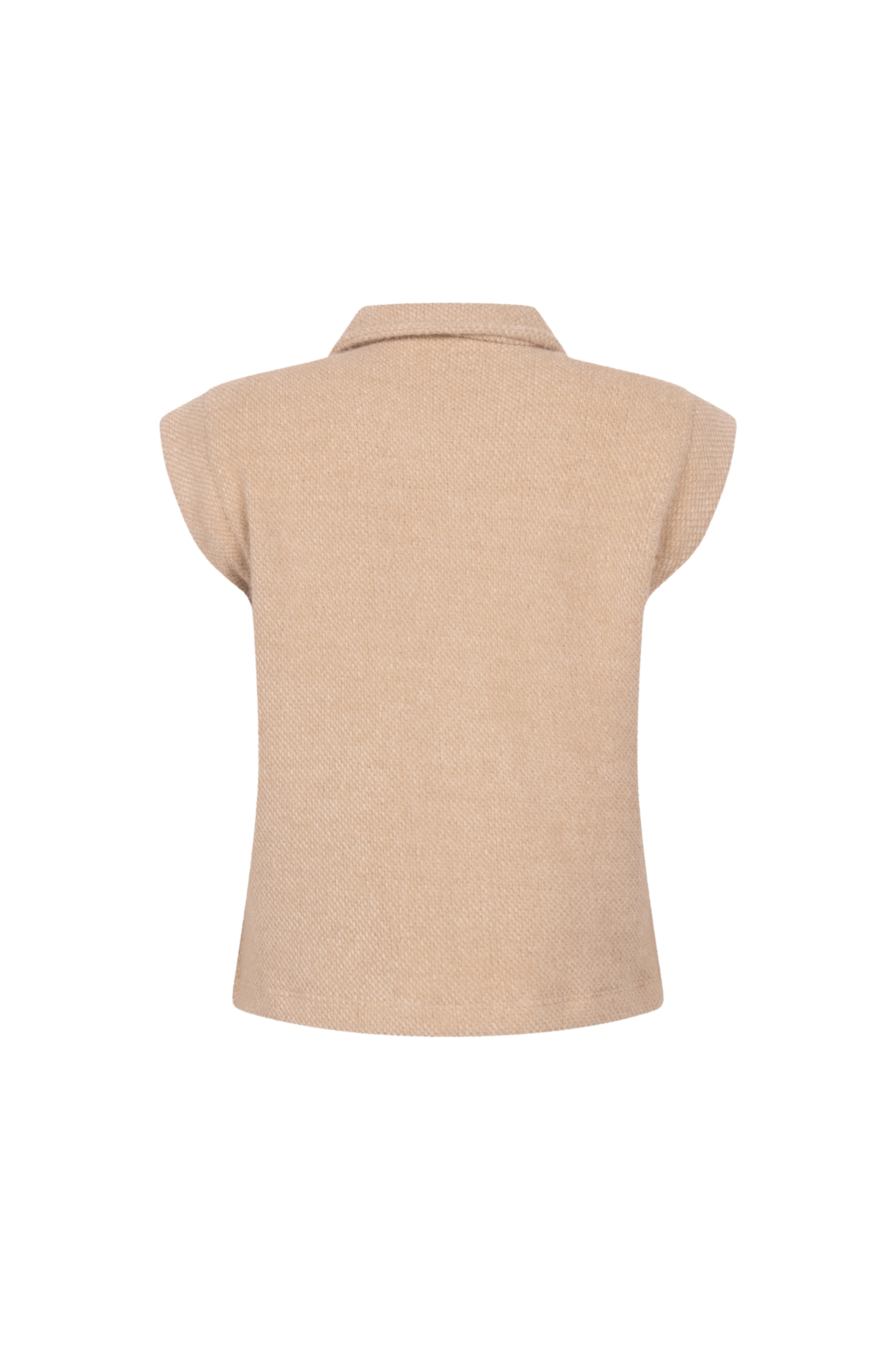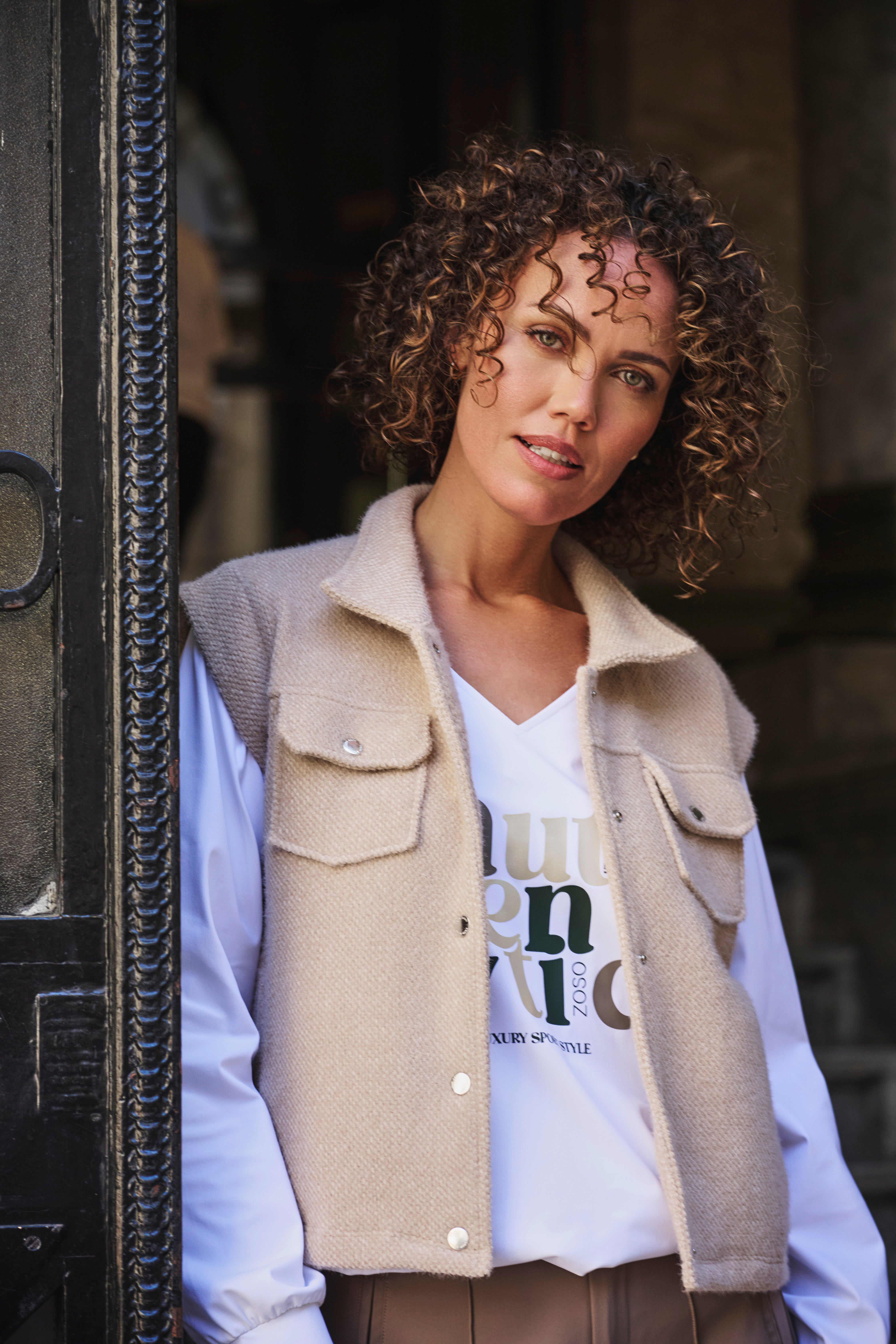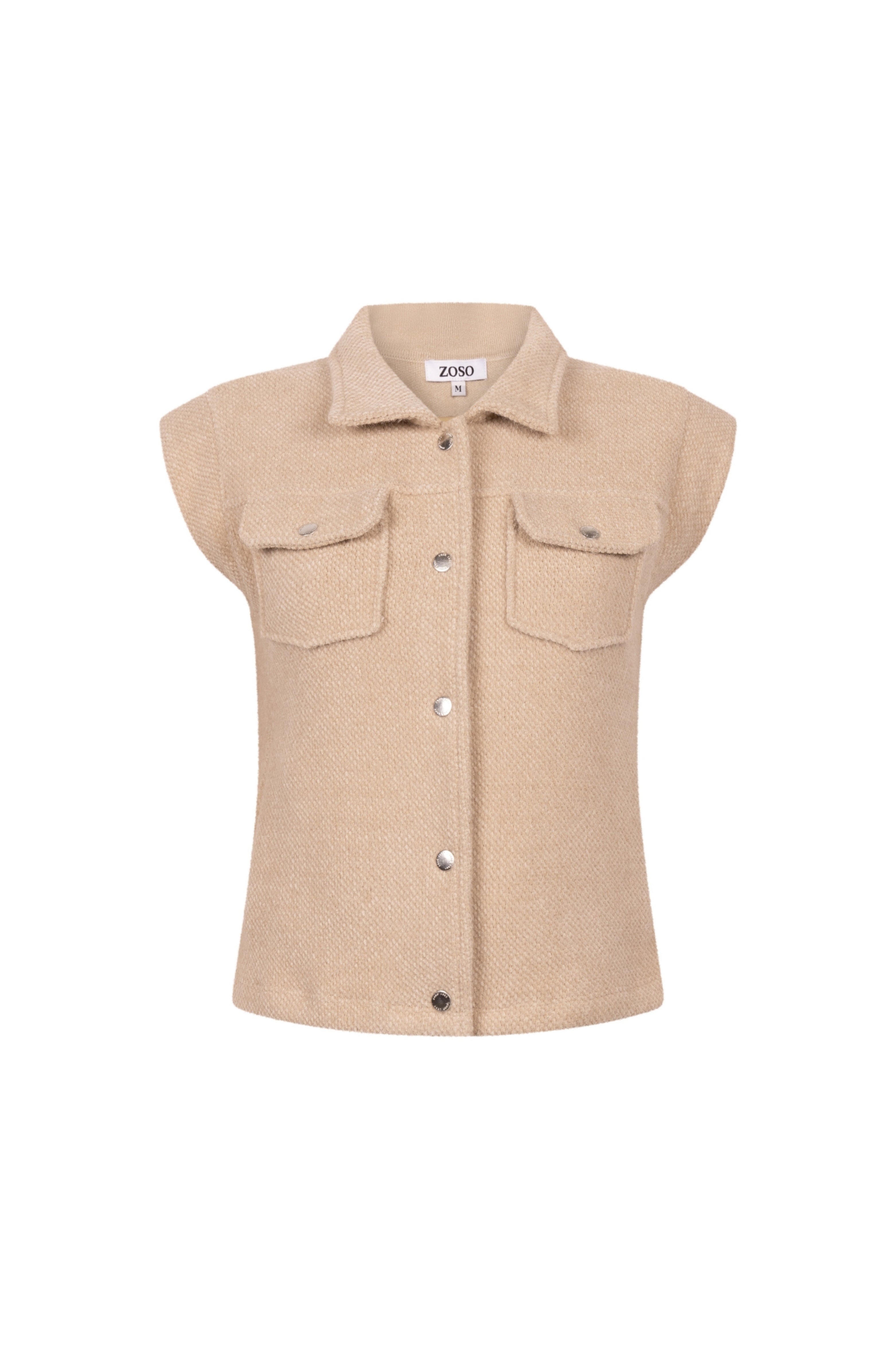 Het gilet Melrose Sand van Zoso is een stijlvolle layering piece met een zachte, warme textuur. Het mouwloze model heeft een klassieke kraag, drukknopen en twee klepzakken op de borst voor een stoere touch.