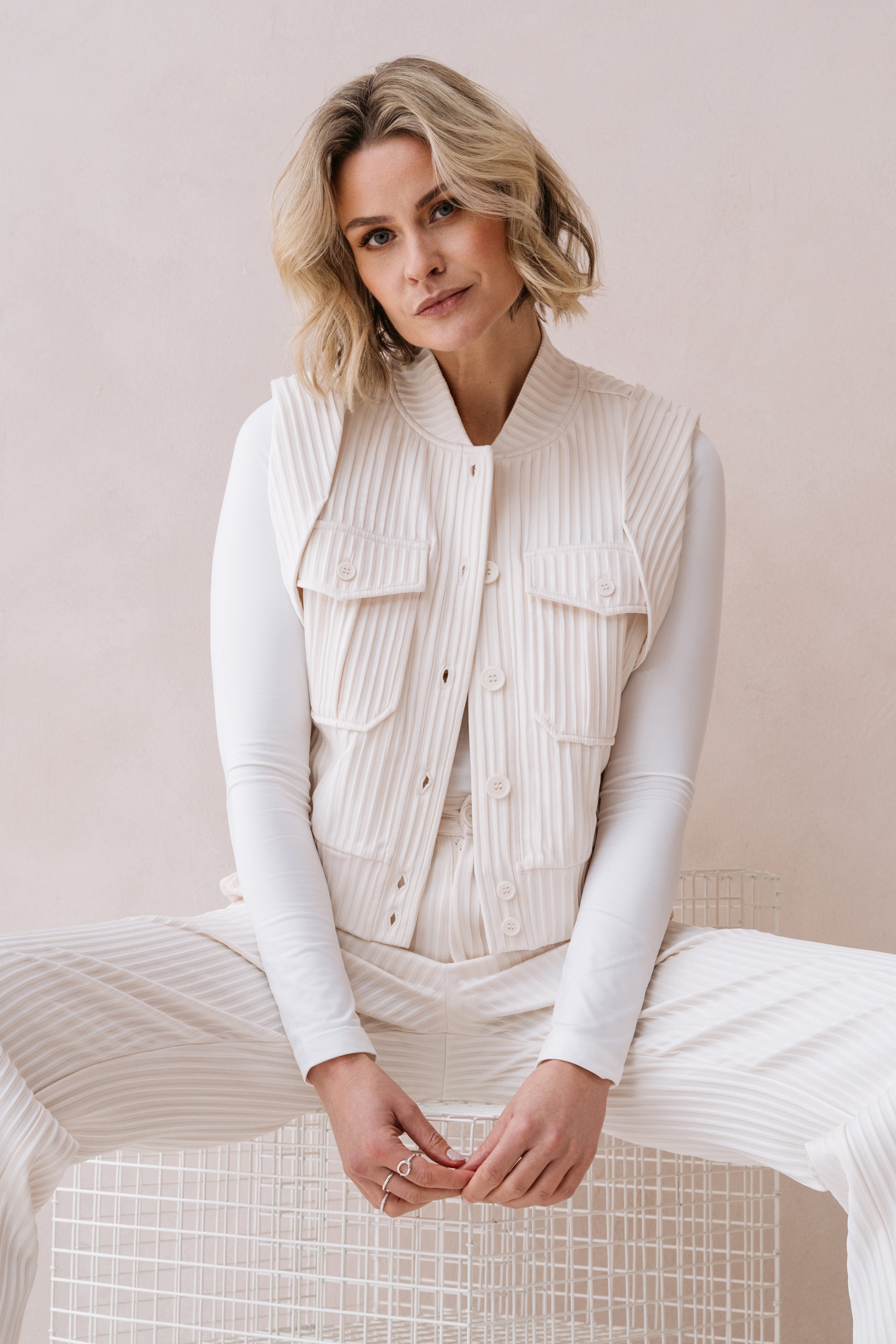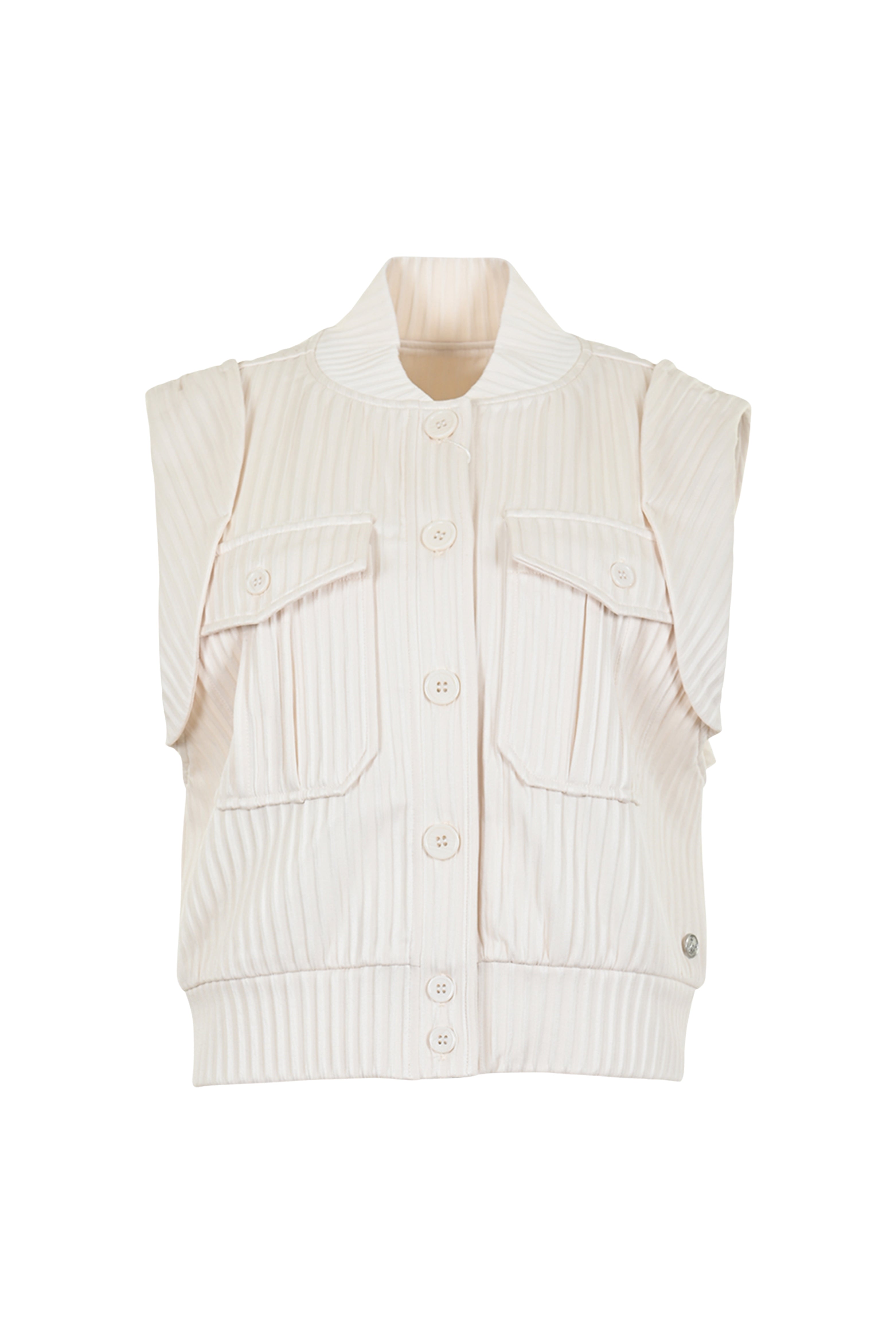 De Pera gilet van Maicazz is een stijlvolle mouwloze topper in een frisse offwhite kleur met ribstructuur. De klepzakken op de borst en de knoopsluiting geven een stoere twist aan deze vrouwelijke, comfortabele essential.